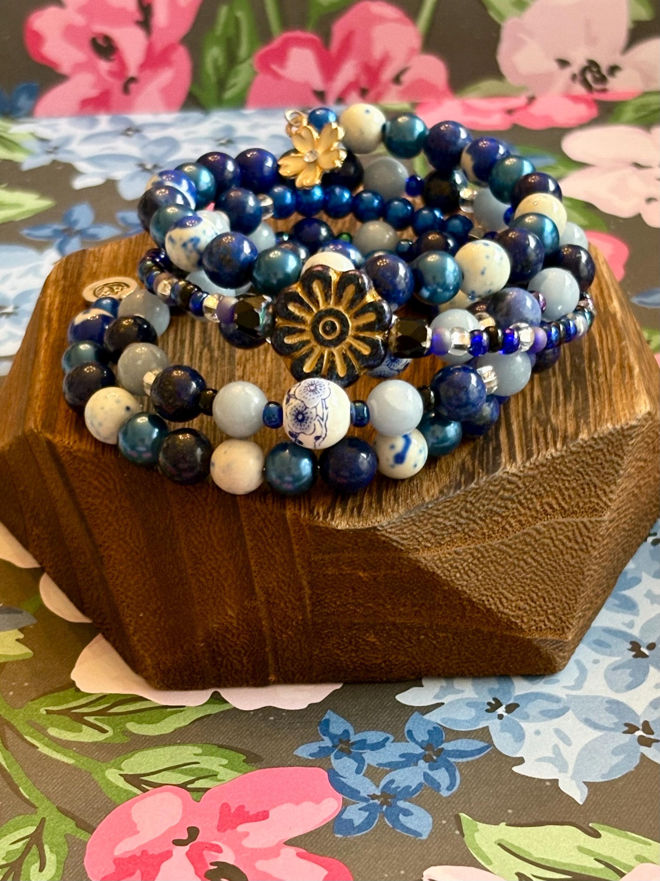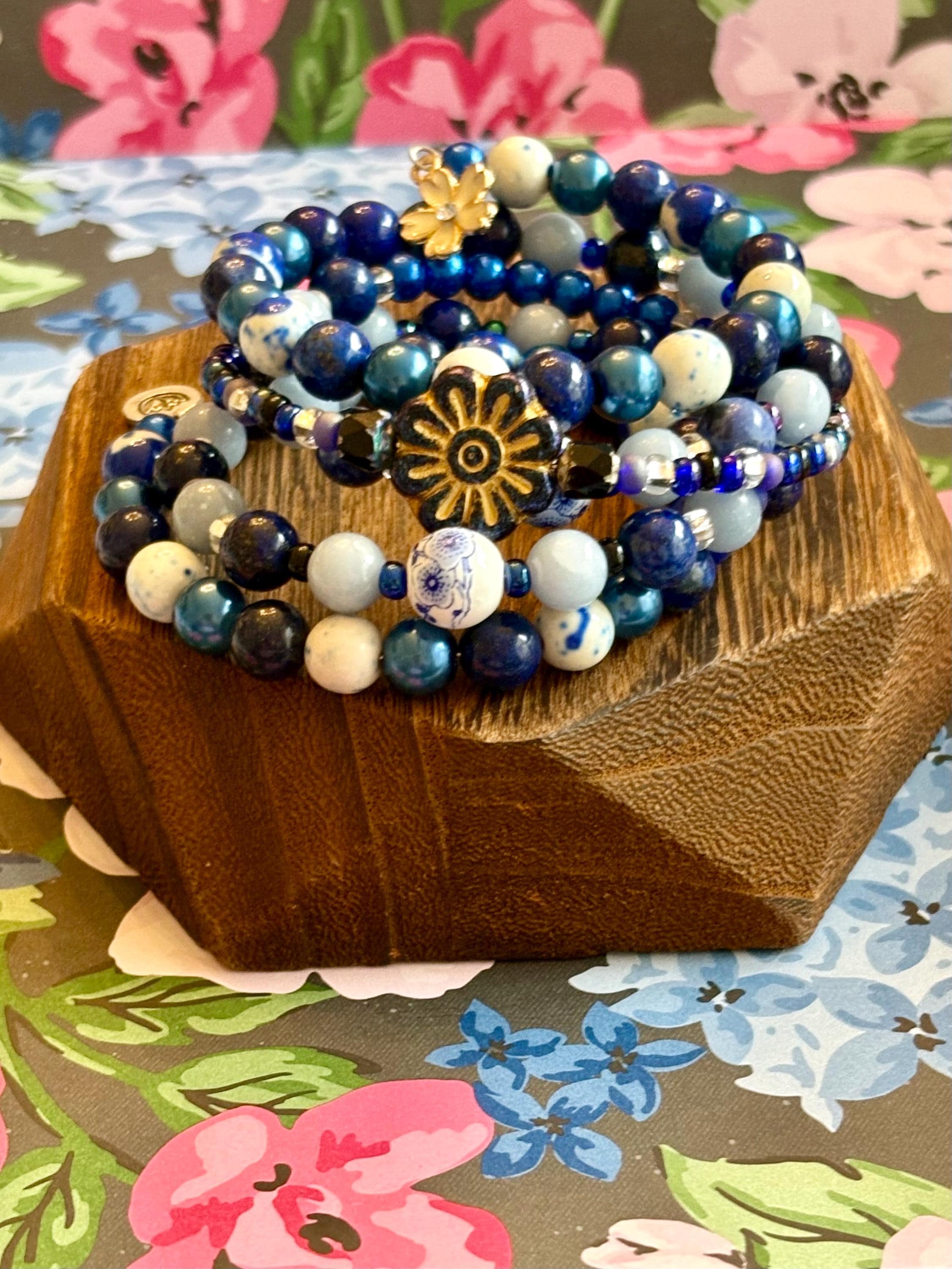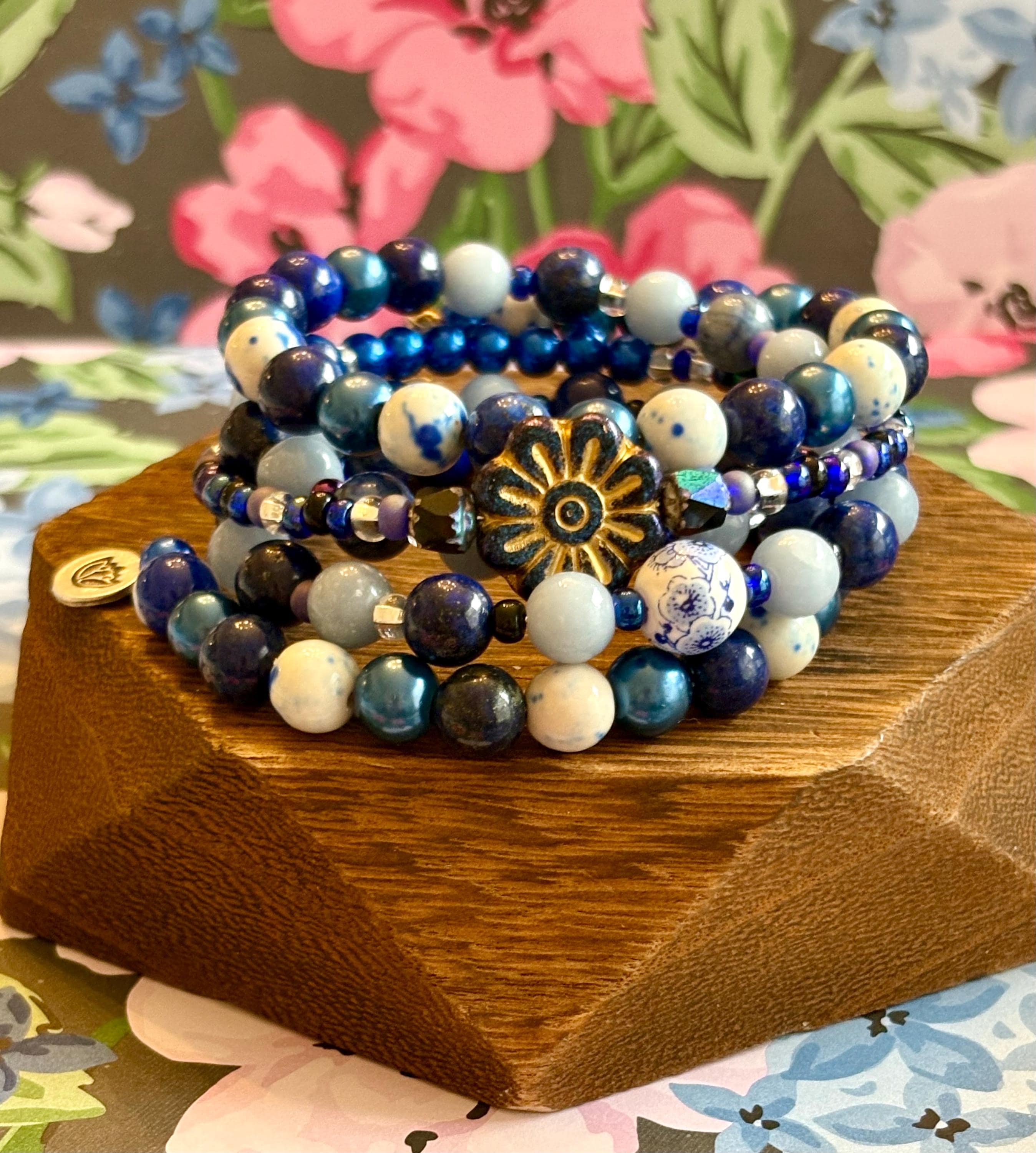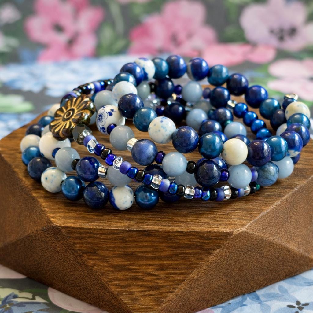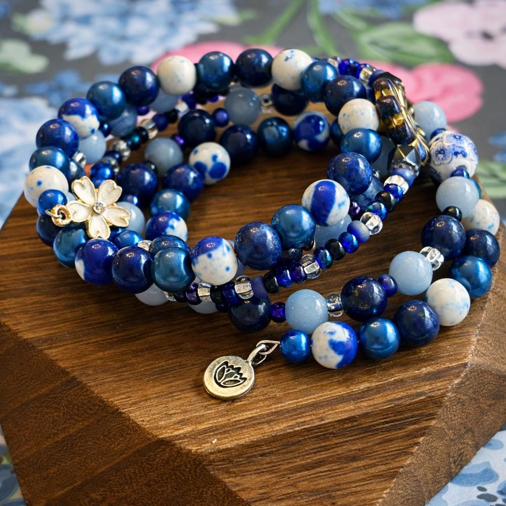 Wrap yourself in calming blue hues and angelic serenity with Blue Lotus Angel Bloom, a handcrafted gemstone coil wrap bracelet designed to bring peace, clarity, and gentle spiritual support! This multi-wrap bracelet blends soft sky blues, deep lapis tones, and luminous metallic accents for a soothing yet powerful presence on the wrist.