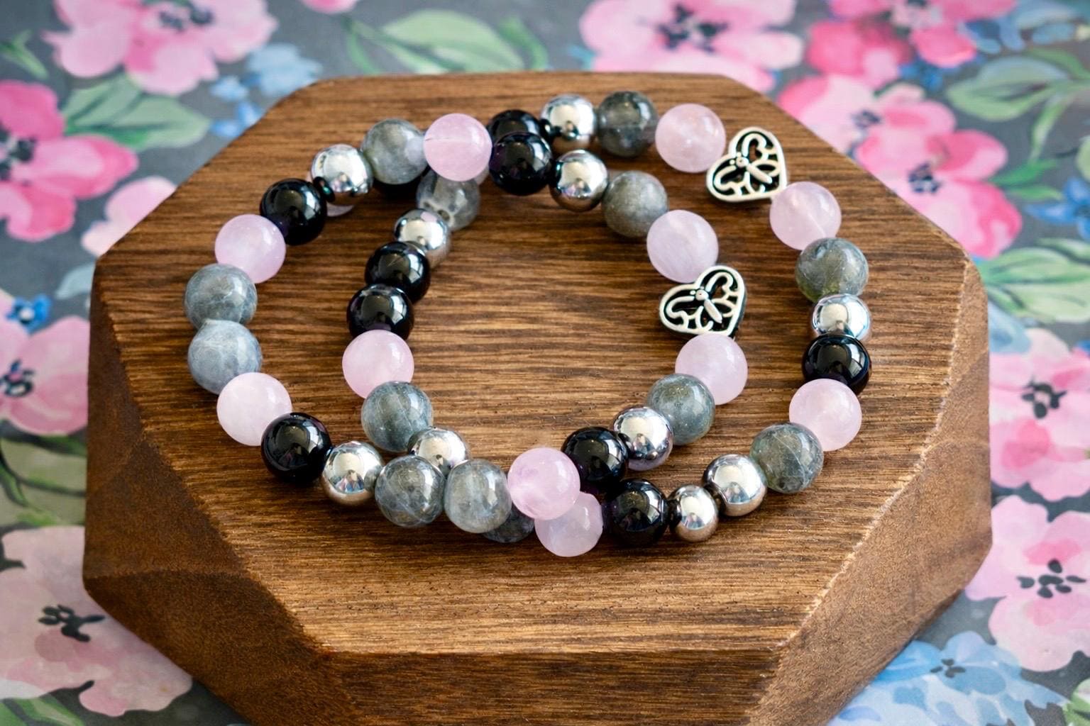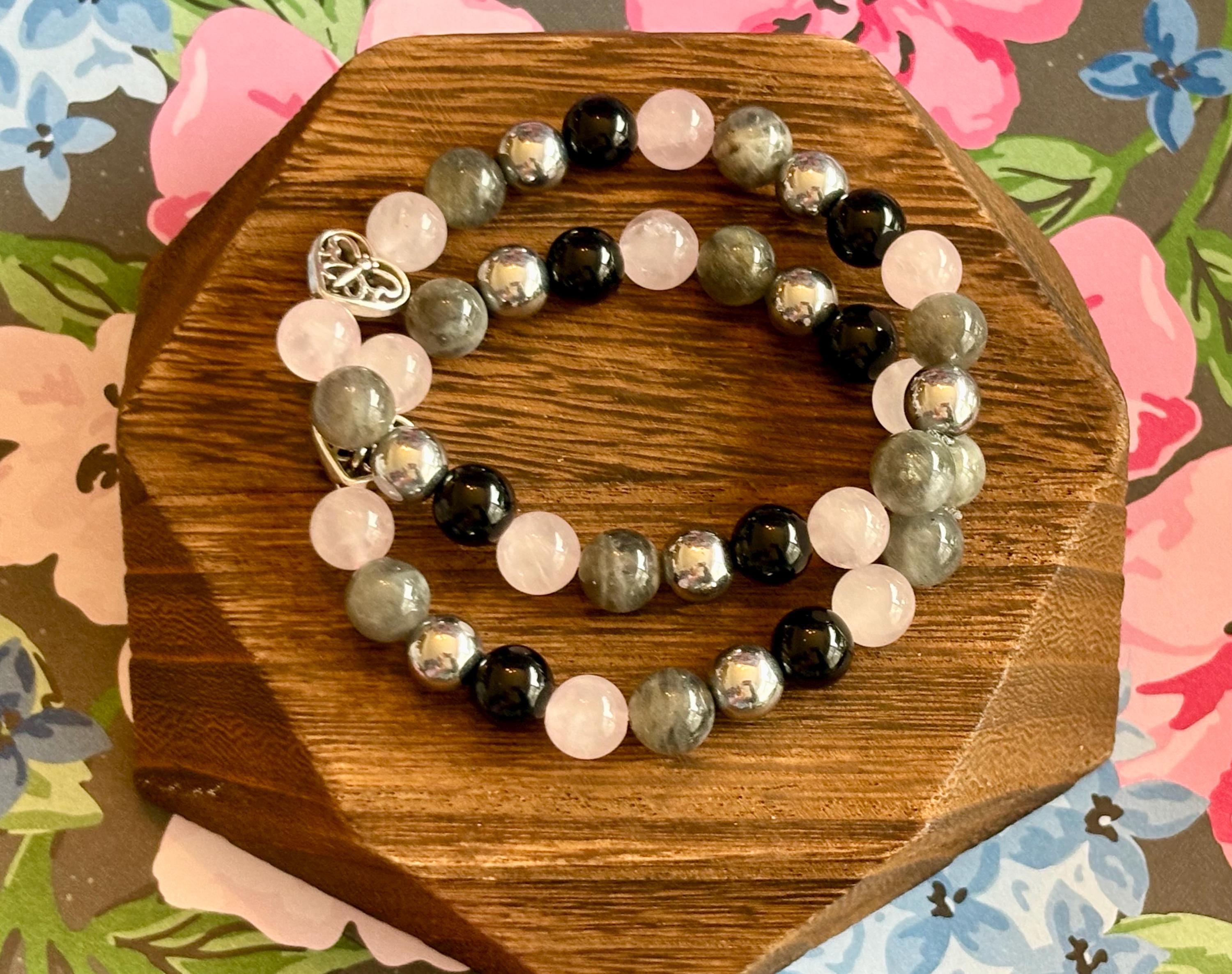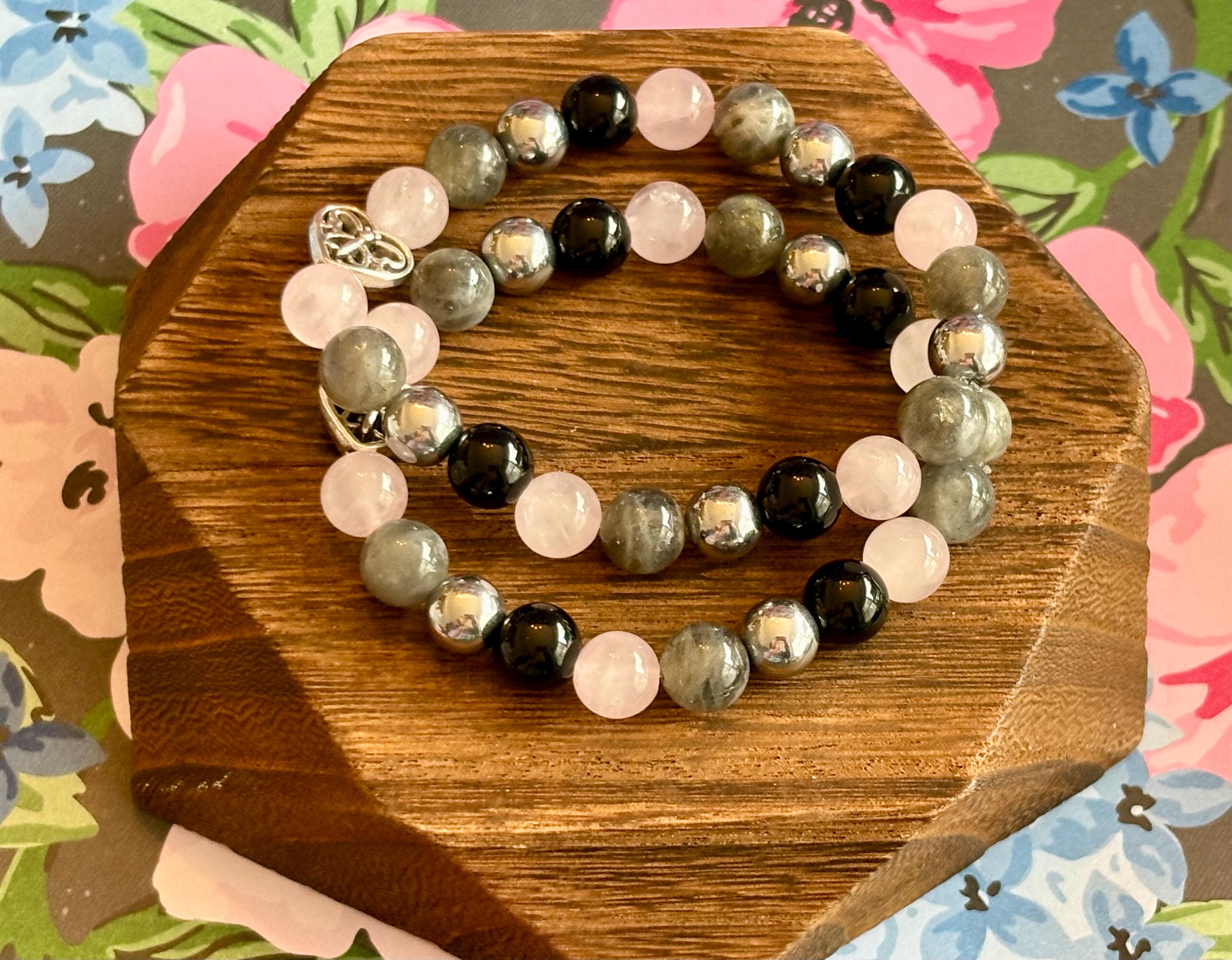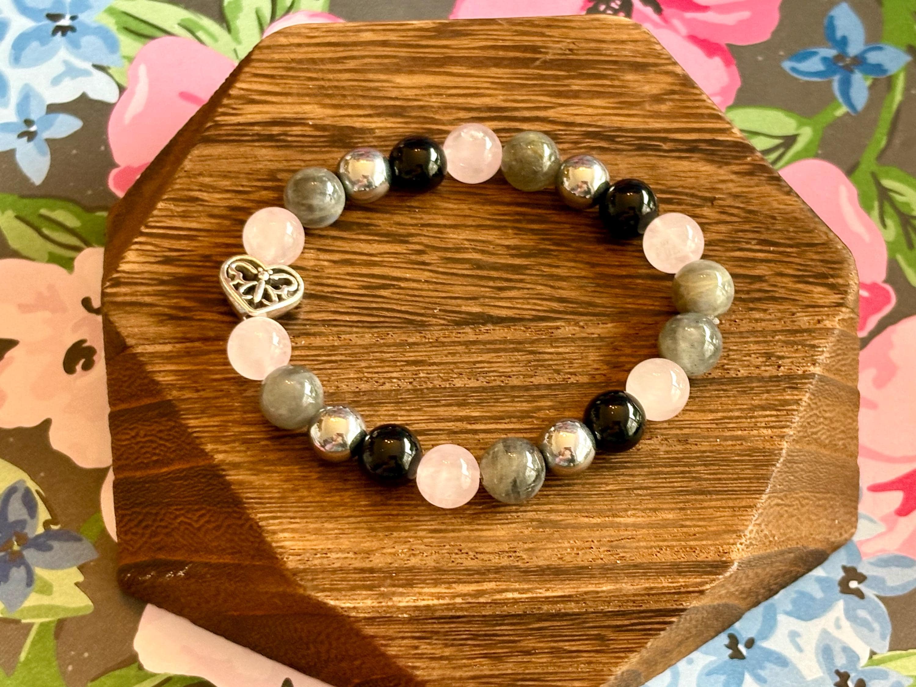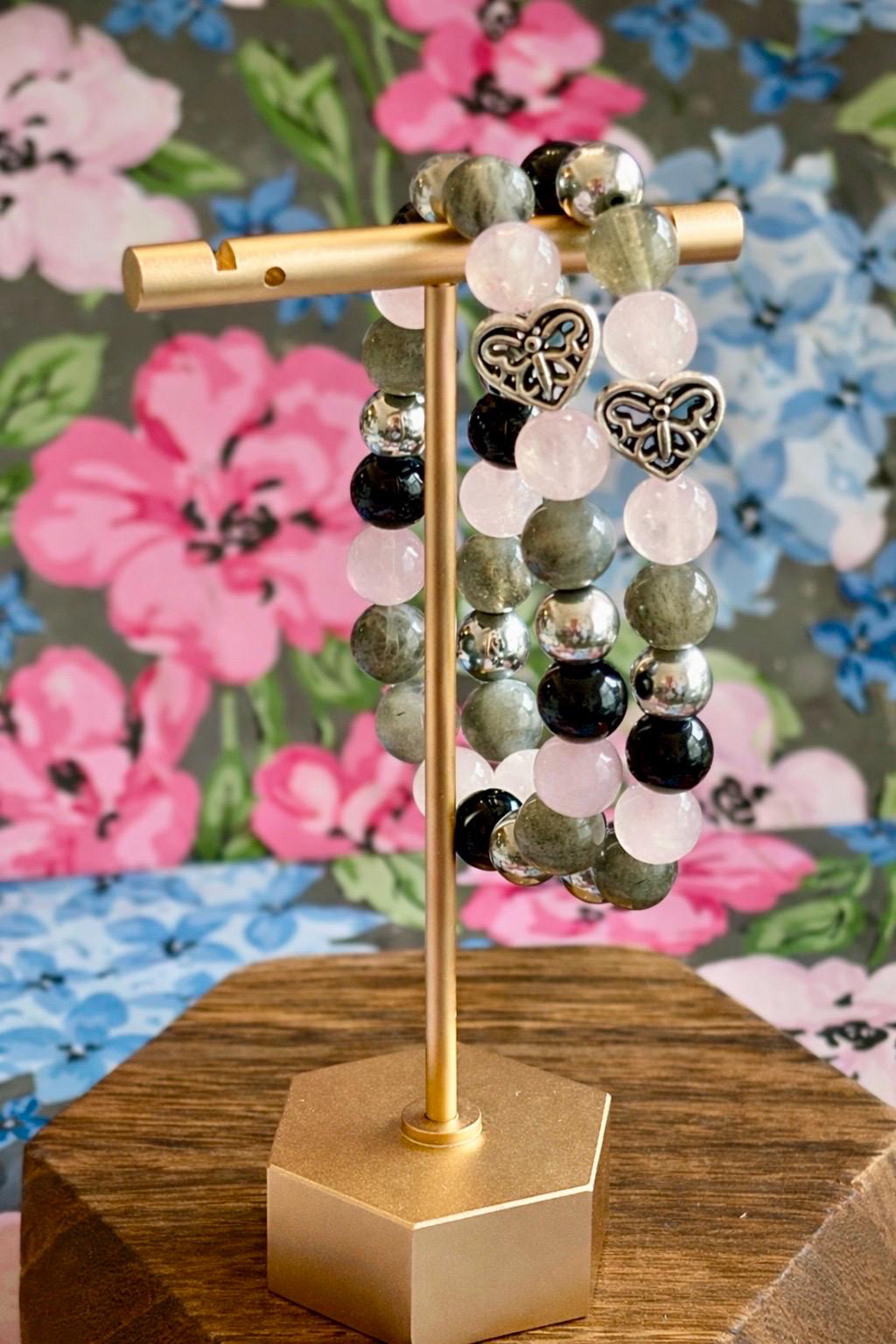 Rose Quartz, Labradorite, Hematite, Obsidian Bracelet | Butterfly Heart Charm | Love Protection Healing Jewelry