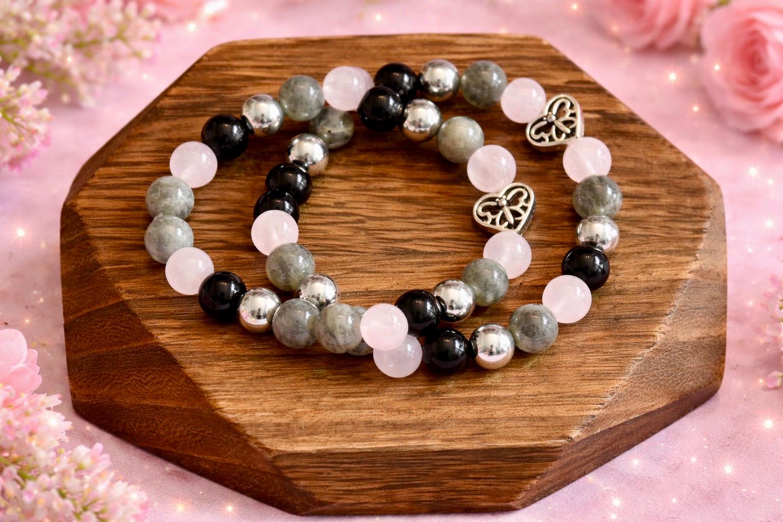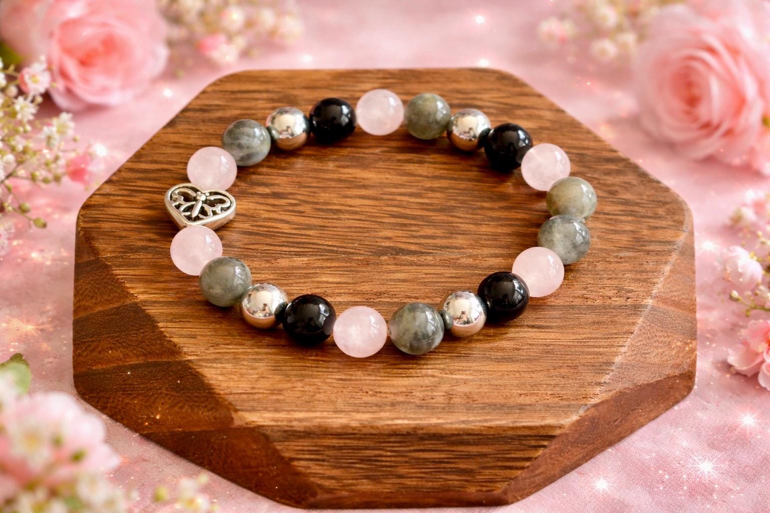 This bracelet supports all zodiac signs, blending heart-healing love, intuitive insight, grounding protection, and emotional balance. Rose Quartz opens the heart, Labradorite enhances intuition and transformation, Black Obsidian provides protective grounding, and Silver Hematite brings stability and calm focus. Together, these stones create a gentle yet powerful harmony for emotional growth, protection, and spiritual alignment.