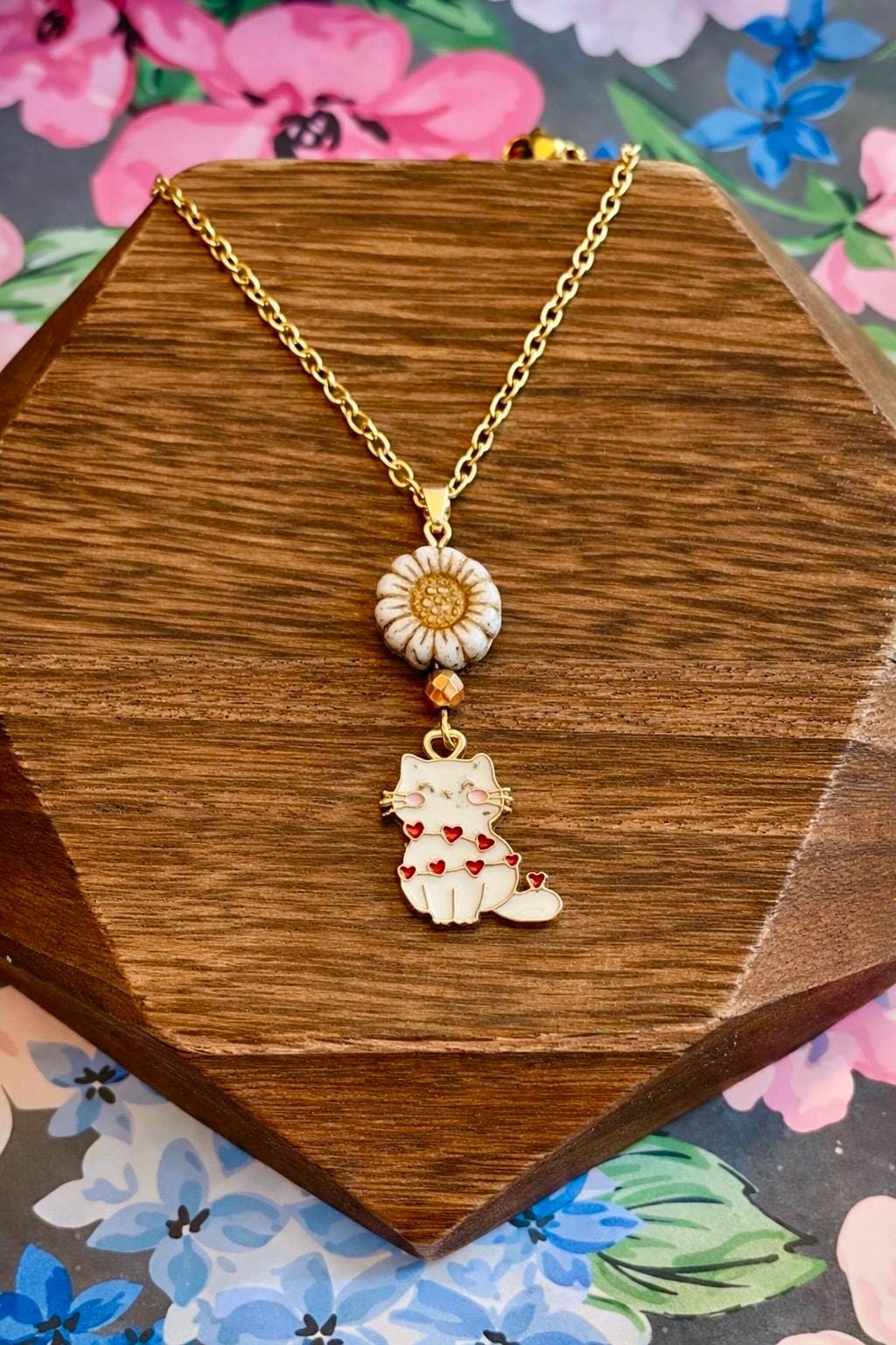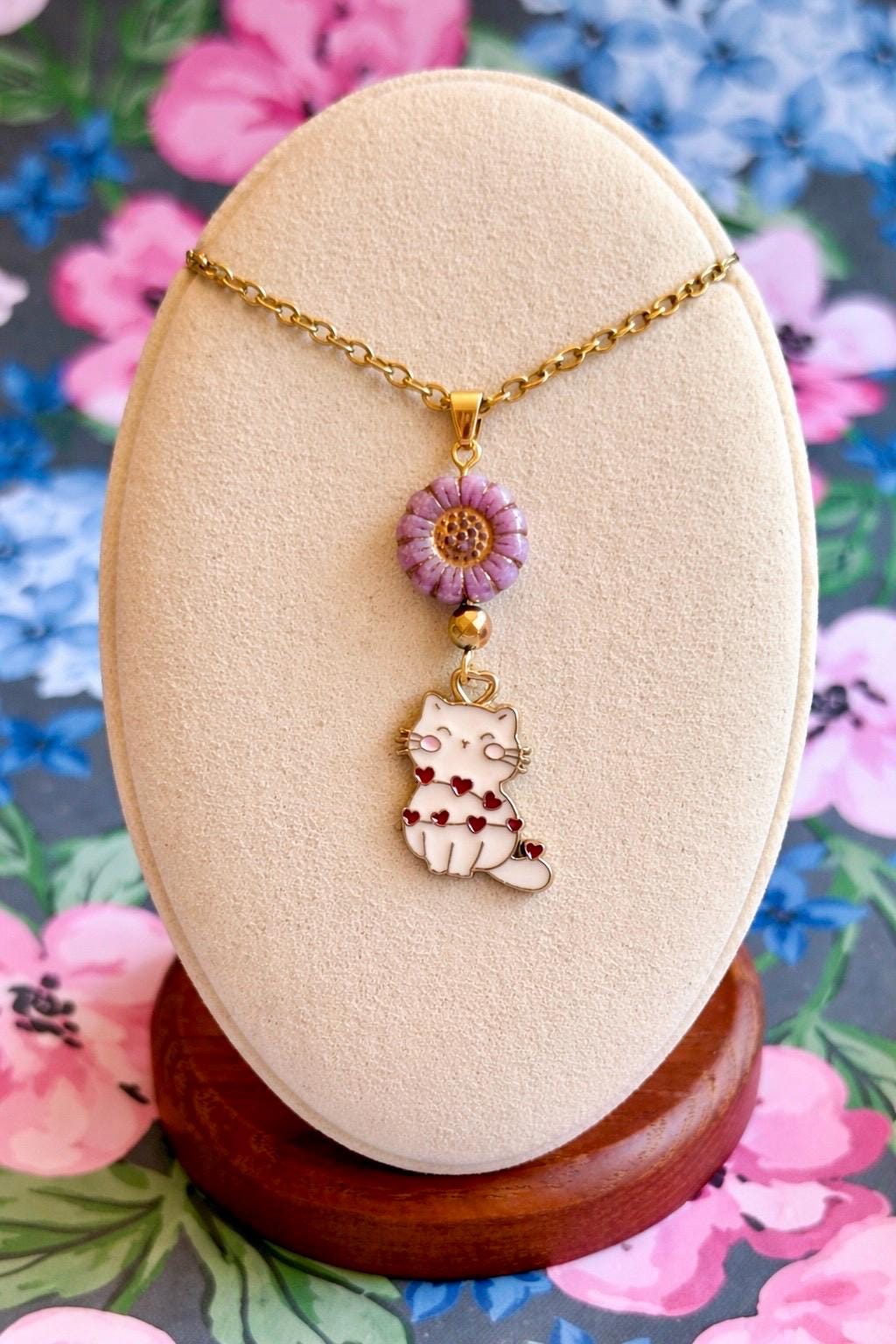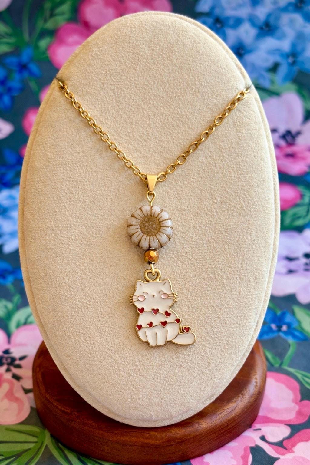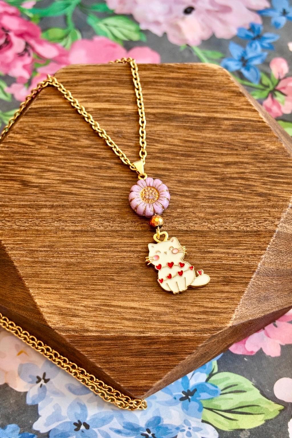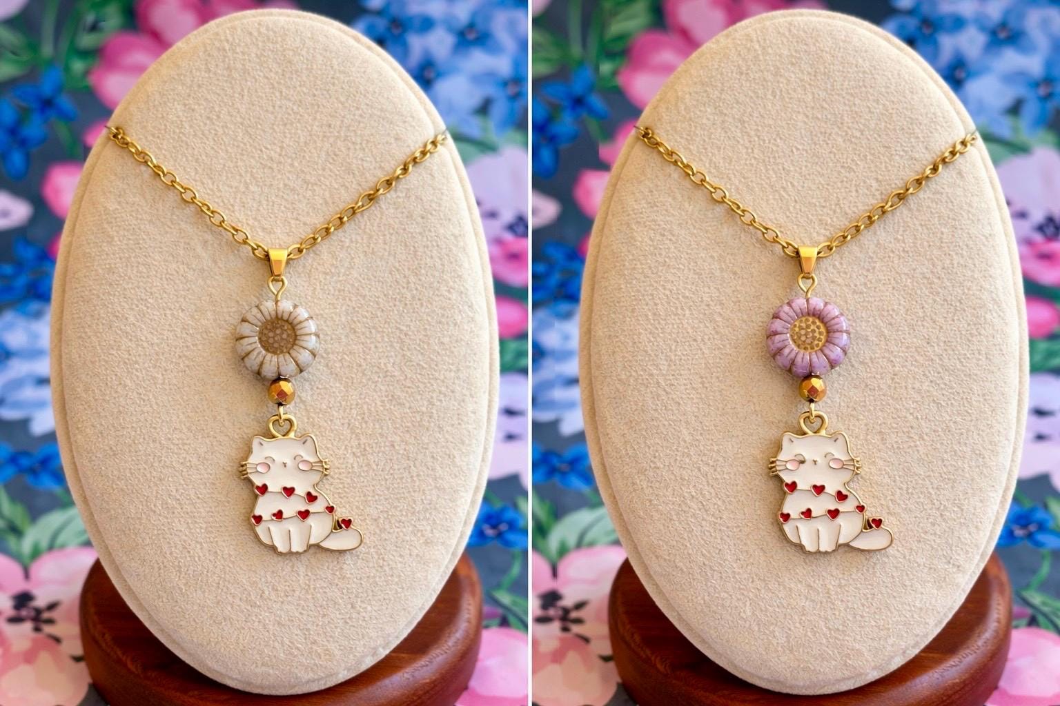 Heartfelt Whiskers Bloom Necklace – Valentine Cat Sunflower Necklace – Pink or Ivory Czech Glass – Gold Tone Stainless Steel – Love Jewelry