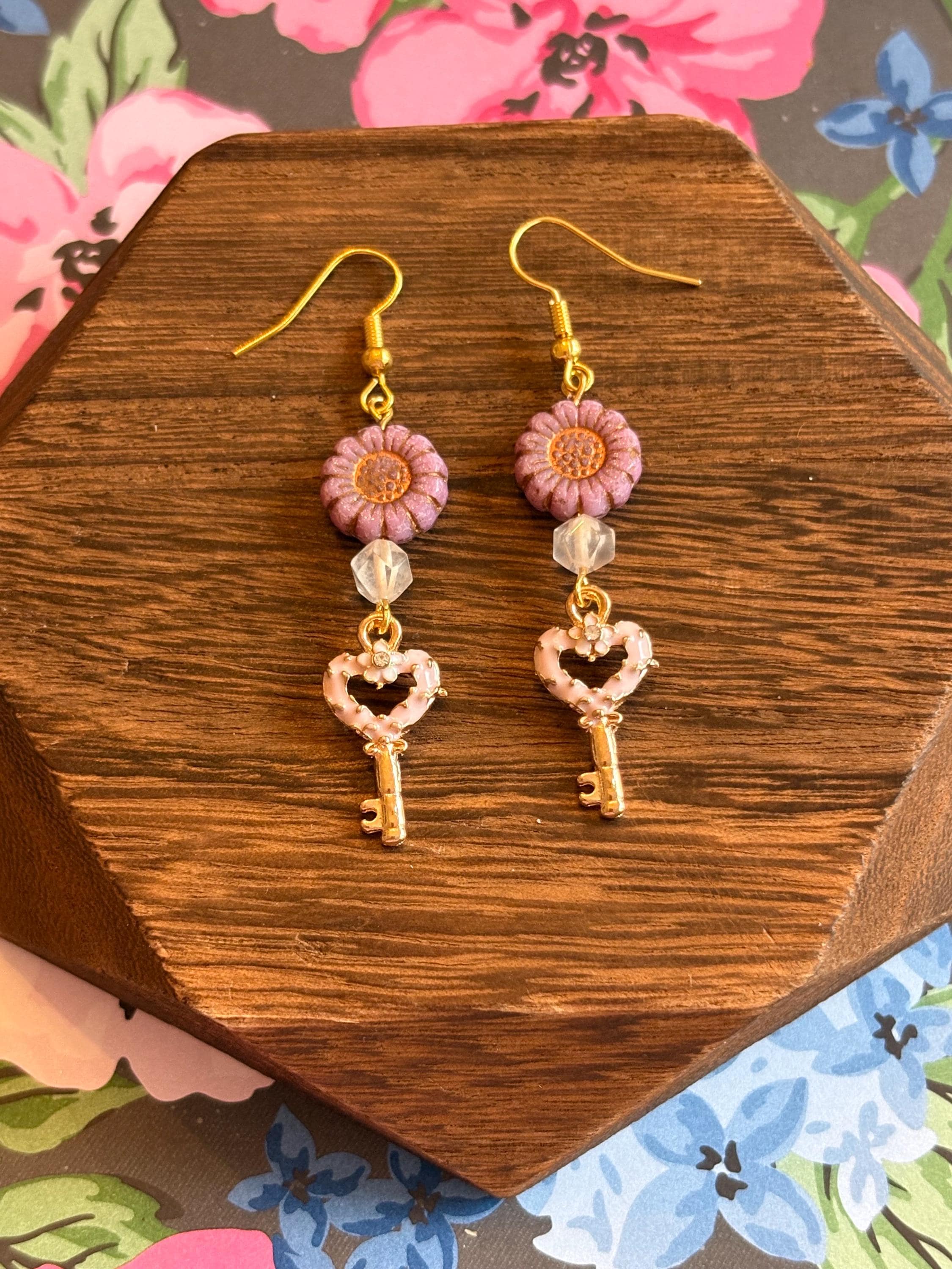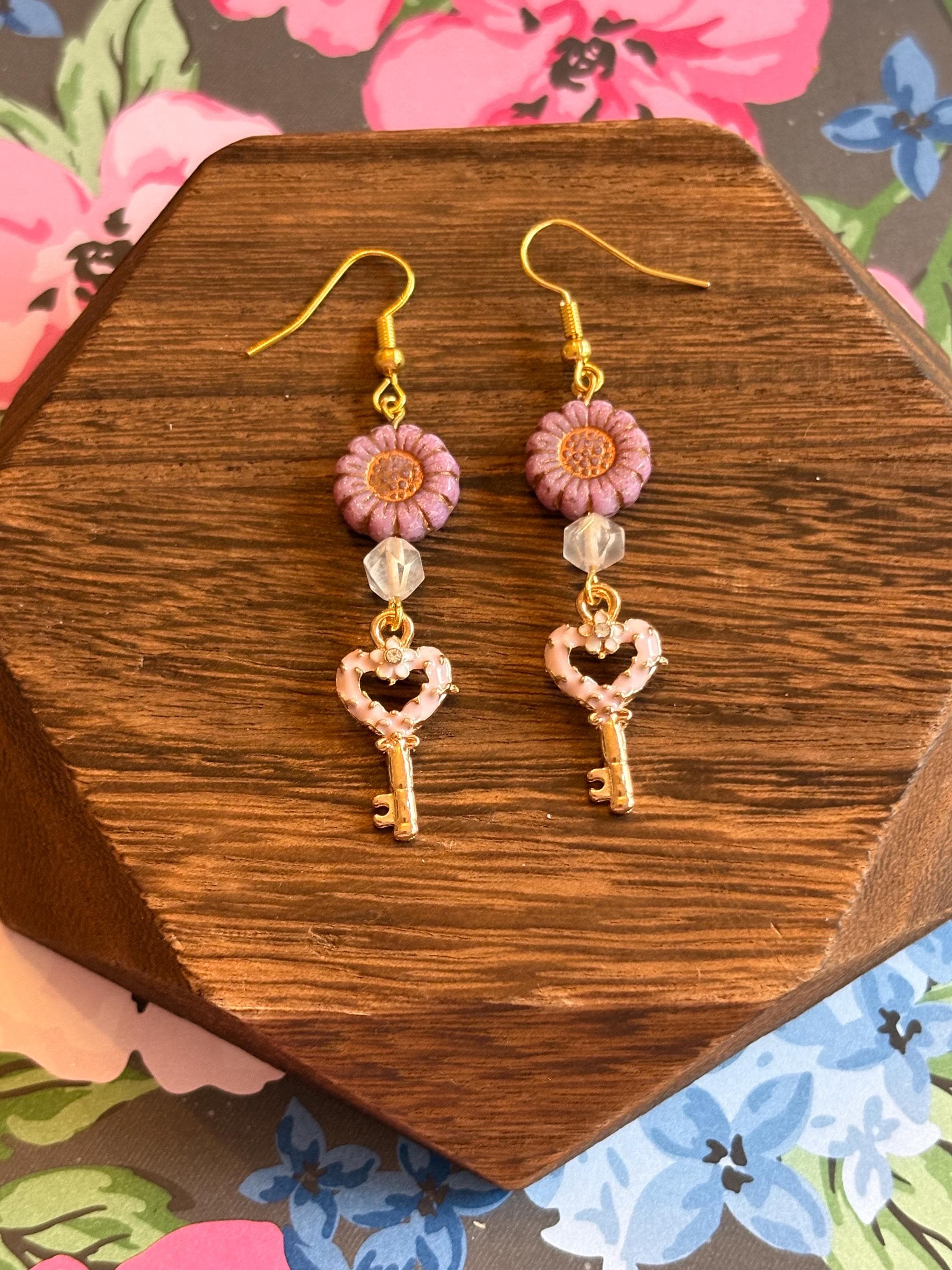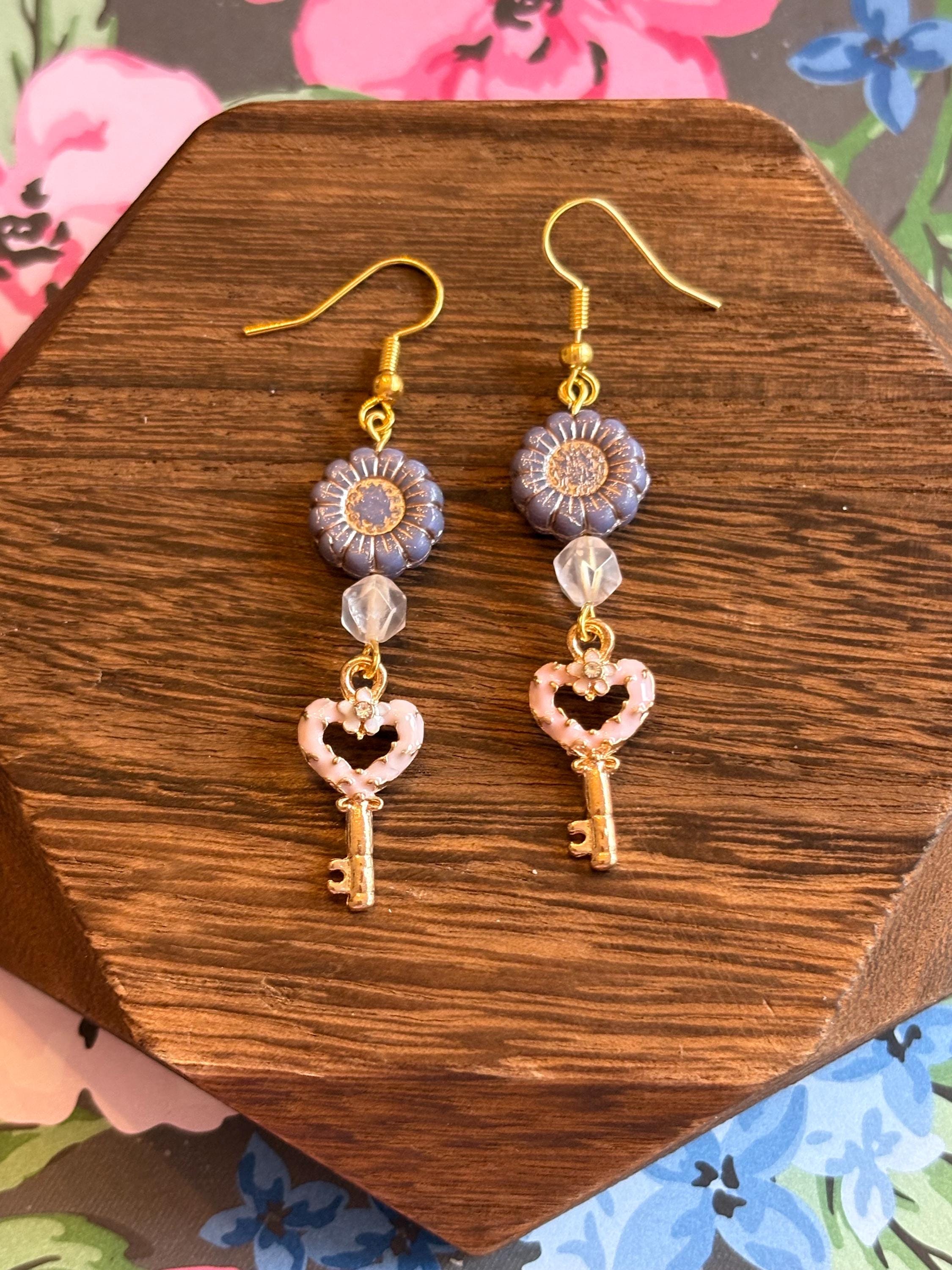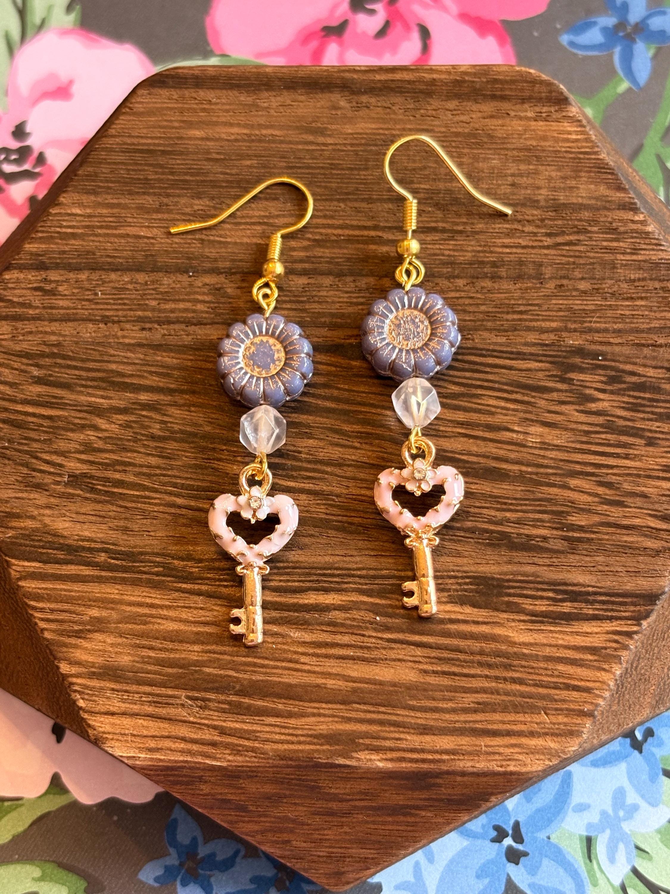 Heart Key Bloom Earrings, Star Cut Rose Quartz, Sunflower Czech Glass, Gold Hypoallergenic Earrings, Pink Blue or Purple Floral Jewelry