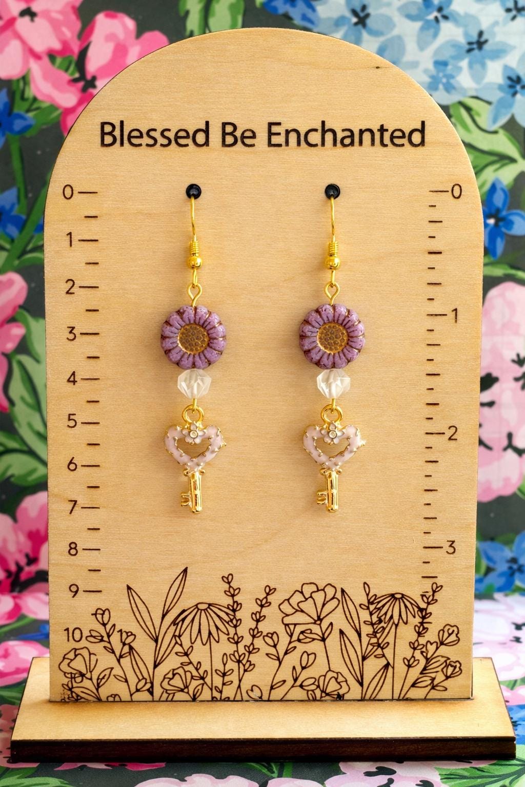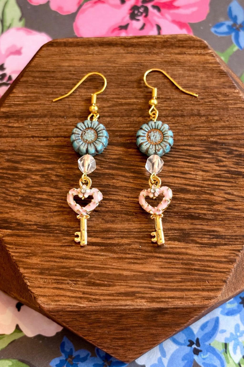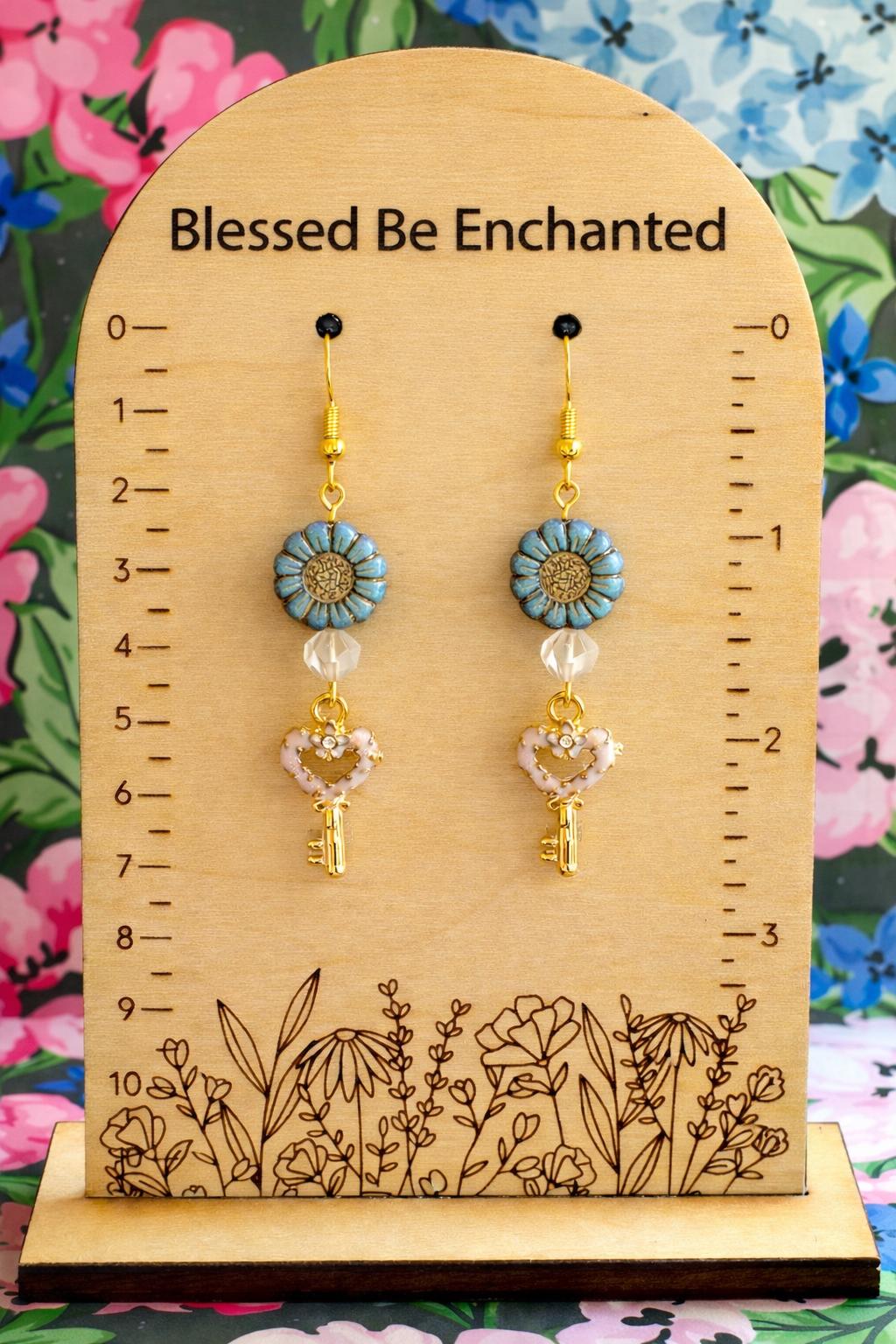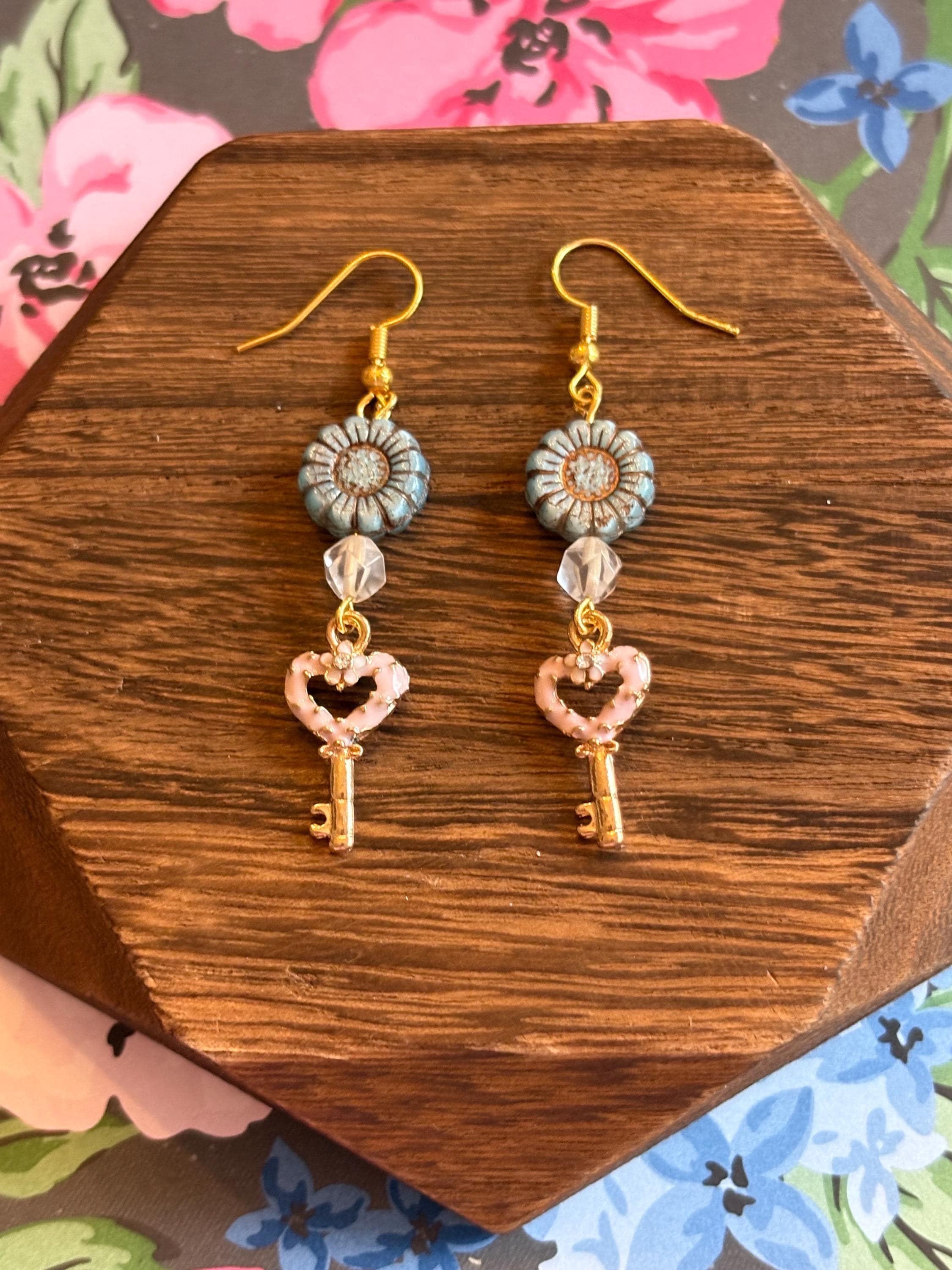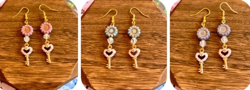 Heart Key Bloom Earrings, Star Cut Rose Quartz, Sunflower Czech Glass, Gold Hypoallergenic Earrings, Pink Blue or Purple Floral Jewelry