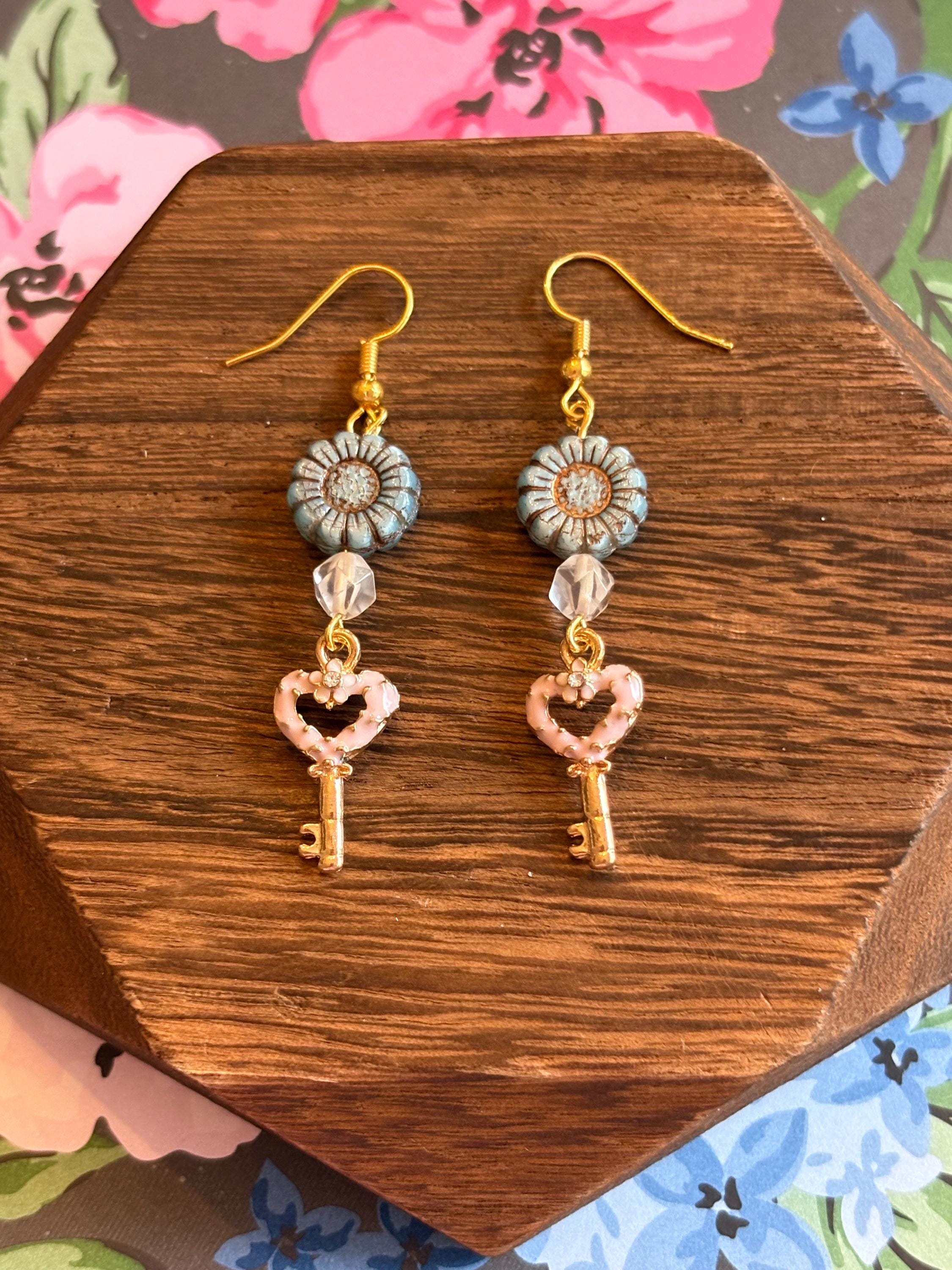 Unlock love, joy, and gentle magic with these Heart Key Bloom Earrings, lovingly handcrafted to bring beauty and meaning to every day! Each pair features luminous star-cut rose quartz, cheerful Czech glass sunflower beads, and a delicate gold-tone enamel heart key charm accented with soft pink enamel and crystal detail.