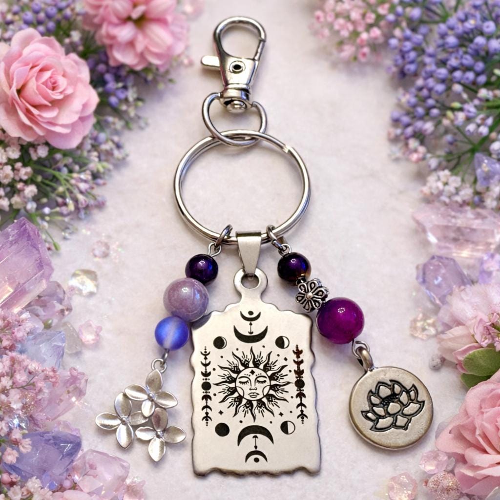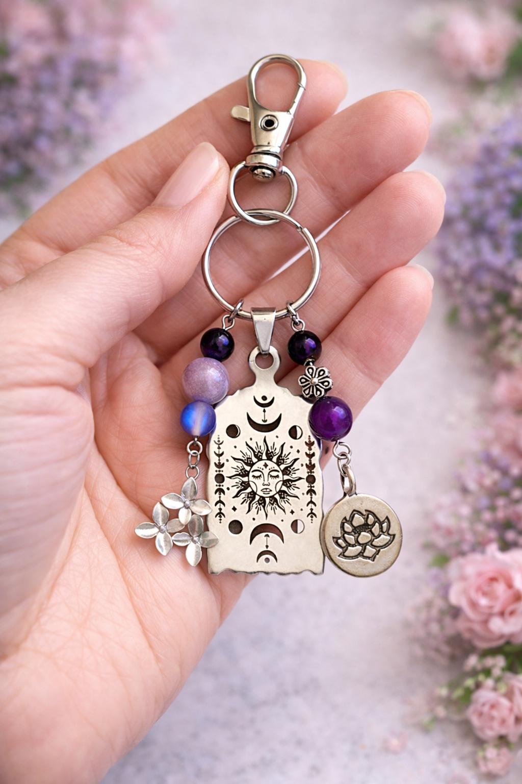 Celestial Sun and Moon Purse Charm Keychain | Sugilite, Hematite, Purple Quartz | Lotus Bag Charm | Spiritual Gift