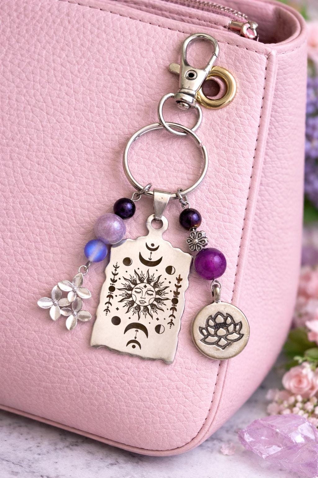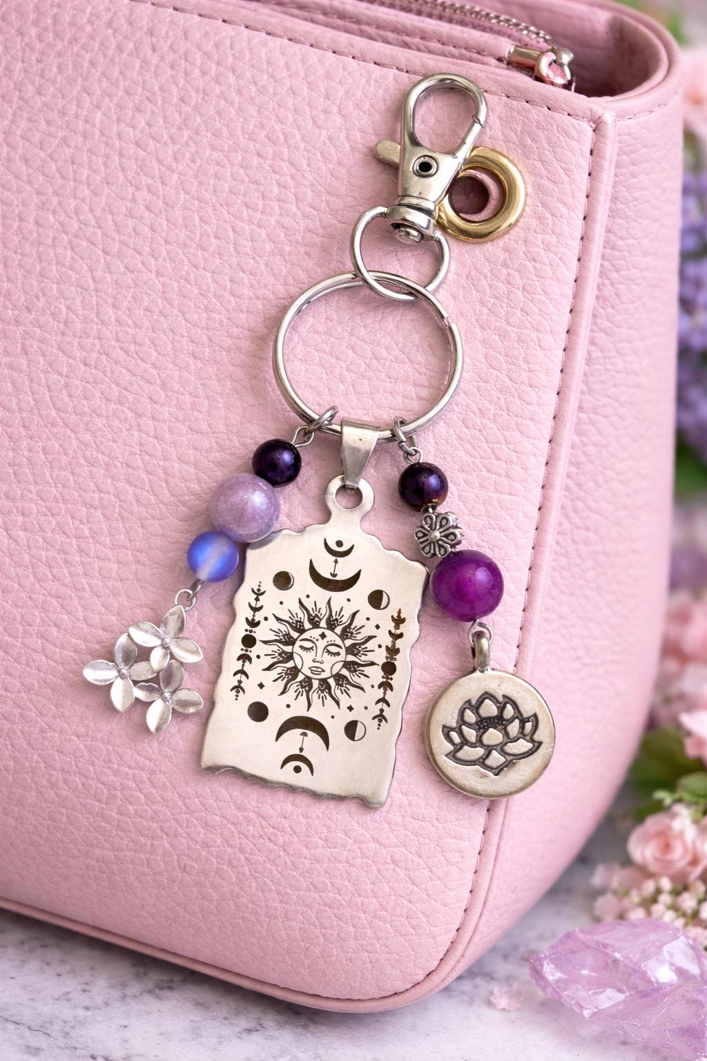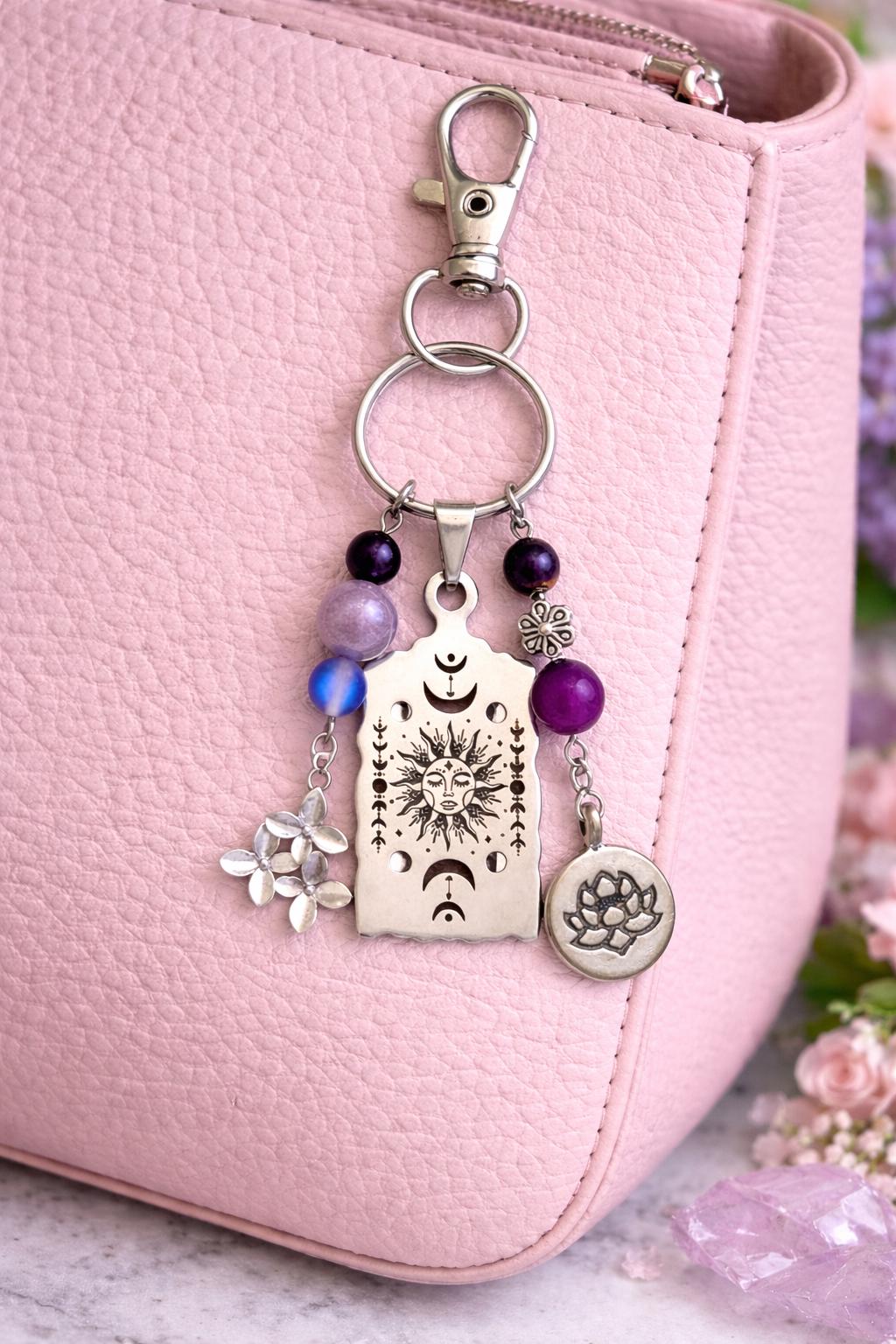 Celestial Sun and Moon Purse Charm Keychain | Sugilite, Purple Hematite, Quartz | Lotus Bag Charm | Spiritual Gift