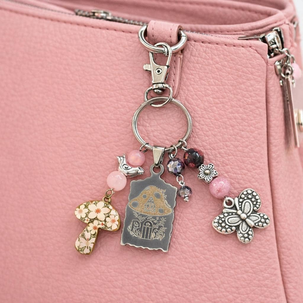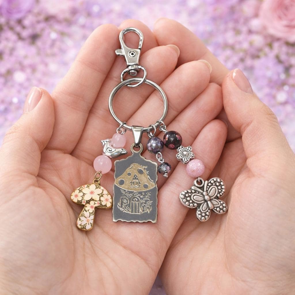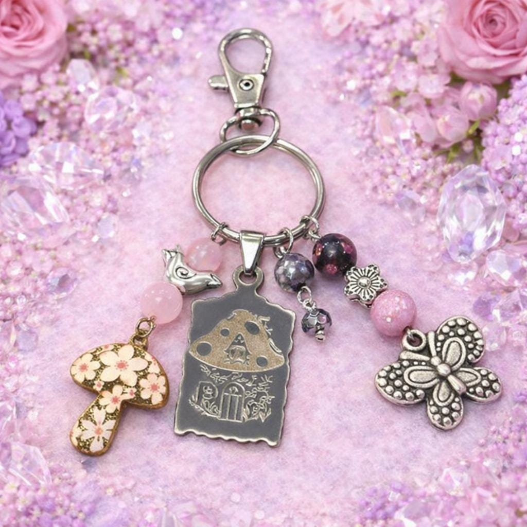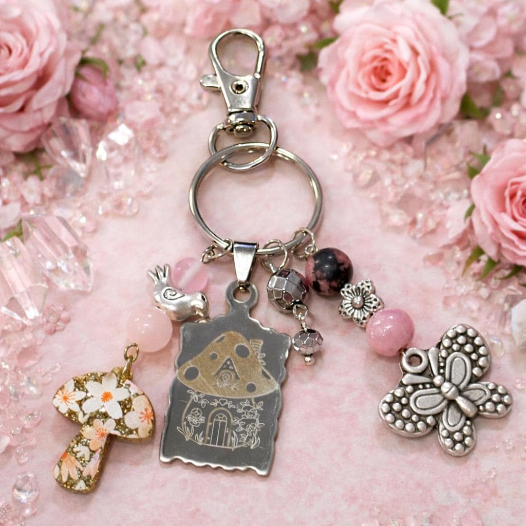 Add a touch of enchanted garden magic to your everyday essentials with this handcrafted Pink Fairy Cottage Whisper Purse Charm & Keychain! Designed to evoke fairy-tale warmth and gentle spiritual support, this piece blends whimsical charm with meaningful gemstones—perfect for purses, keys, backpacks, or gift giving.
