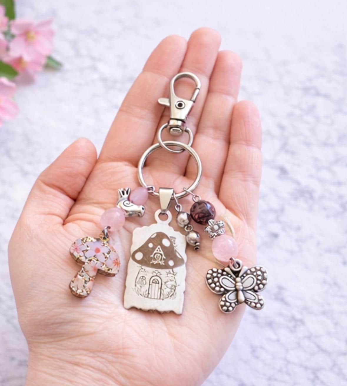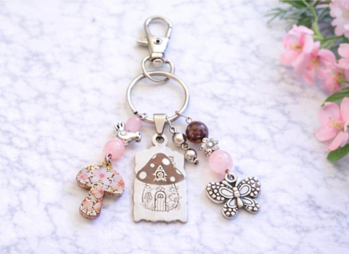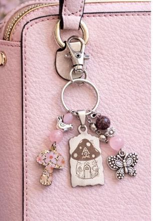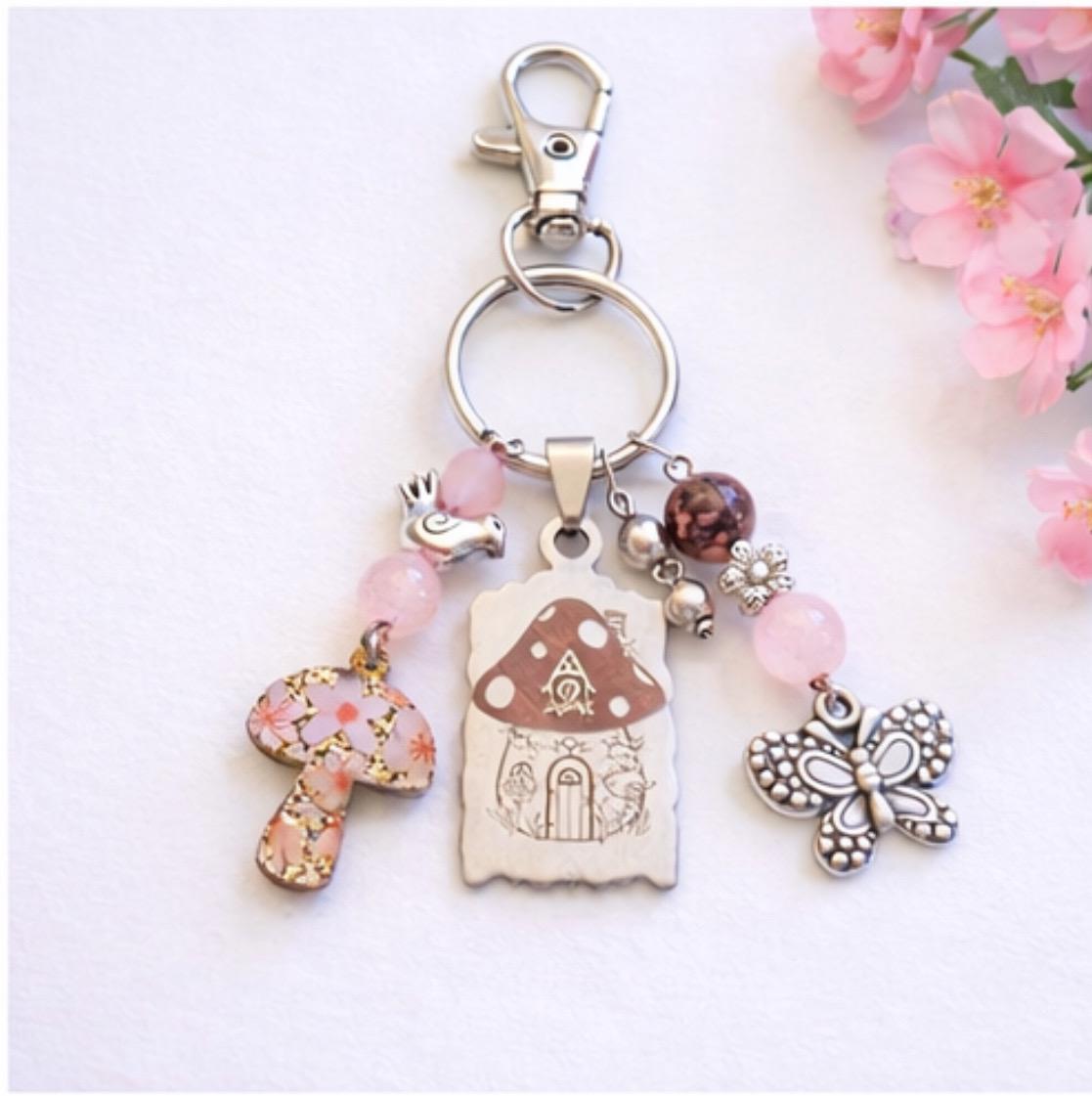 Add a touch of enchanted garden magic to your everyday essentials with this handcrafted Pink Fairy Cottage Whisper Purse Charm & Keychain! Designed to evoke fairy-tale warmth and gentle spiritual support, this piece blends whimsical charm with meaningful gemstones—perfect for purses, keys, backpacks, or gift giving.