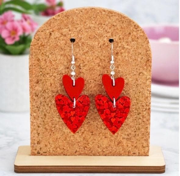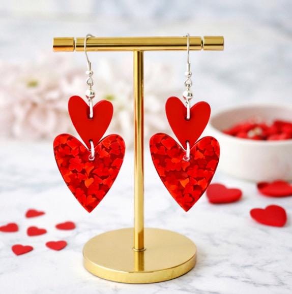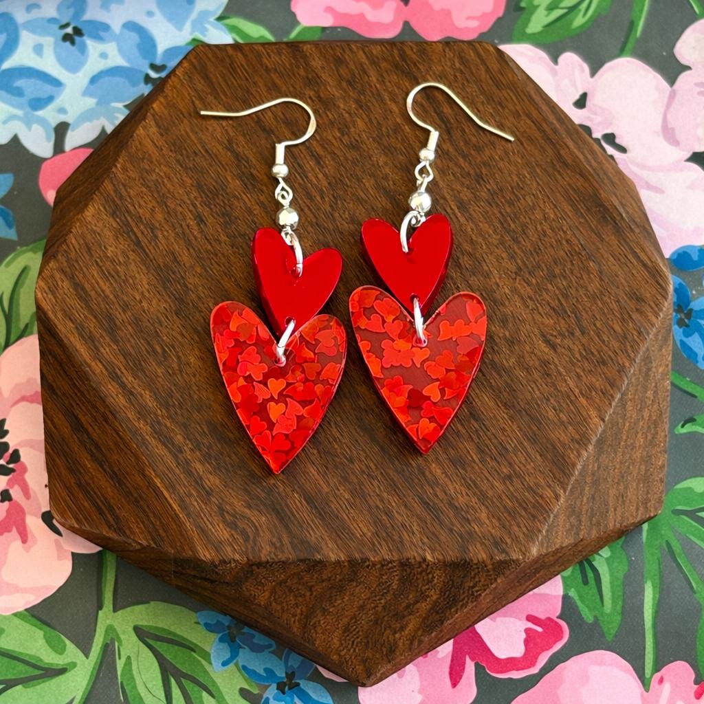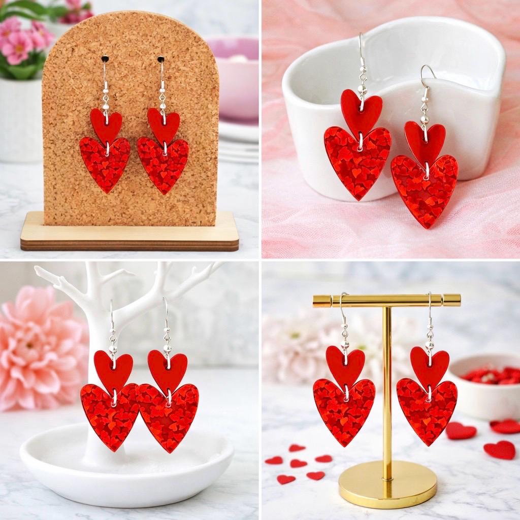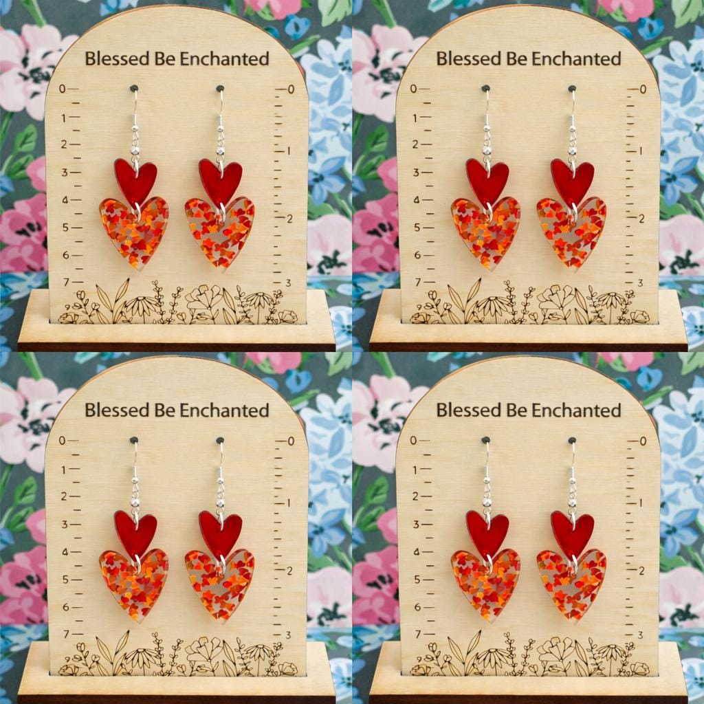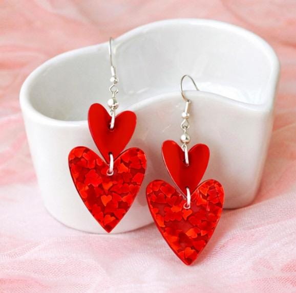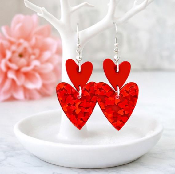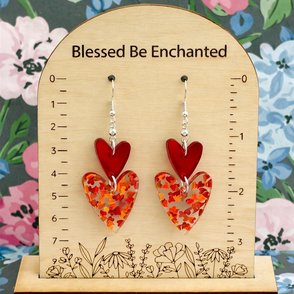 These Crimson Spark Devotion Heart Earrings are a radiant celebration of love, passion, and inner strength! Featuring layered mirrored sparkle glitter acrylic heart pendants in rich crimson tones, accented with silver faceted hematite gemstones, these earrings shimmer beautifully with every movement.