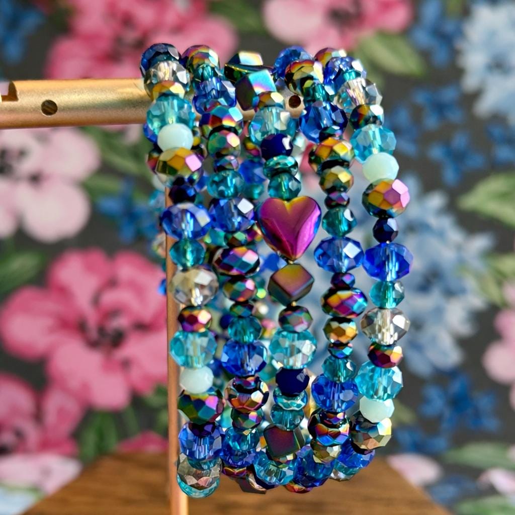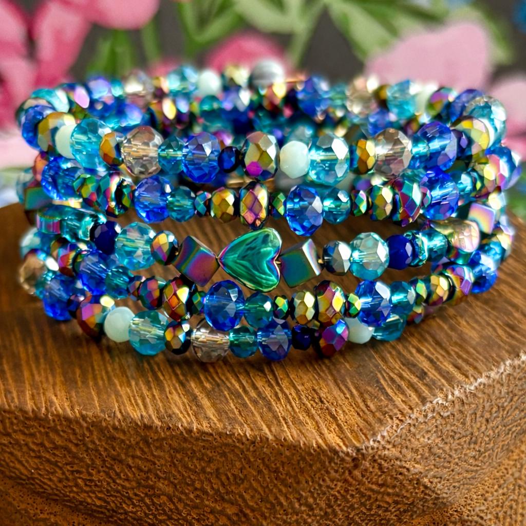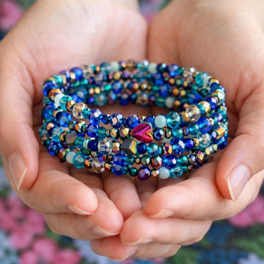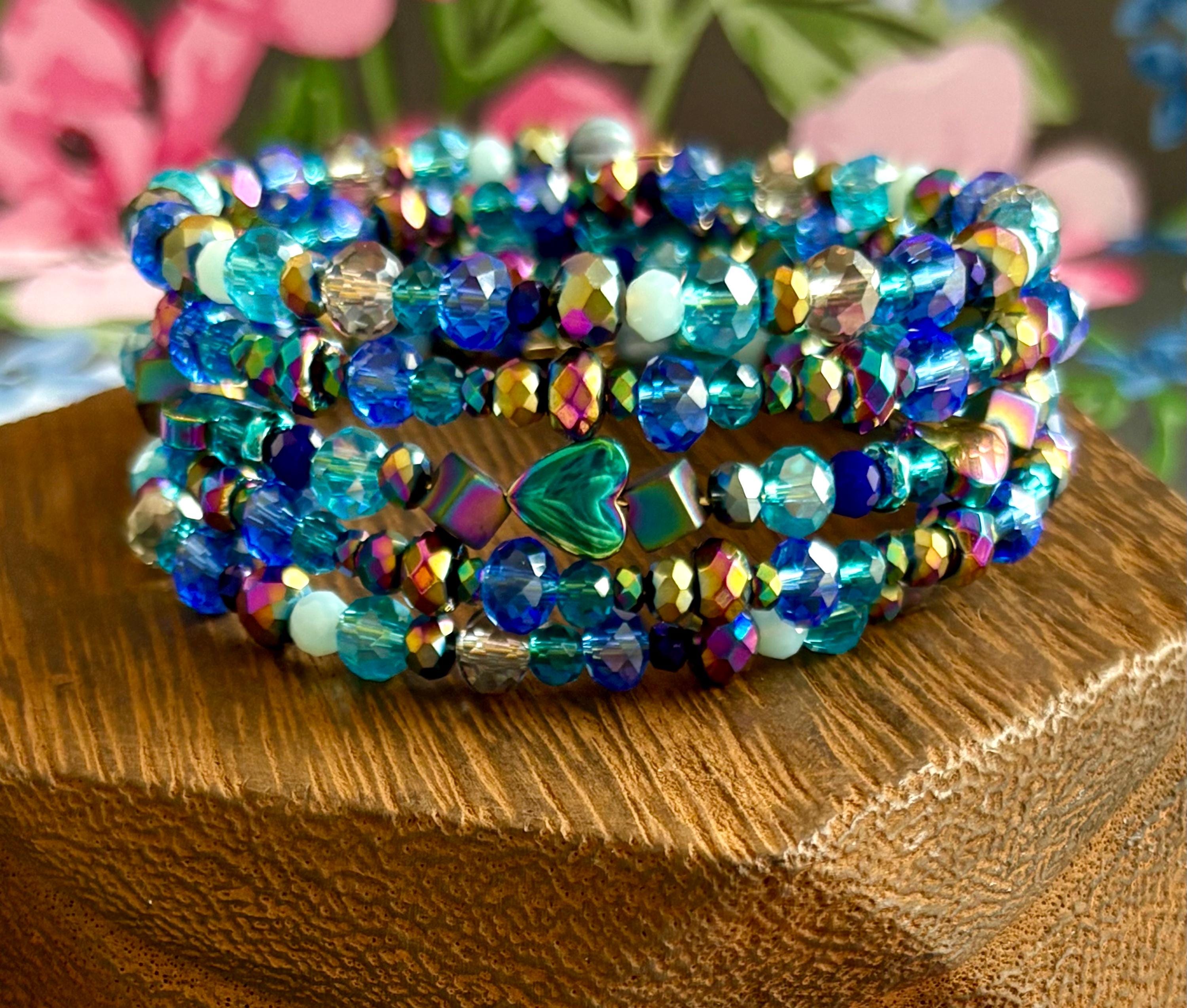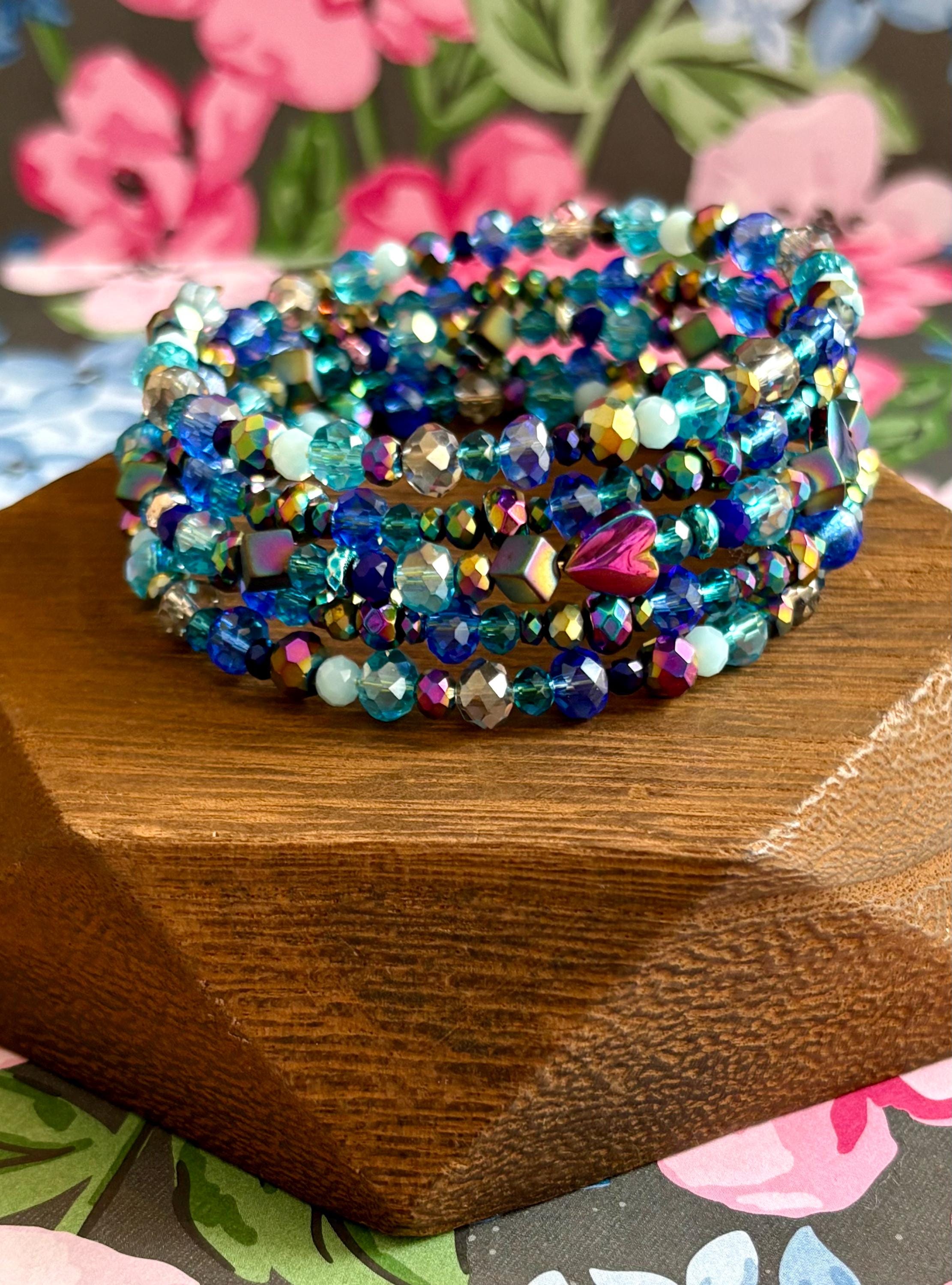 Inspired by the shimmering glow of the northern lights, the Aurora Borealis Heart & Star Galaxy Wrap Bracelet is a radiant piece from the Enchanted Galaxy Wraps Collection! This multi-wrap bracelet sparkles with faceted crystal and Czech glass beads in celestial shades of blue, teal, purple, gold, magenta, rainbow, and soft gray—capturing the magic of starlight and cosmic beauty.