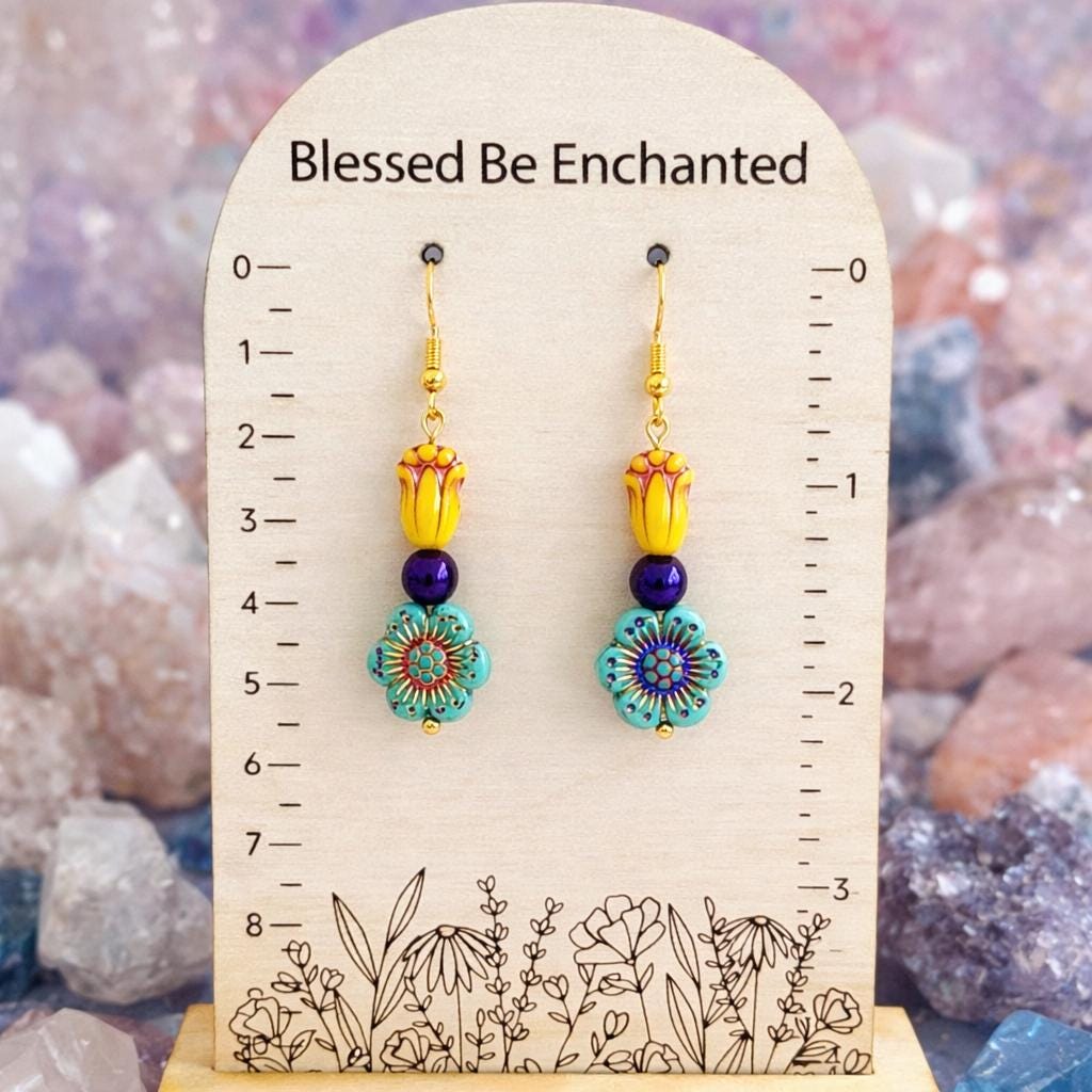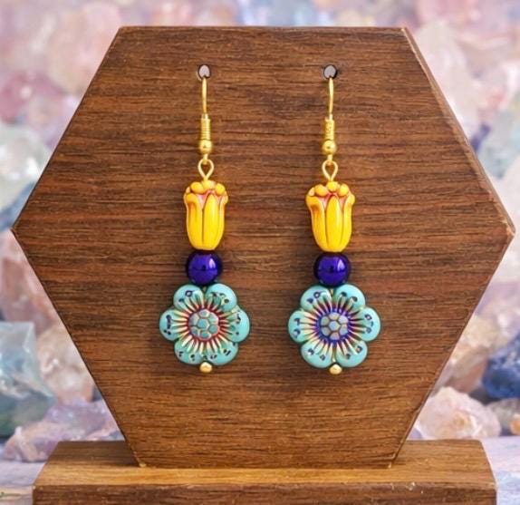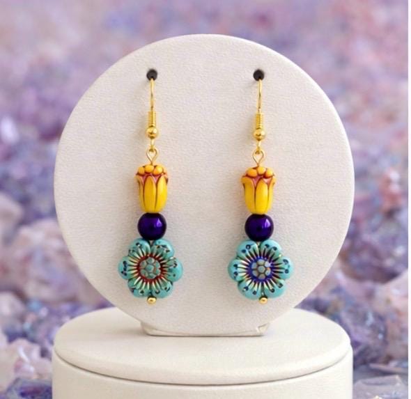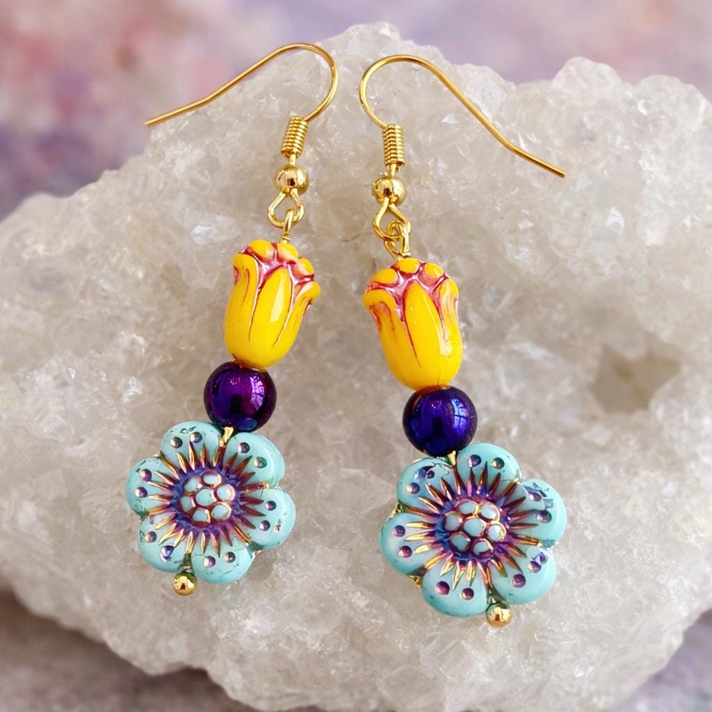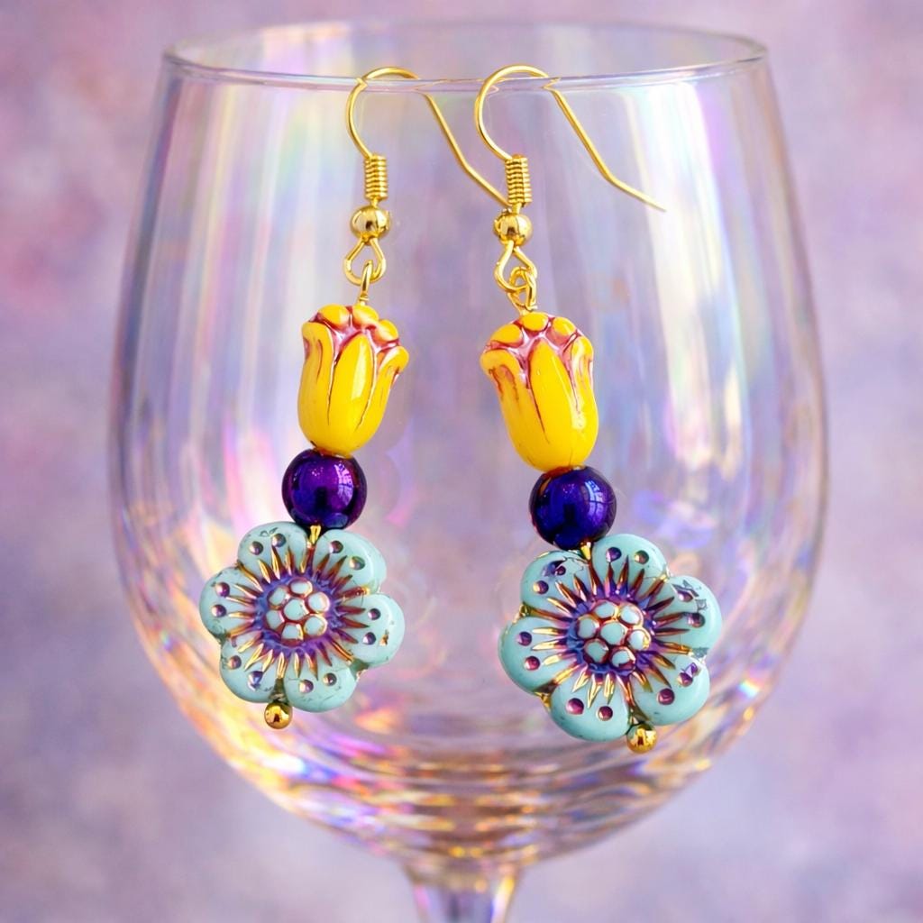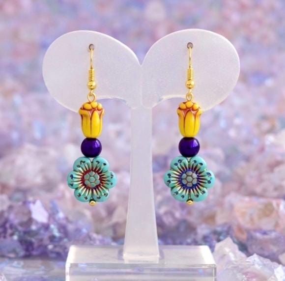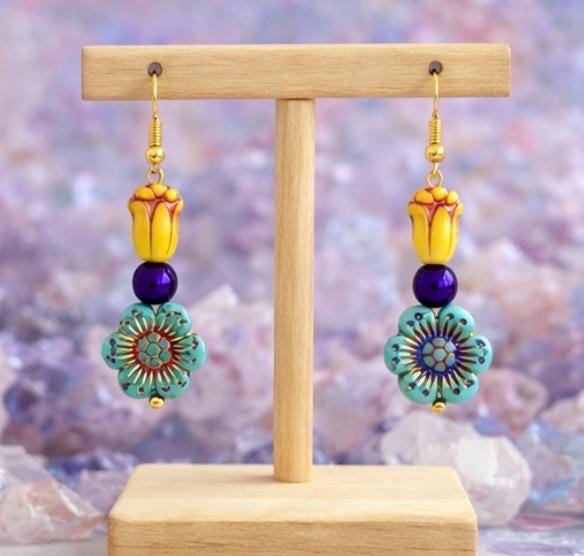 Inspired by the iconic Mardi Gras palette of purple, gold, and green, these earrings feature cheerful Czech glass tulips and flowers, paired with shimmering purple metallic hematite for balance and sparkle. Each detail was thoughtfully chosen to reflect the playful elegance and joyful energy of Carnival season.
