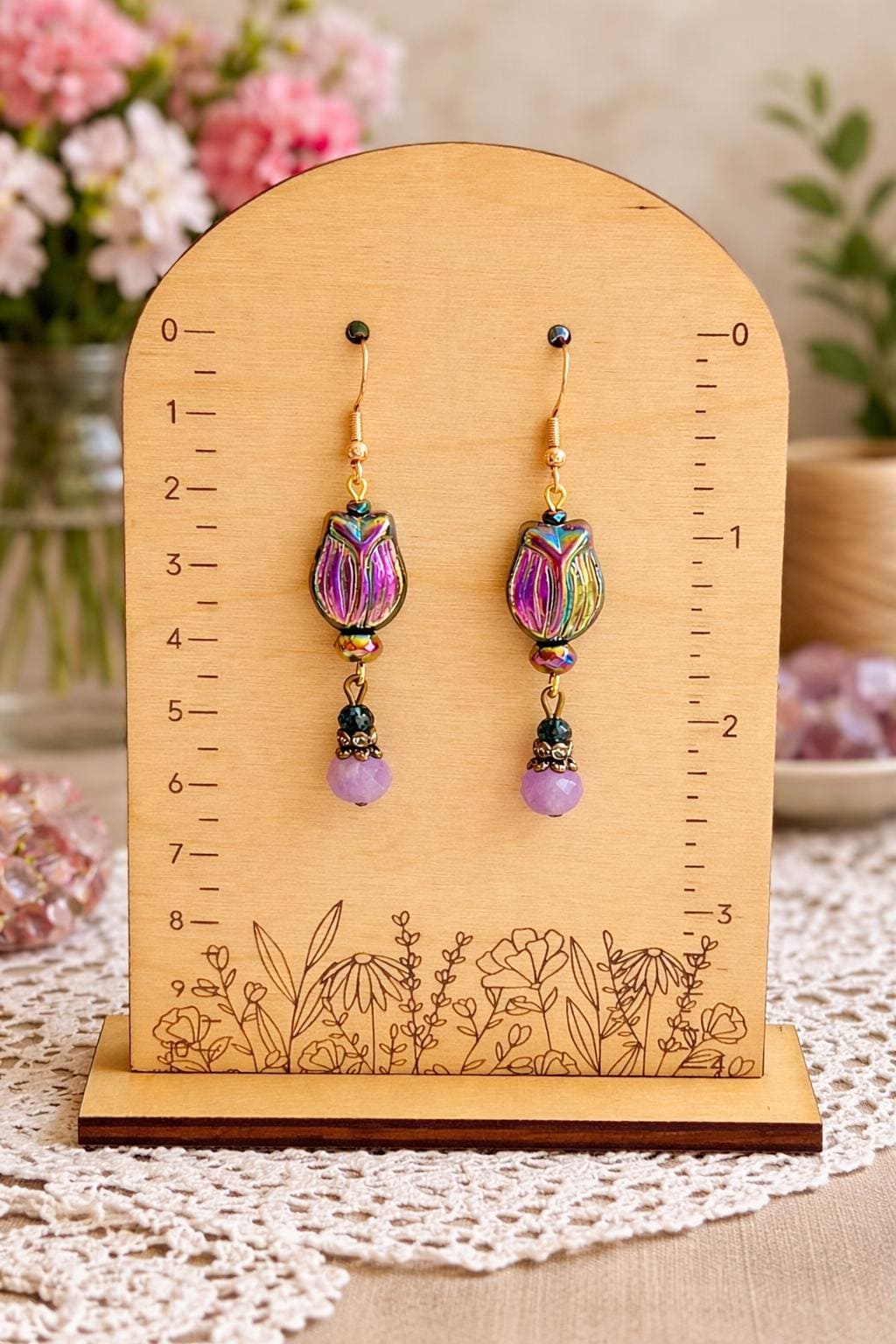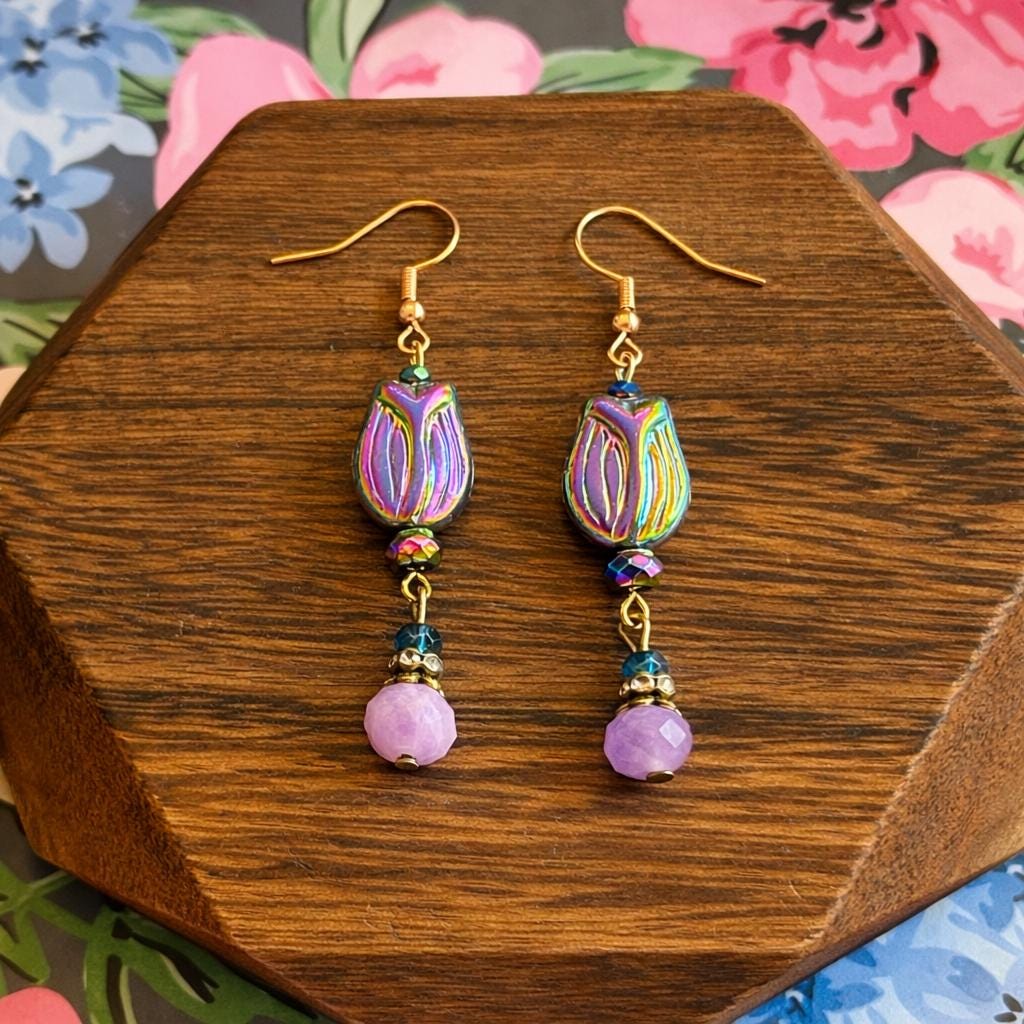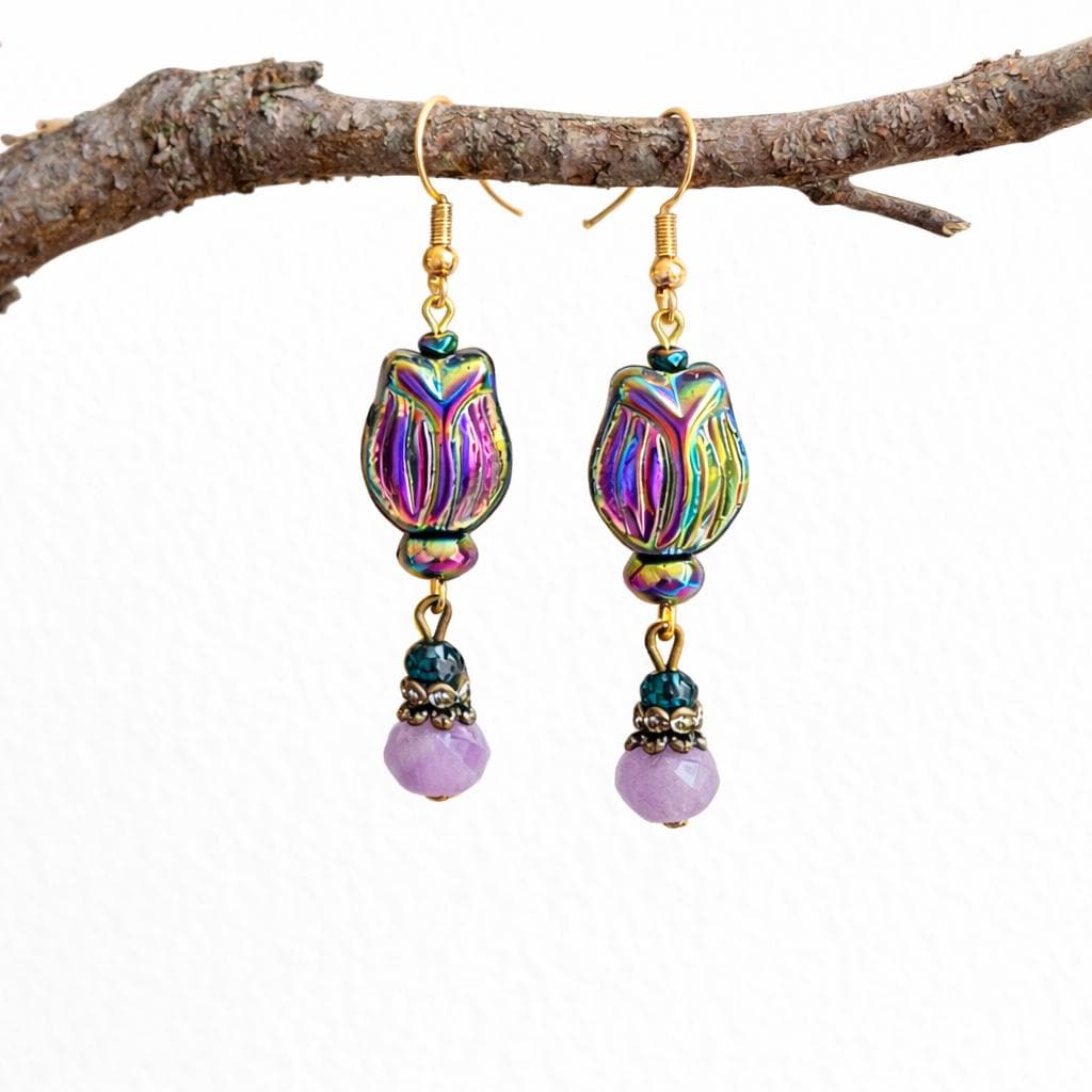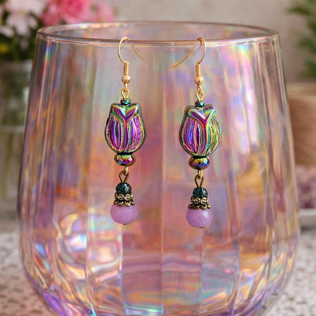 Rainbow Tulip Whisper Earrings | Metallic Tulip & Jade Gemstone Dangles | Rose Gold Hypoallergenic Earrings | Nature-Inspired Boho Jewelry