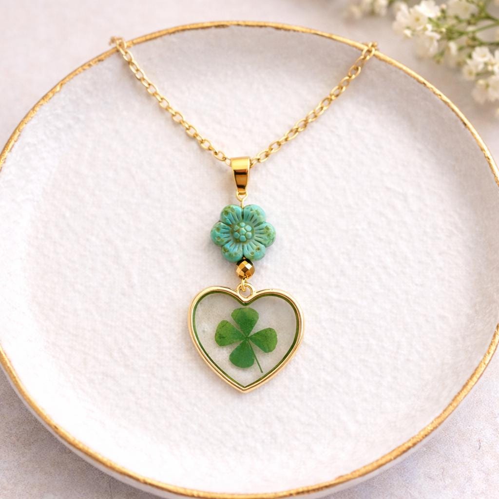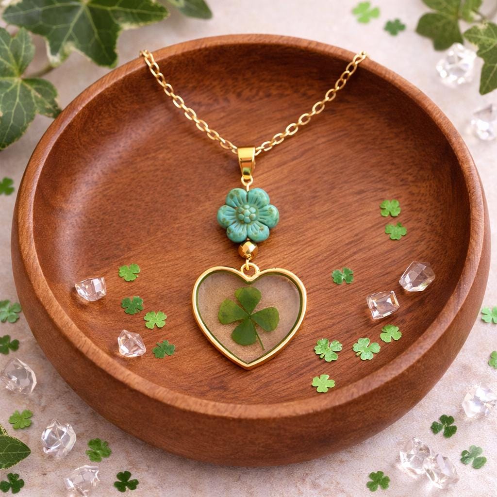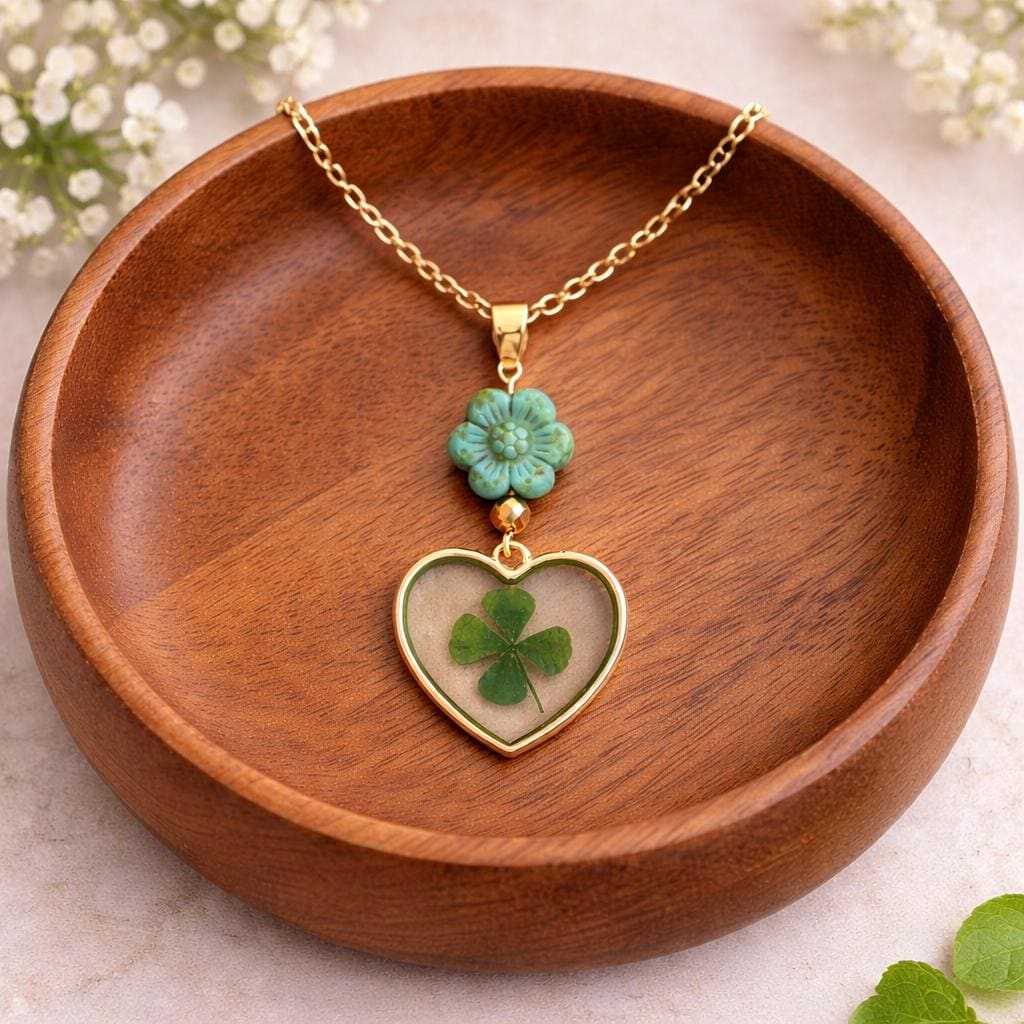 Clover Kissed Enchantment is a heartfelt necklace infused with gentle luck, love, and blessing energy! A real four-leaf clover rests inside a delicate heart-shaped resin pendant, symbolizing love kissed by fortune. Accented with a soft green Czech glass flower bead and a faceted gold hematite gemstone, this piece carries both grounding and uplifting energy—perfect for everyday wear or meaningful gifting.