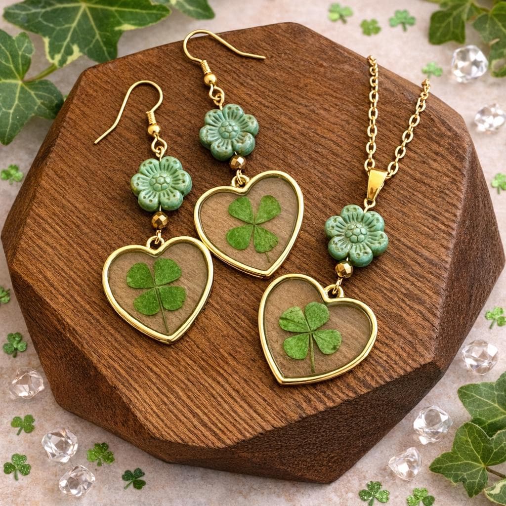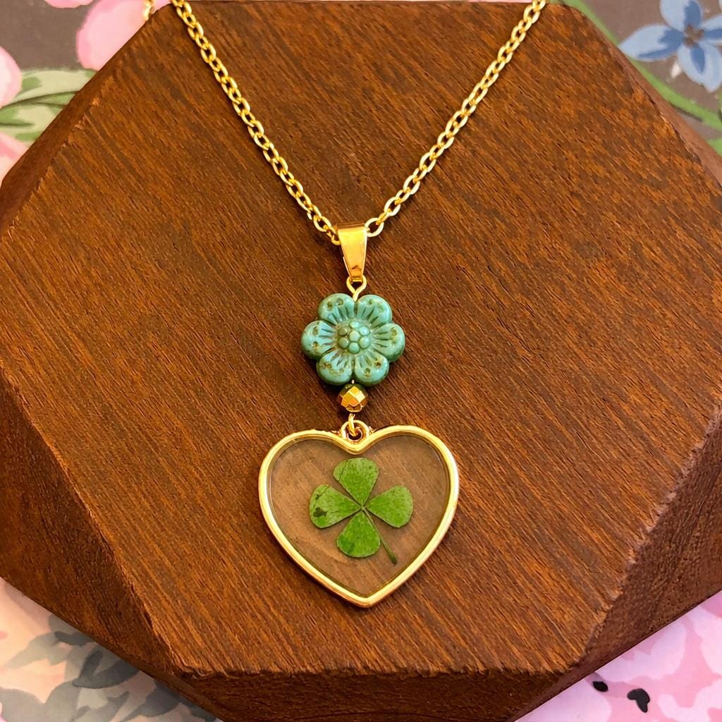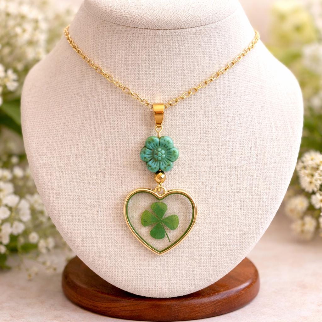Clover Kissed Enchantment is a heartfelt necklace infused with gentle luck, love, and blessing energy! A real four-leaf clover rests inside a delicate heart-shaped resin pendant, symbolizing love kissed by fortune. Accented with a soft green Czech glass flower bead and a faceted gold hematite gemstone, this piece carries both grounding and uplifting energy—perfect for everyday wear or meaningful gifting.