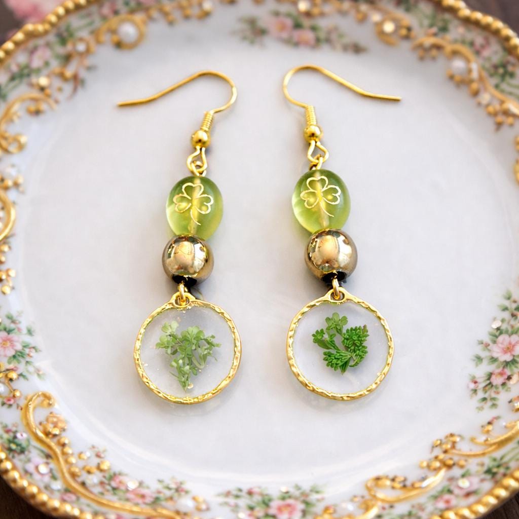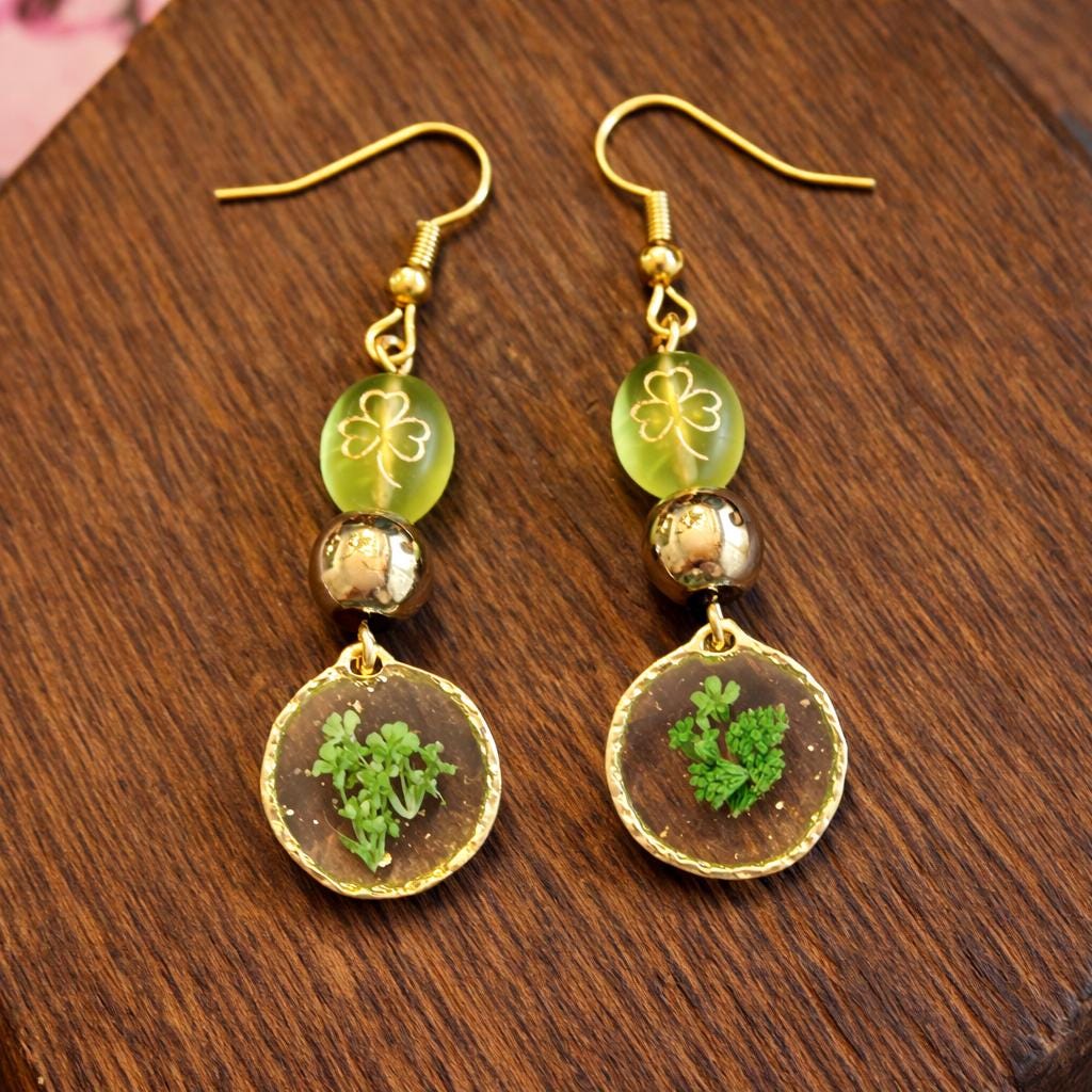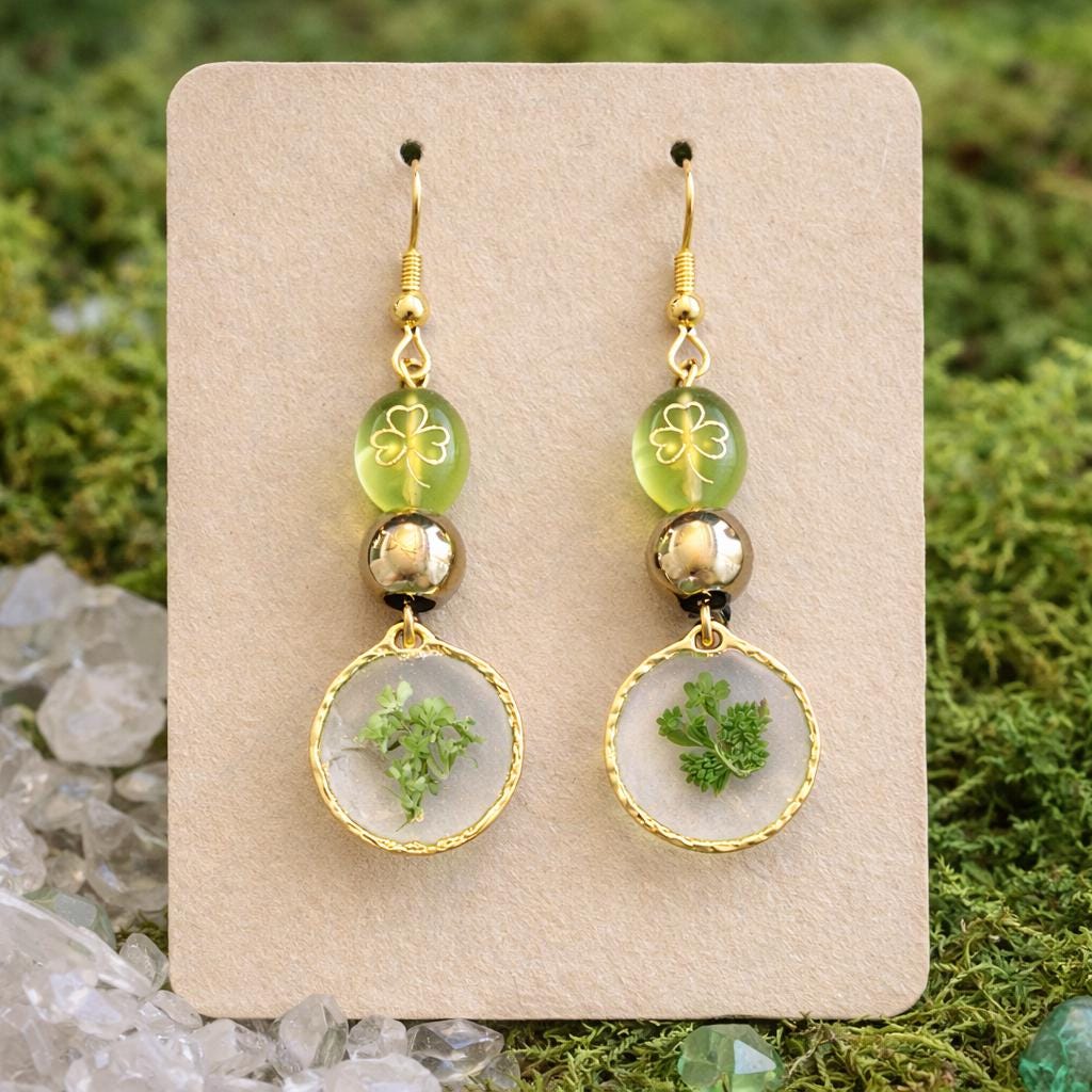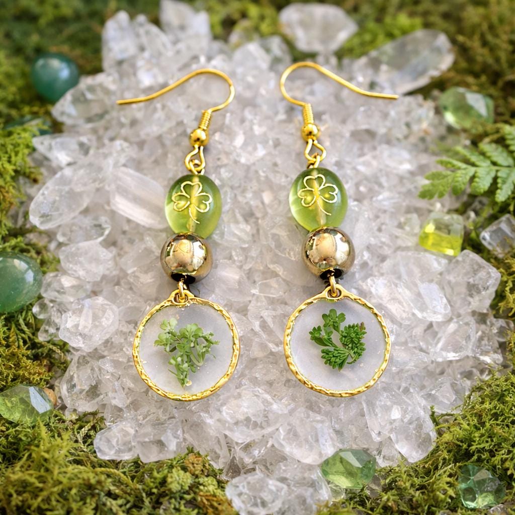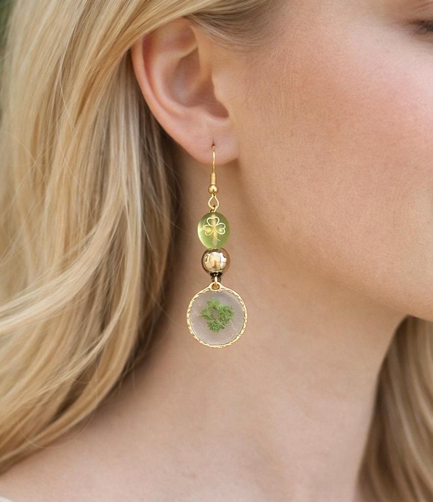 Enchanted Clover Earrings | Pressed Flower Dangle Earrings | Gold Shamrock Czech Glass | Gold Hematite | Hypoallergenic Gold Ear Wires | Nature Magic Jewelry