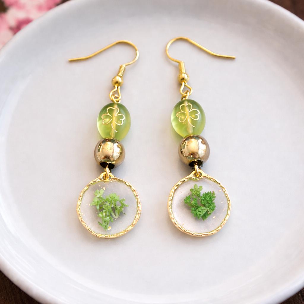 Pressed Flower Dangle Earrings | Gold Shamrock, Hematite | Hypoallergenic Ear Wires