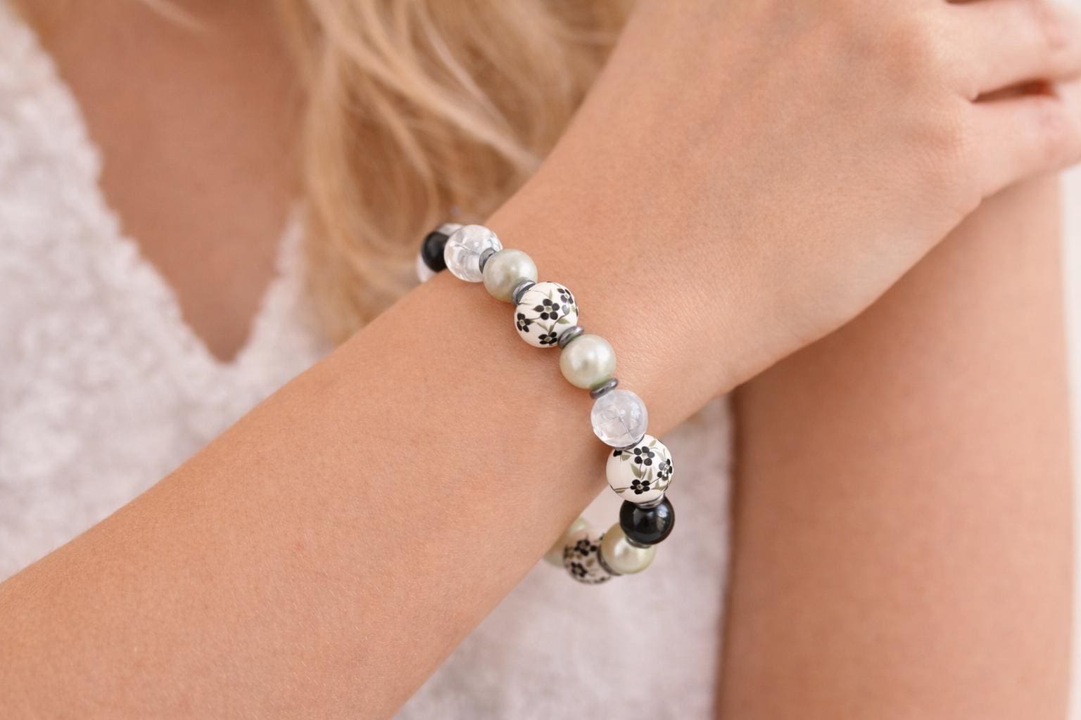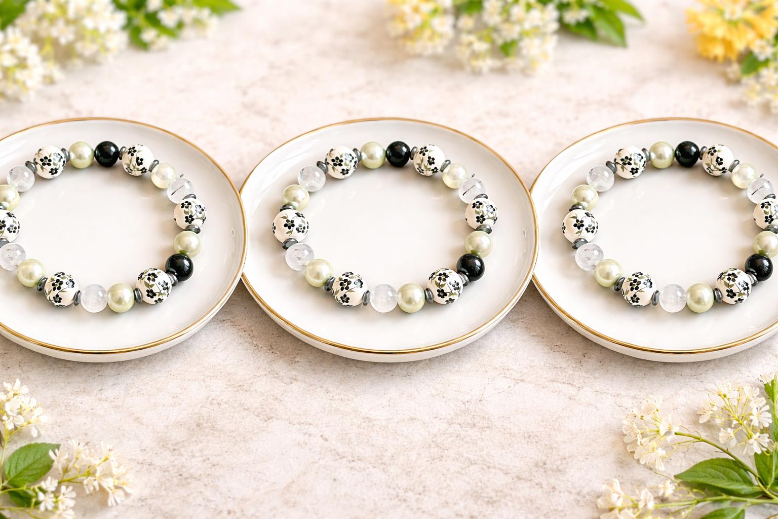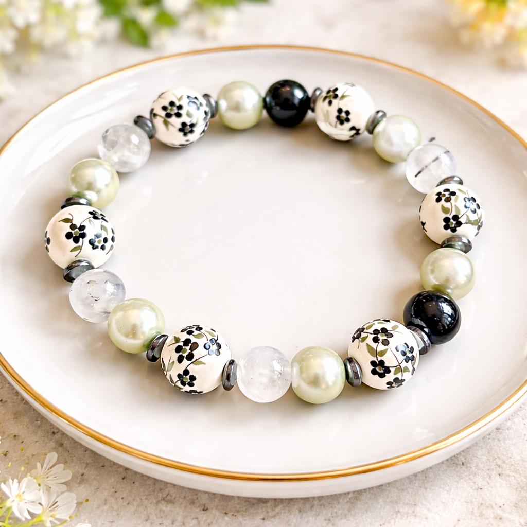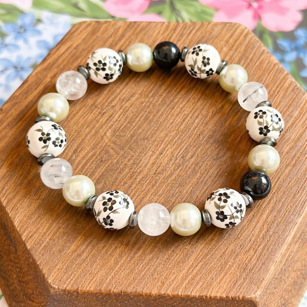Blooming Midnight is a bracelet inspired by moonlit gardens in quiet bloom! Black and white ceramic flower beads bring timeless floral beauty, while faux pearls add a soft, luminous glow. Tourmalinated quartz and silver hematite provide grounding and protective energy, creating a piece that feels both calming and empowering.