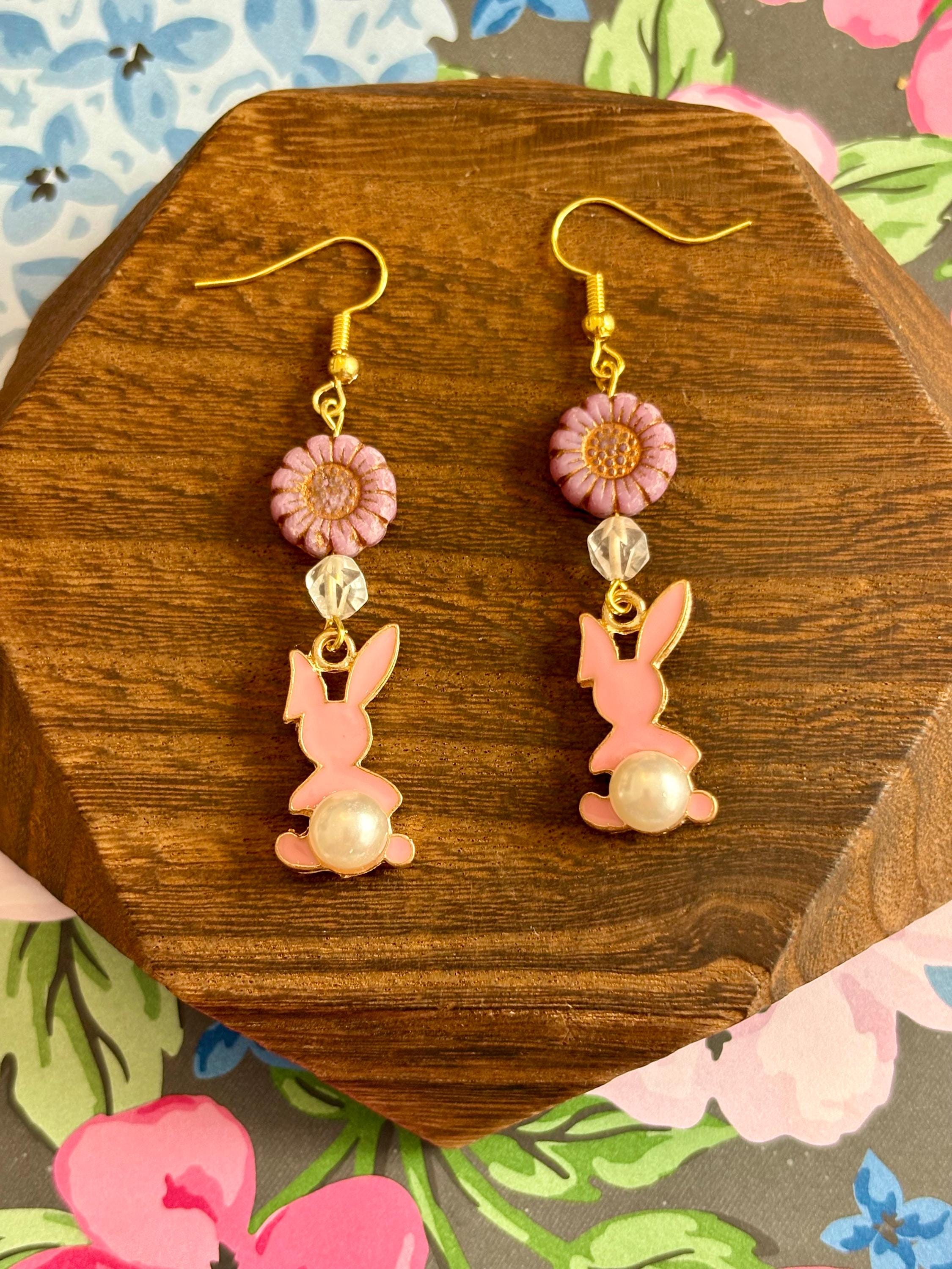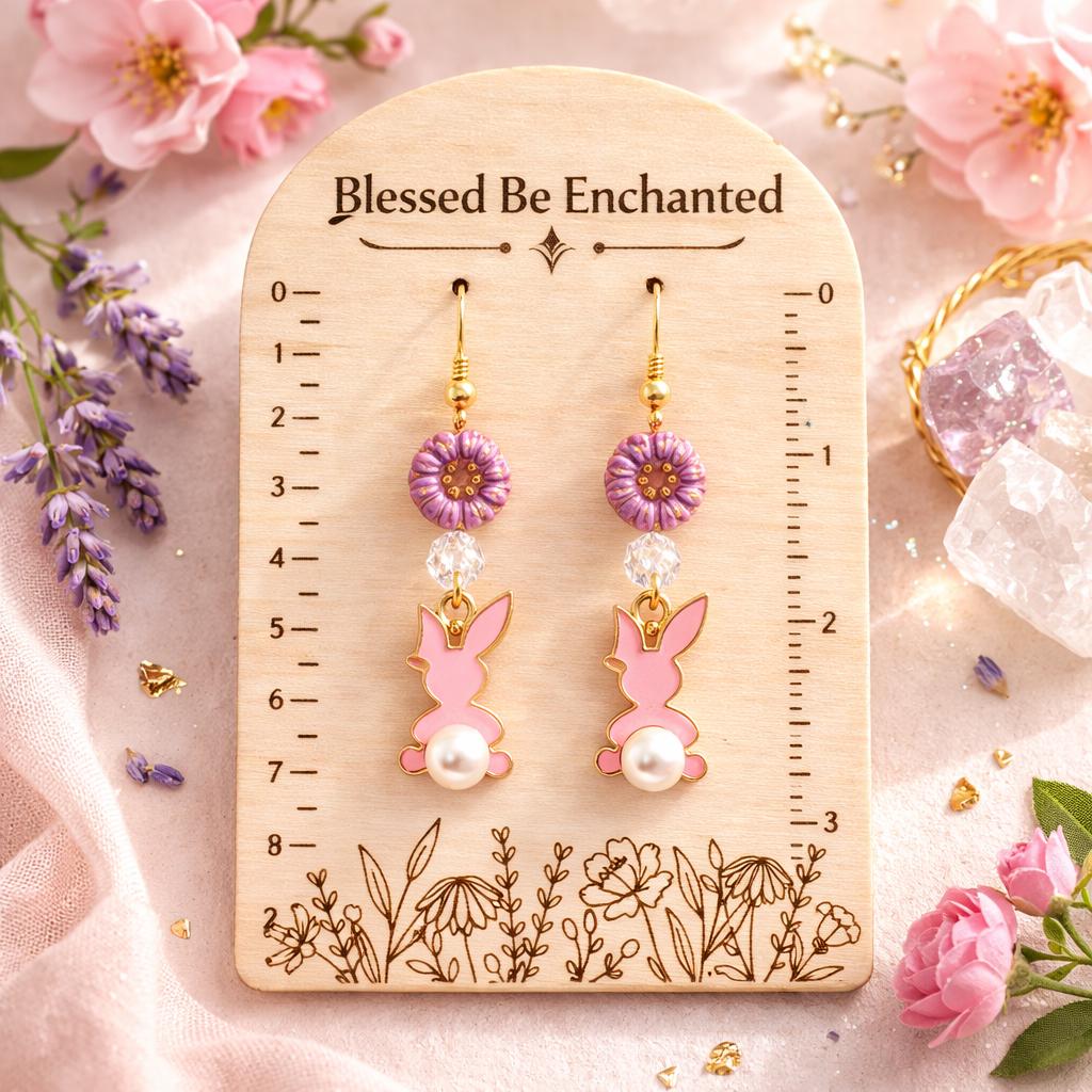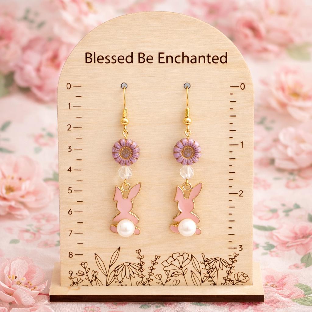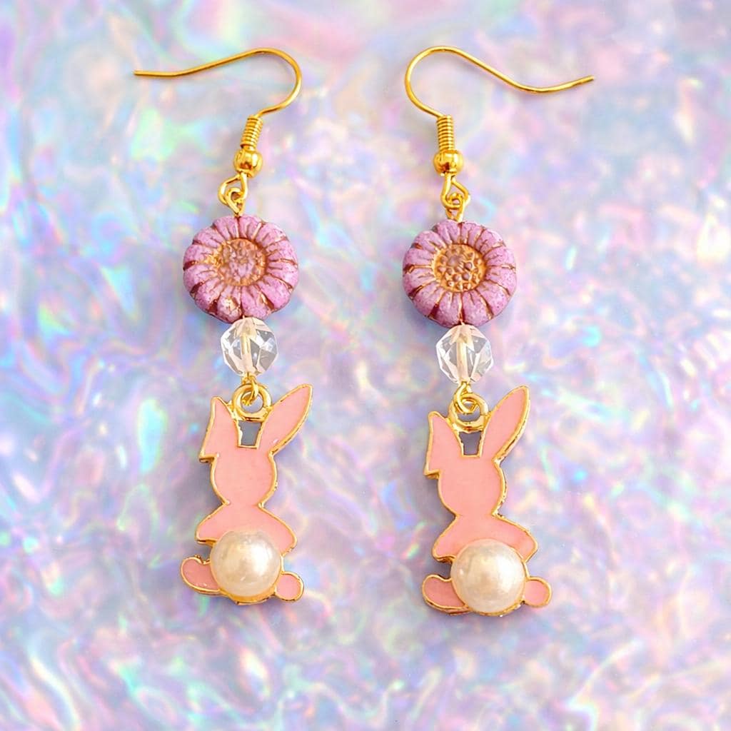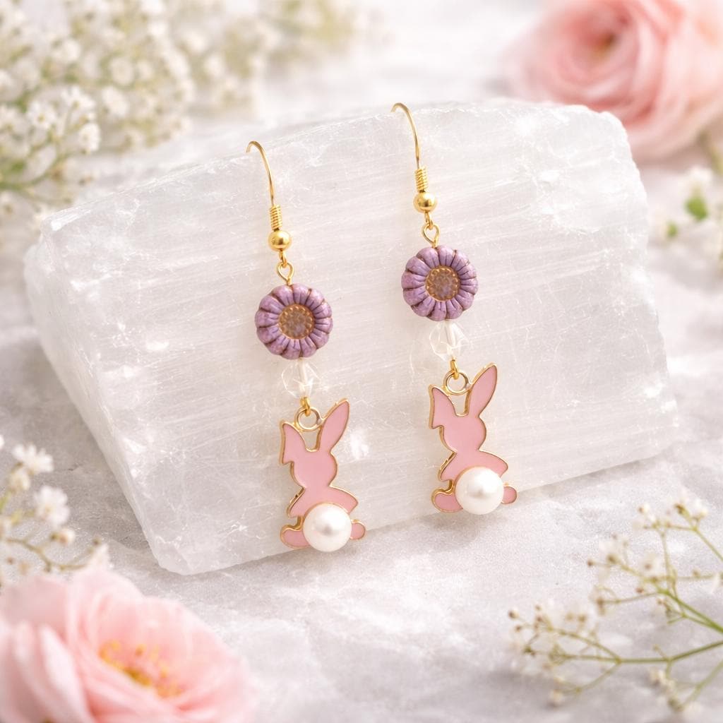 These Roseblossom Bunny Pearl Earrings are a tender celebration of love, renewal, and soft feminine strength! Featuring star-cut Rose Quartz gemstones, delicate Czech glass sunflower beads, and charming pink enamel bunny charms with pearl tails, they radiate gentle heart-centered energy.