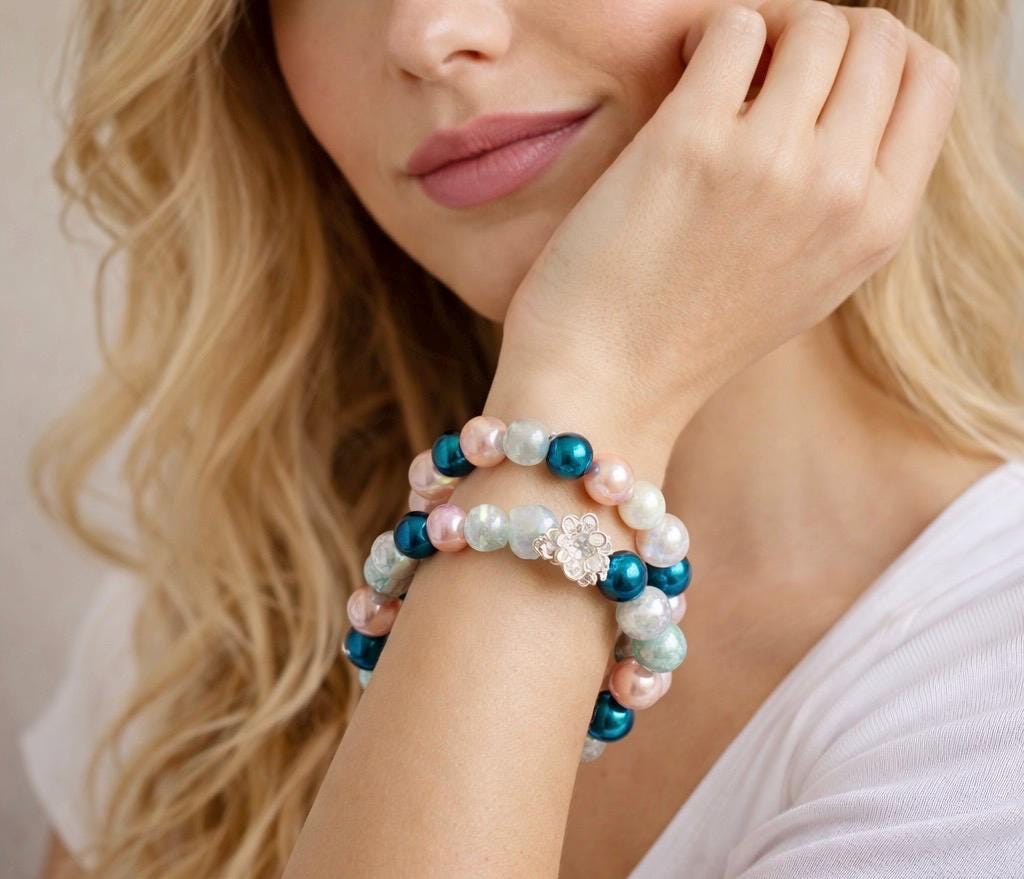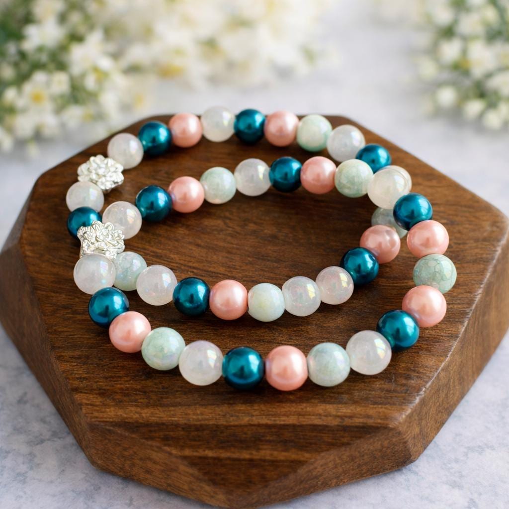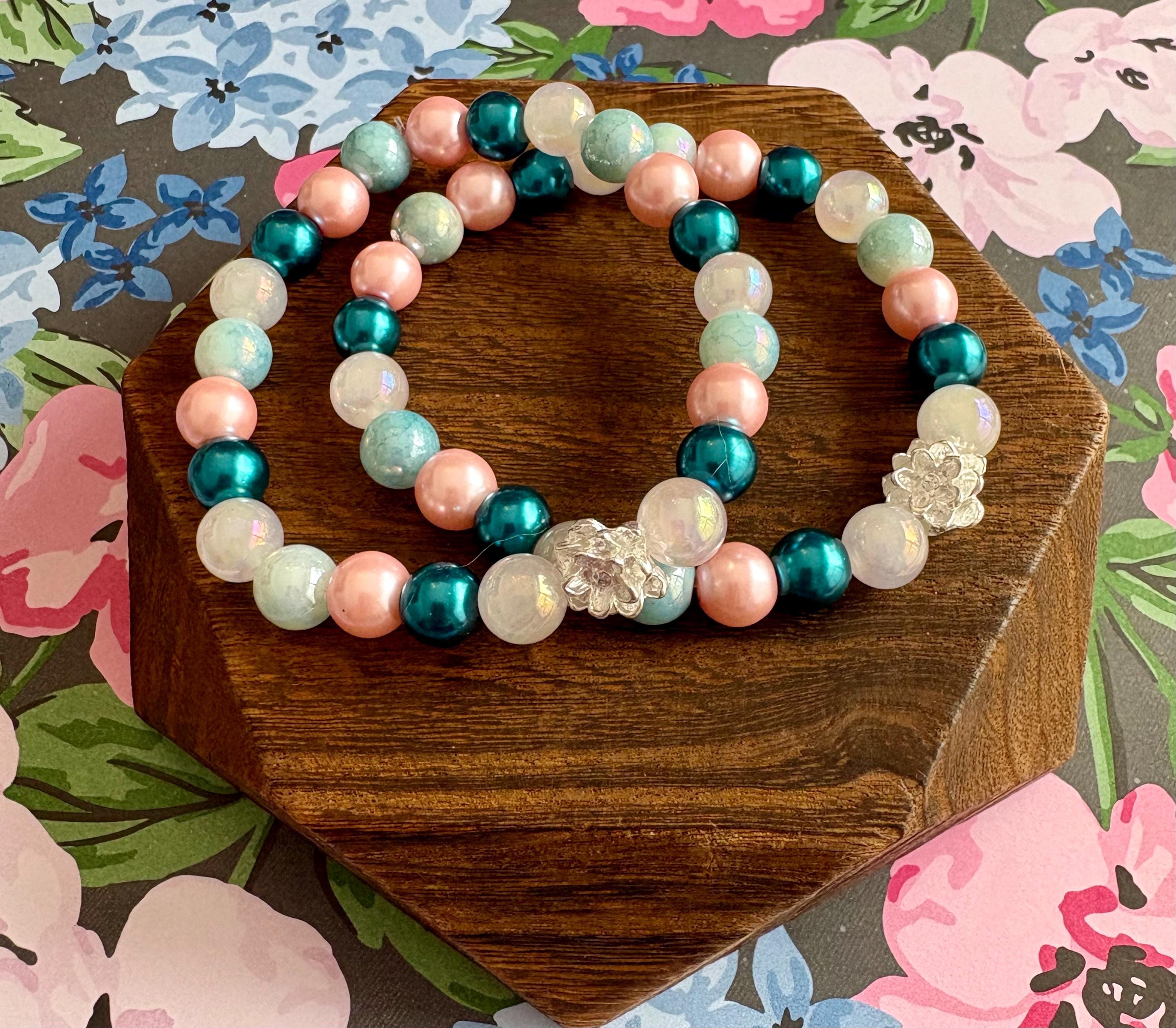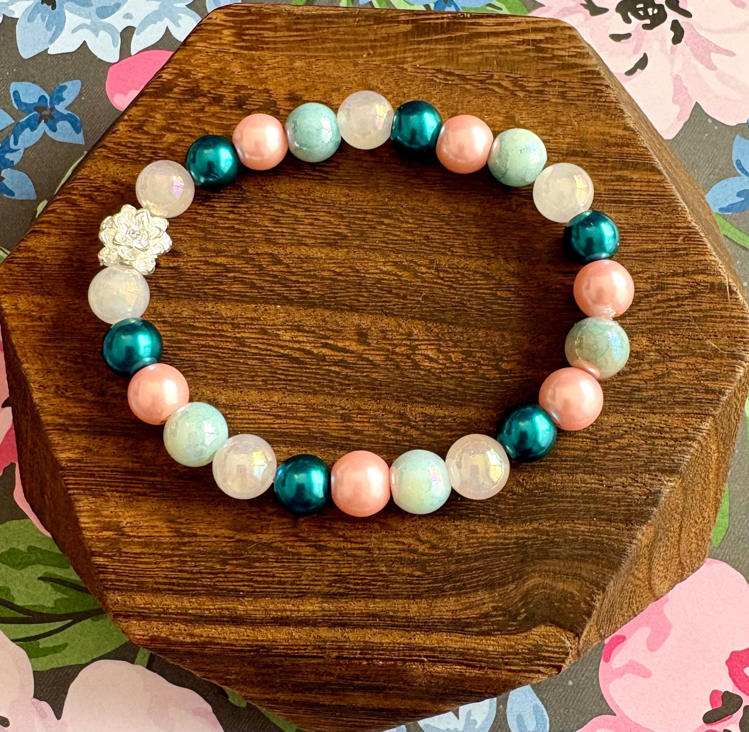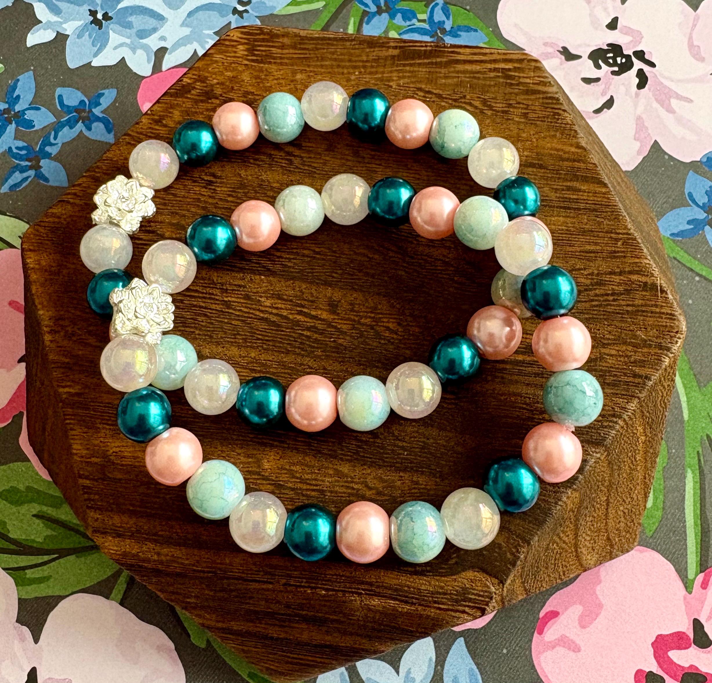 This serene and uplifting stretch bracelet blends soft mystic rose quartz, luminous metallic pearls, shimmering electroplated teal beads, and a delicate lotus flower bead — creating a piece that feels like calm ocean tides meeting blooming inner peace!