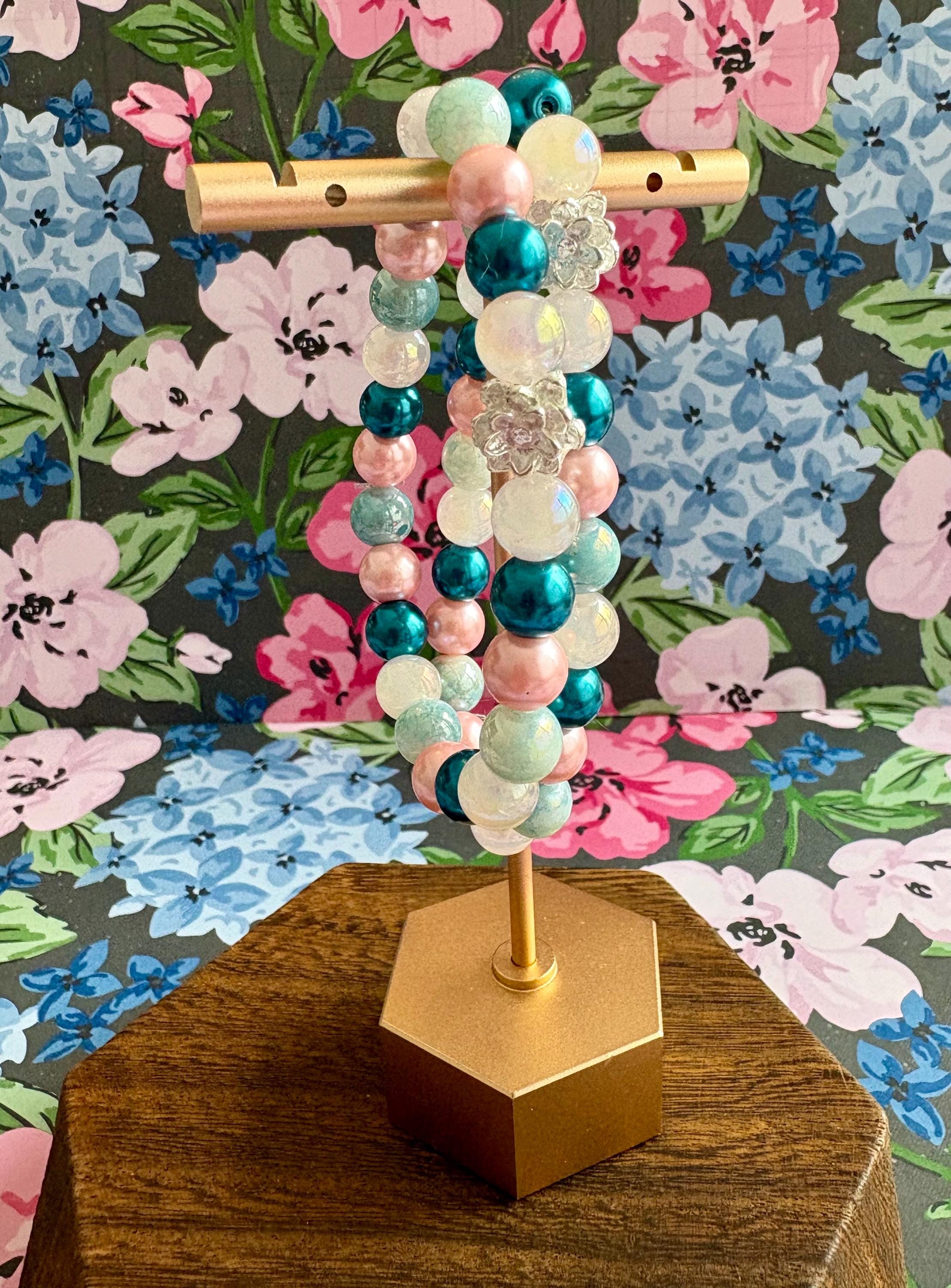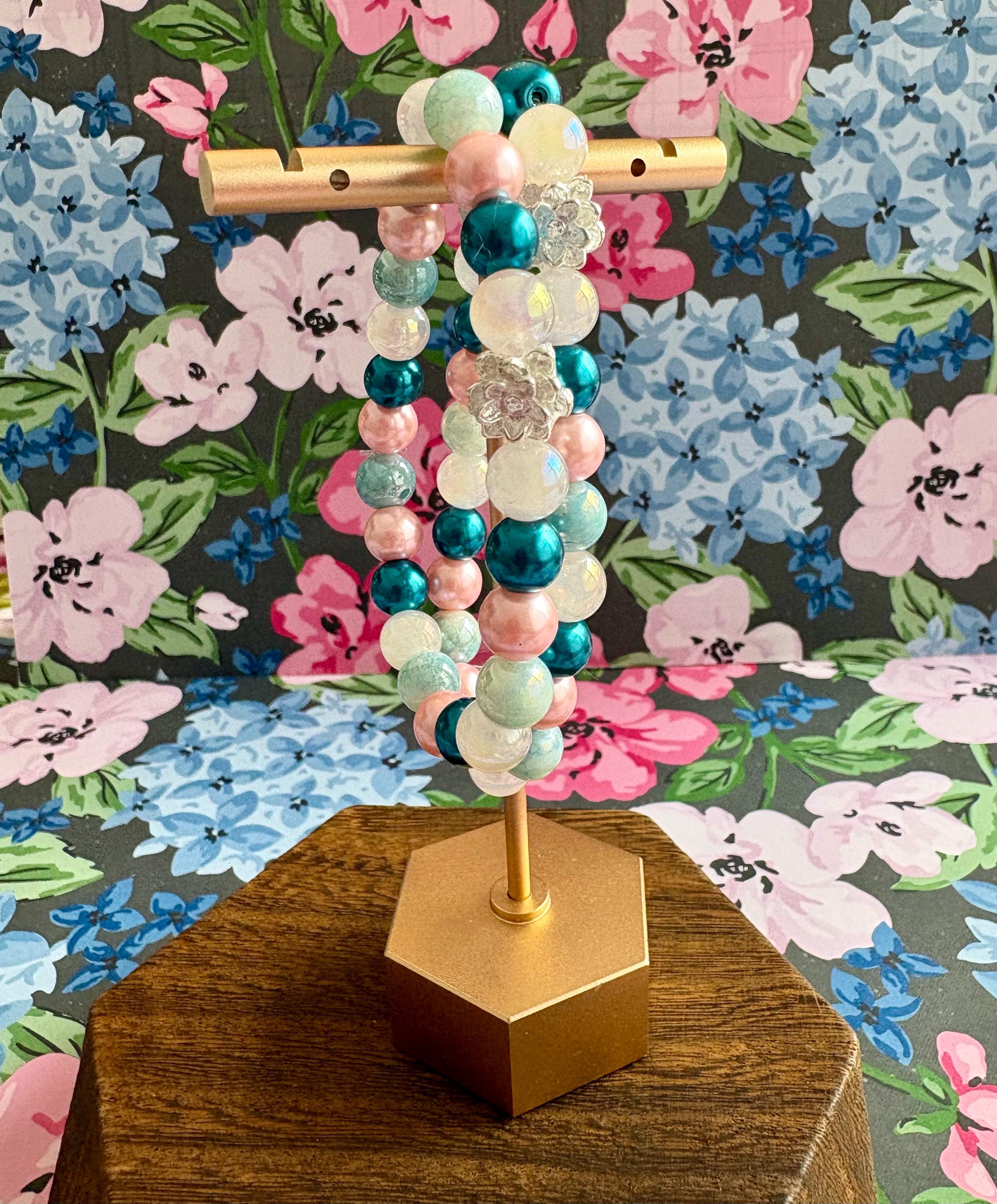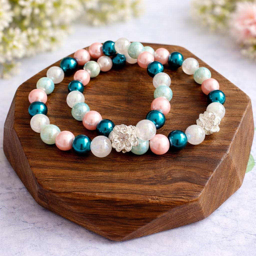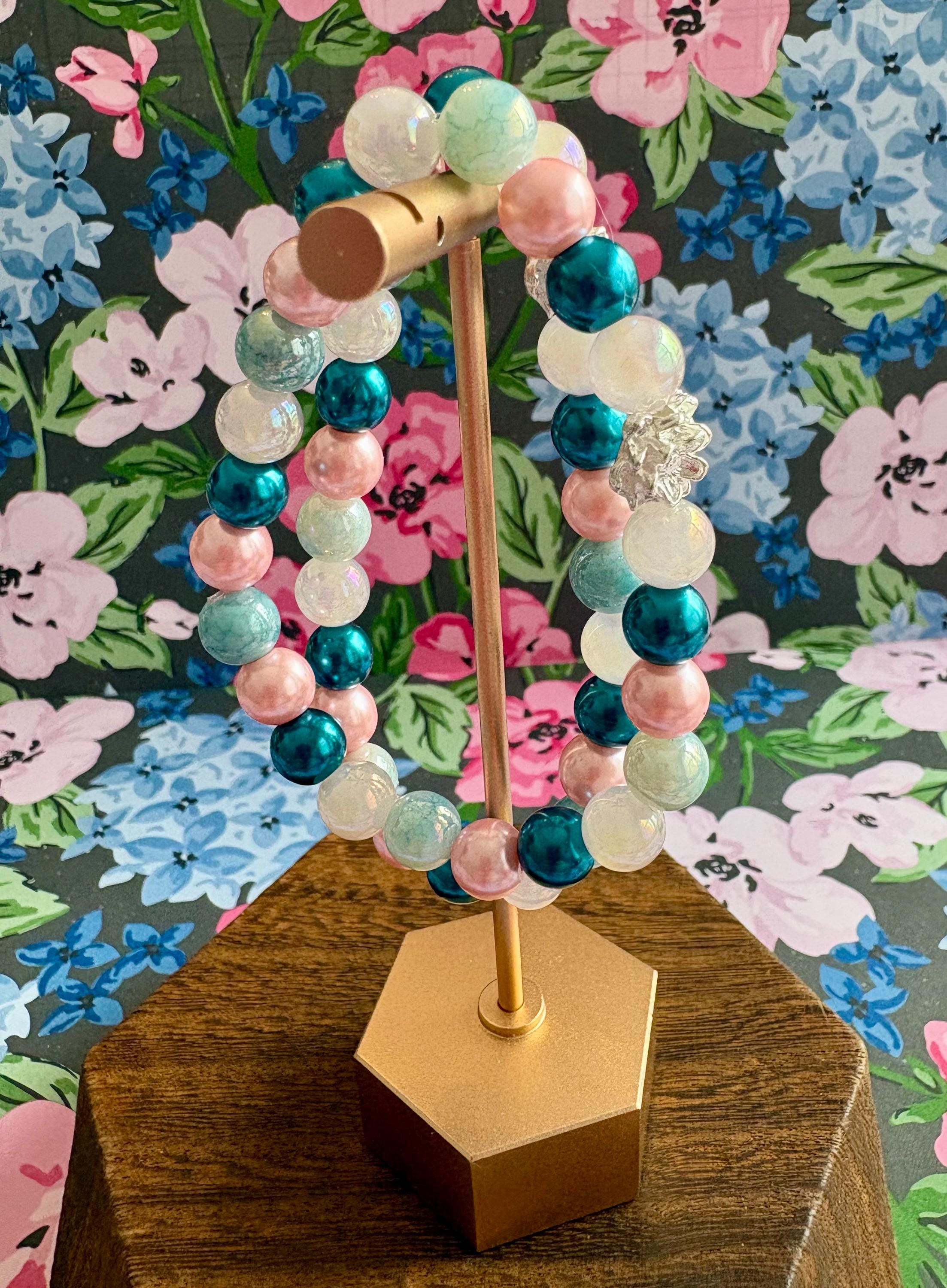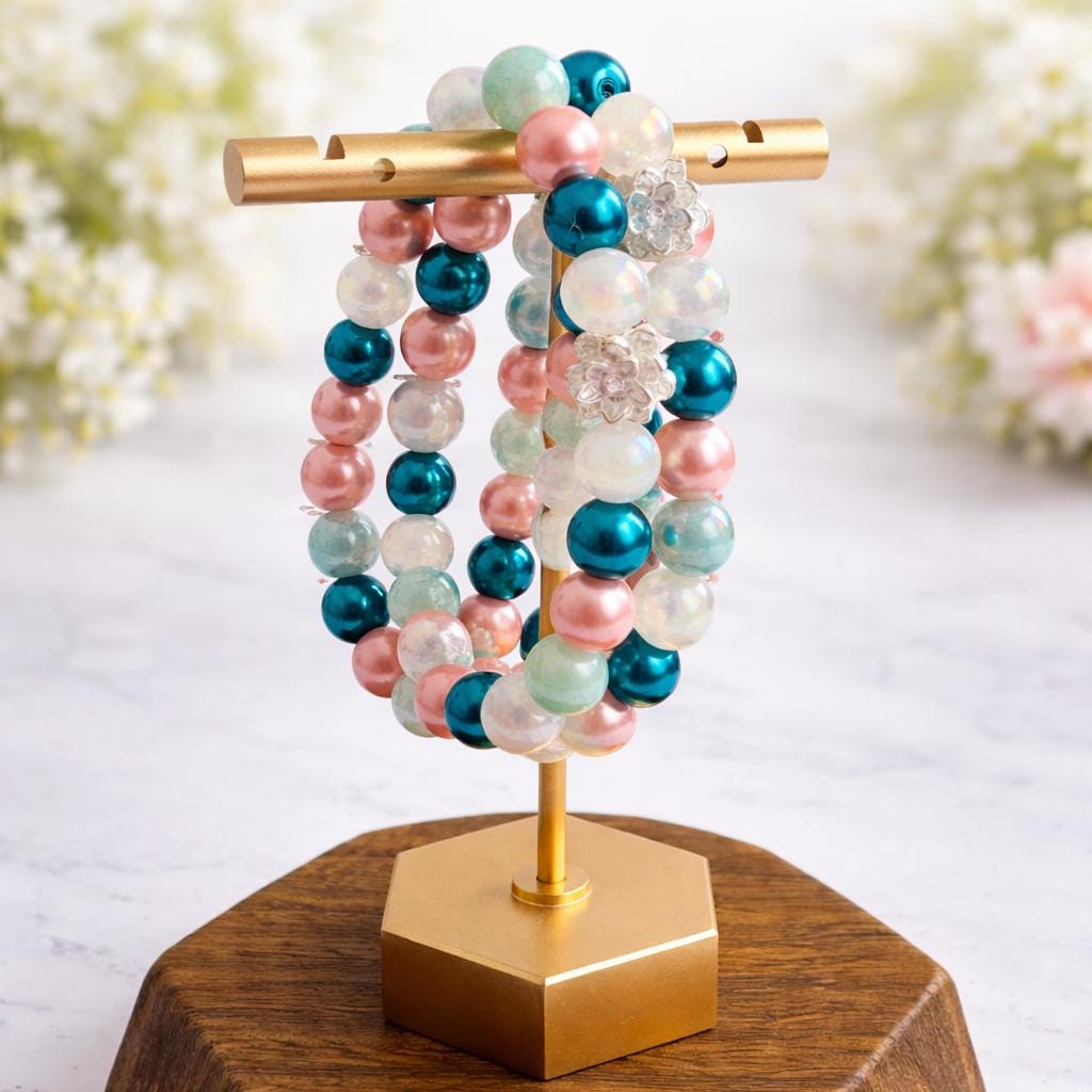 This serene and uplifting stretch bracelet blends soft mystic rose quartz, luminous metallic pearls, shimmering electroplated teal beads, and a delicate lotus flower bead — creating a piece that feels like calm ocean tides meeting blooming inner peace!