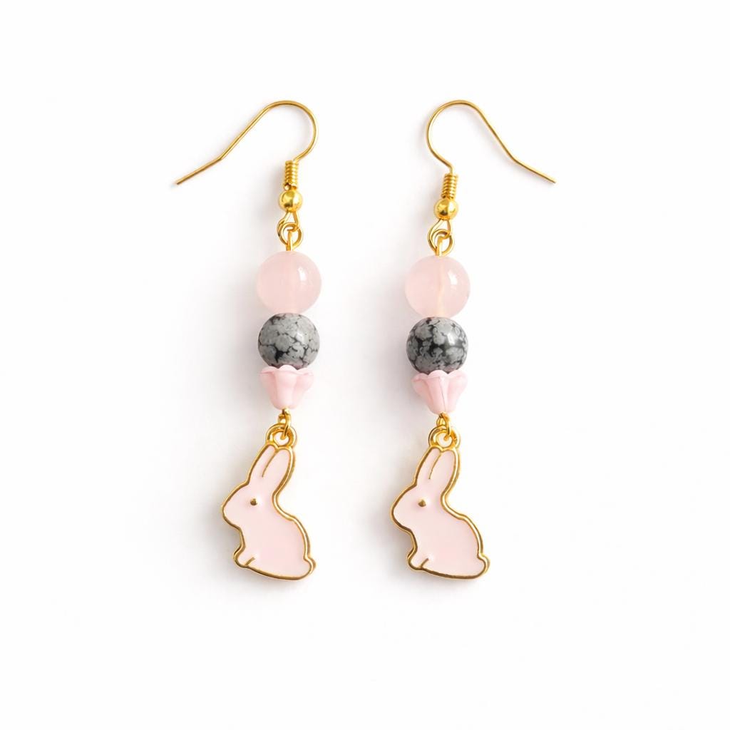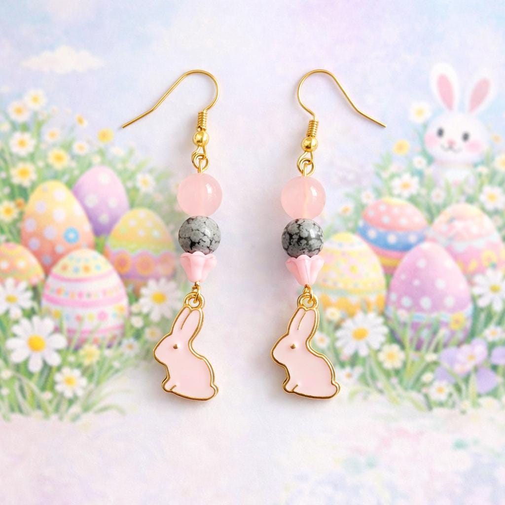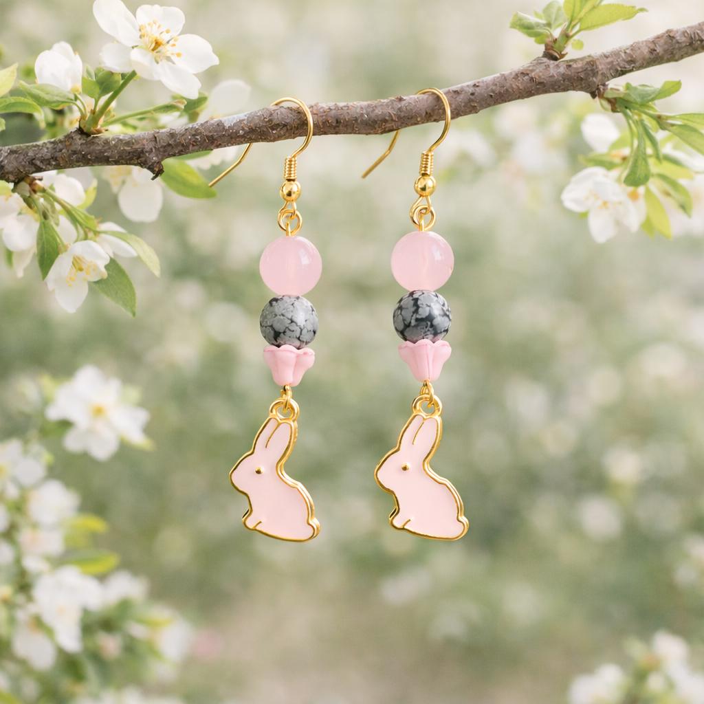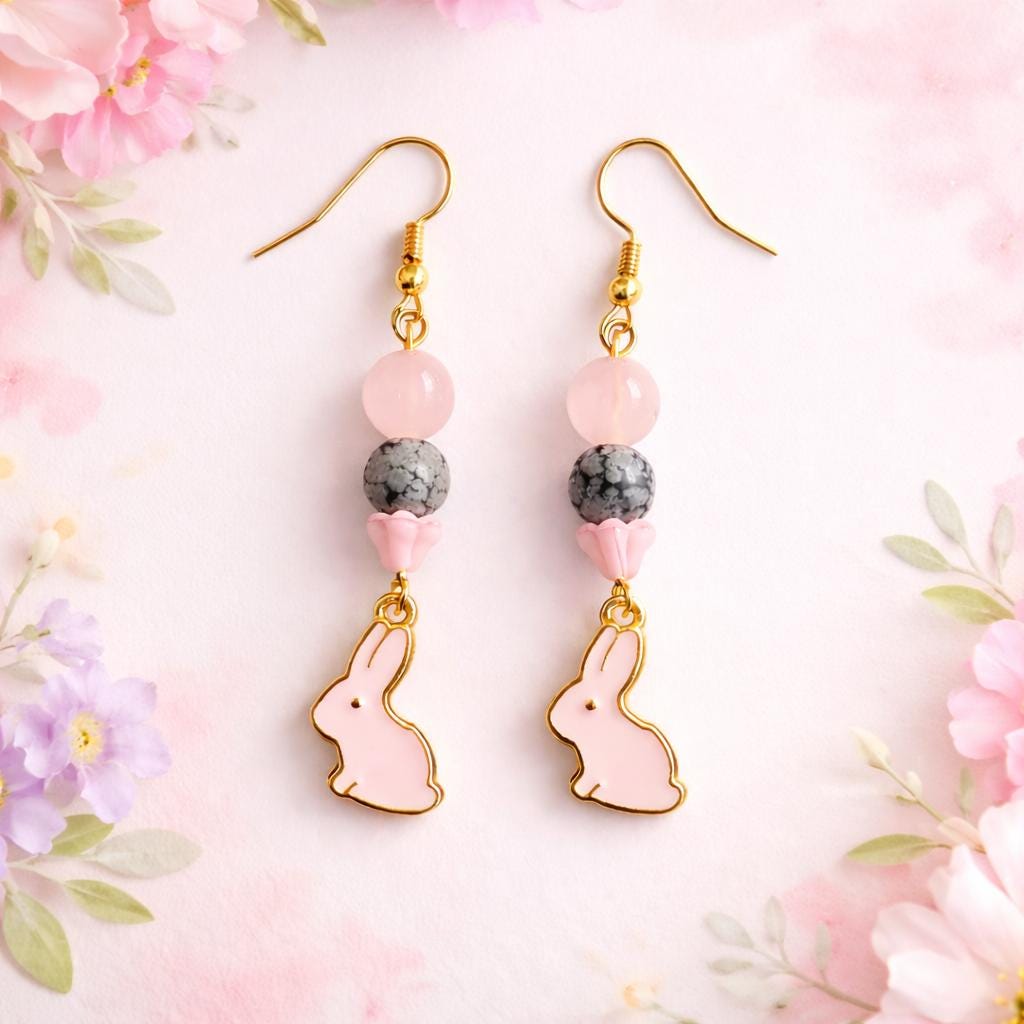 These enchanting gemstone dangle earrings are a celebration of spring renewal, heart healing, and grounded feminine energy. Featuring grounding snowflake obsidian, nurturing rhodonite, and soft pink jade, these earrings are finished with delicate blush flower beads and the sweetest enamel pink bunny charms.