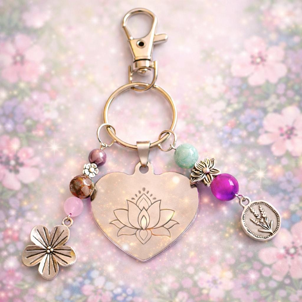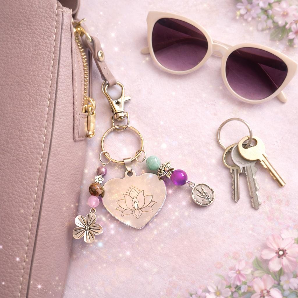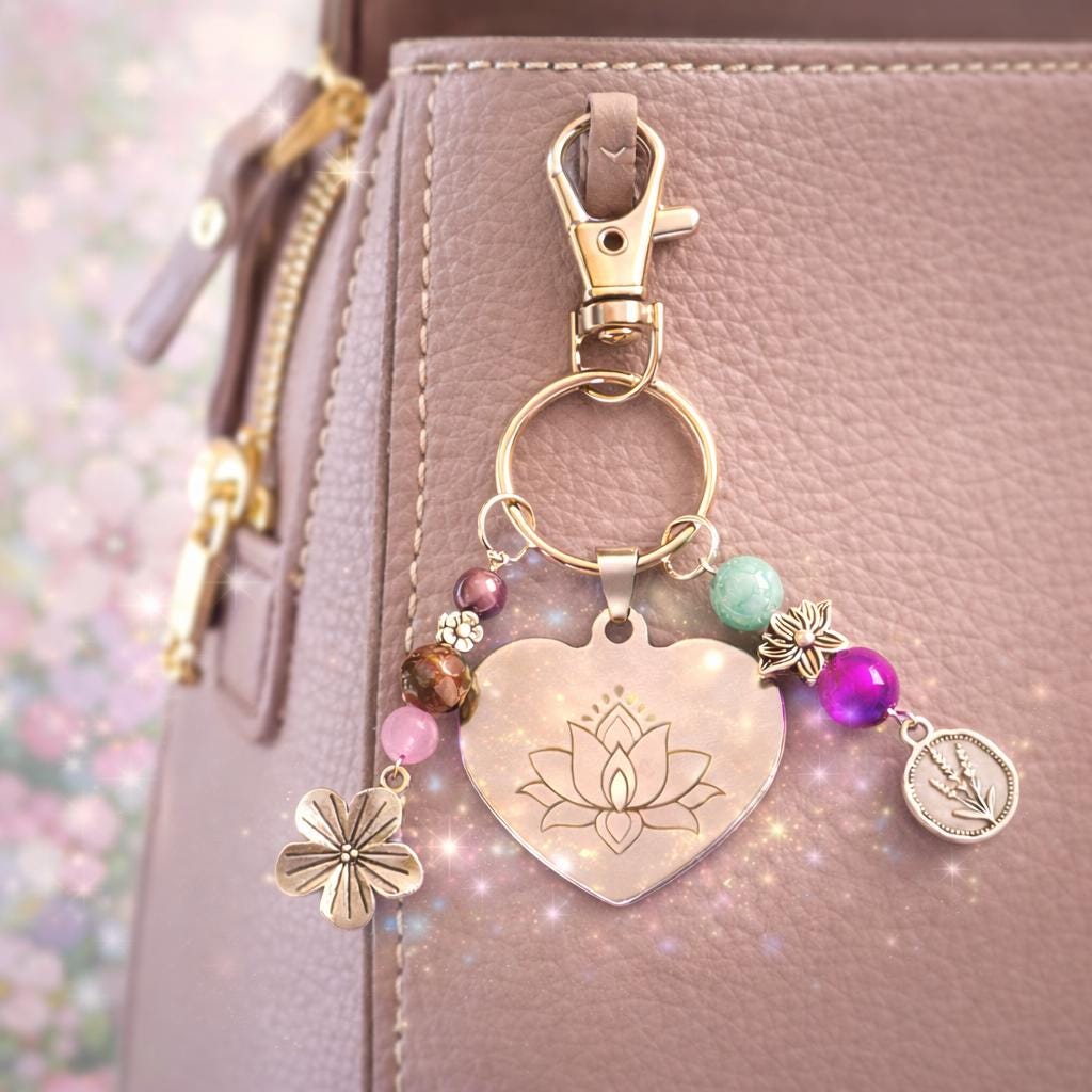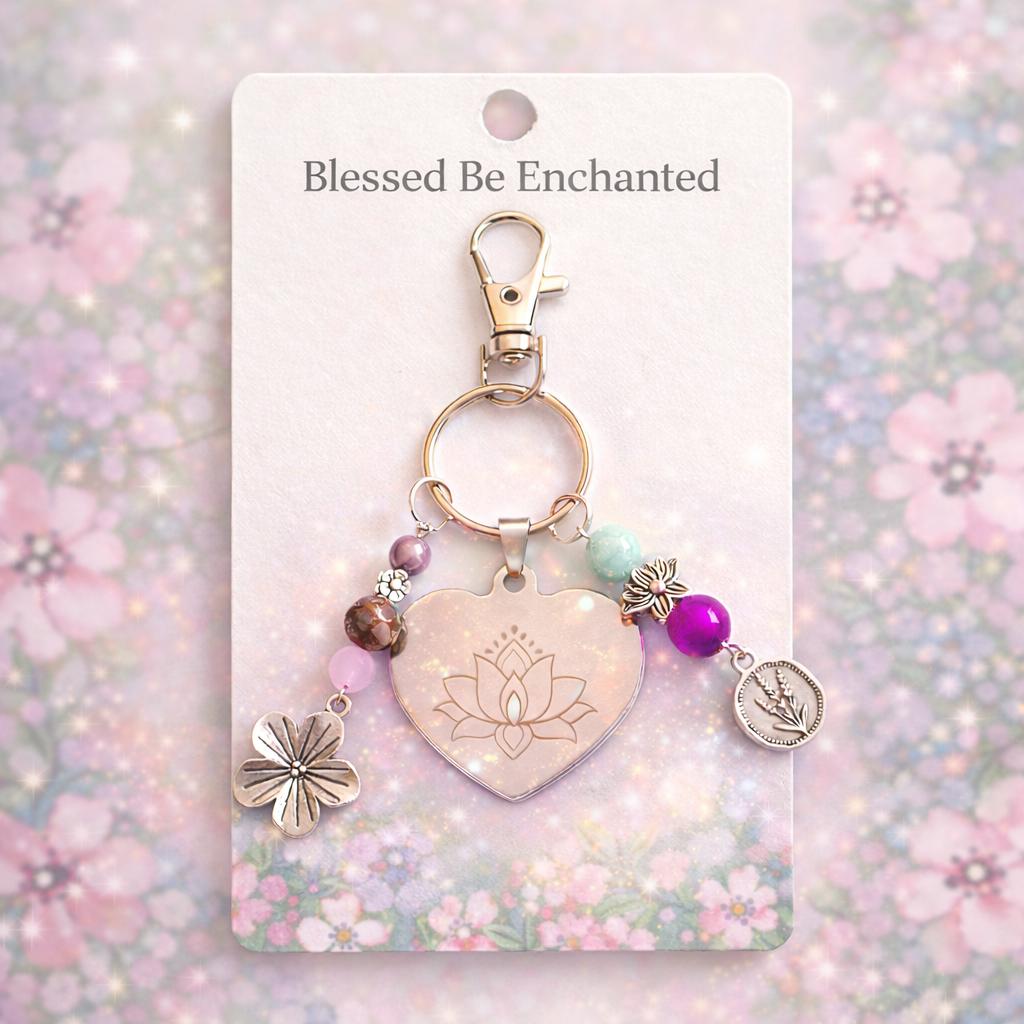 Adorned with mystical gemstones, florals, and soft metallic accents, this piece is both meaningful and elegant — perfect for your purse, keys, tote, or spiritual altar bag.