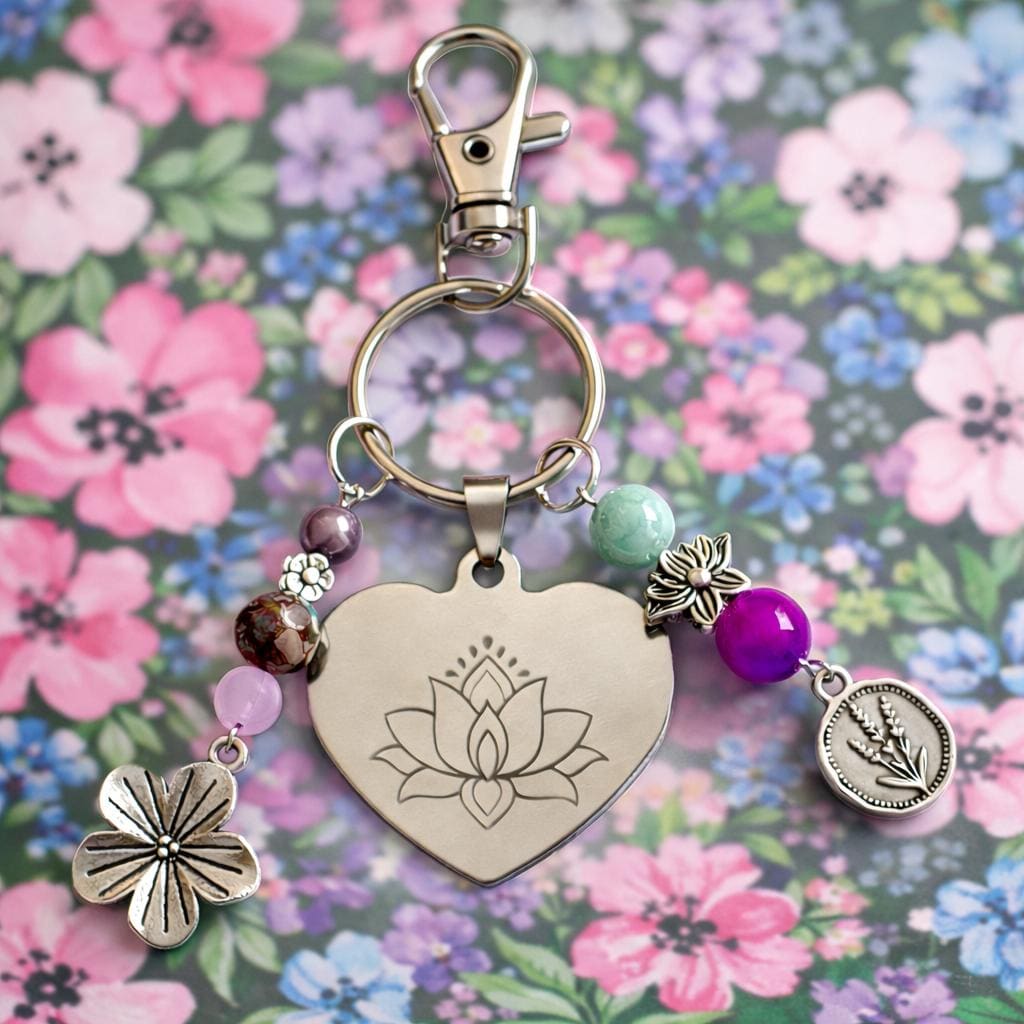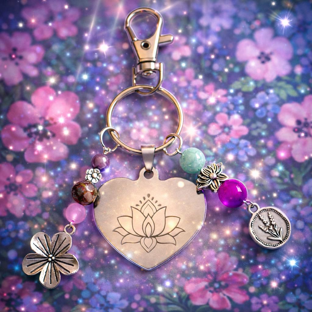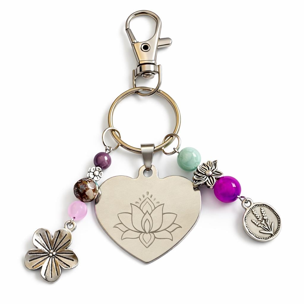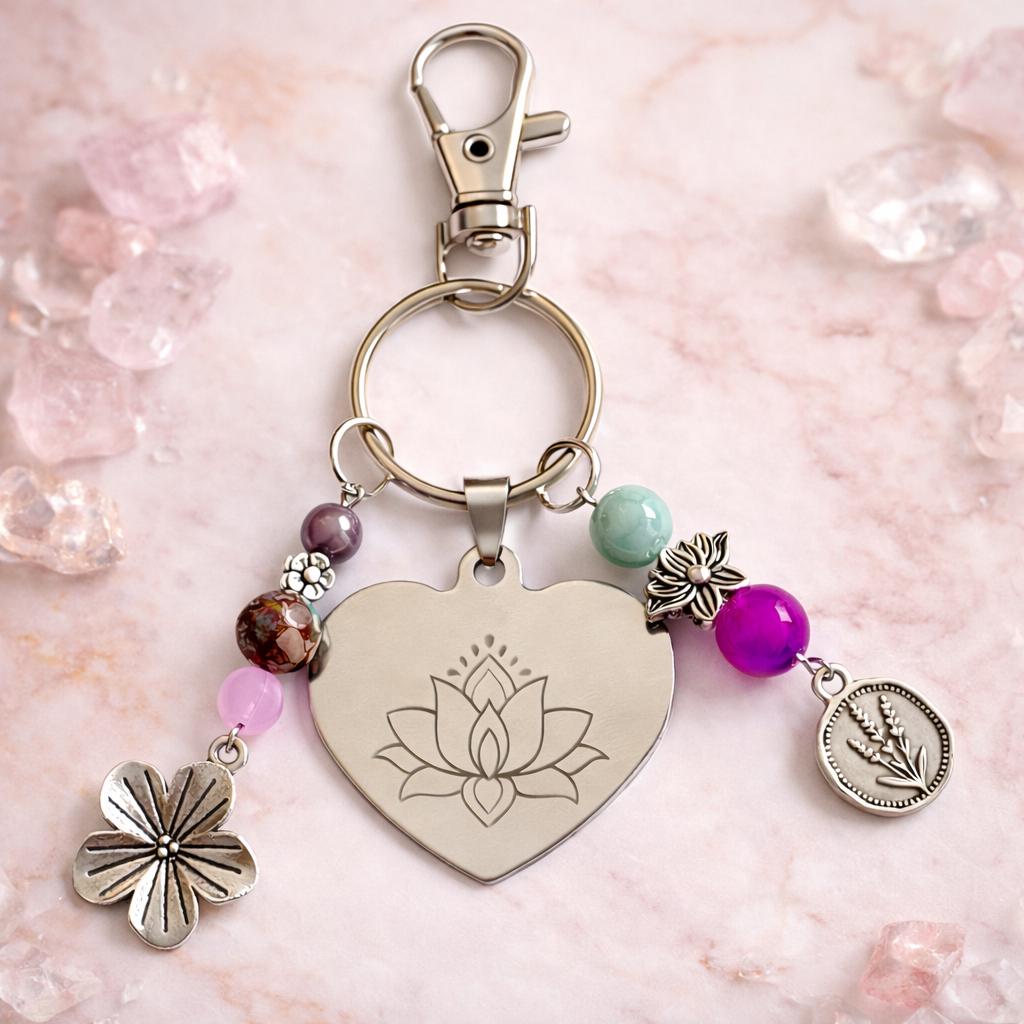 Lotus Heart Keychain – Sugilite, Jasper, Quartz Gemstone Charm – Silver Engraved Spiritual Gift