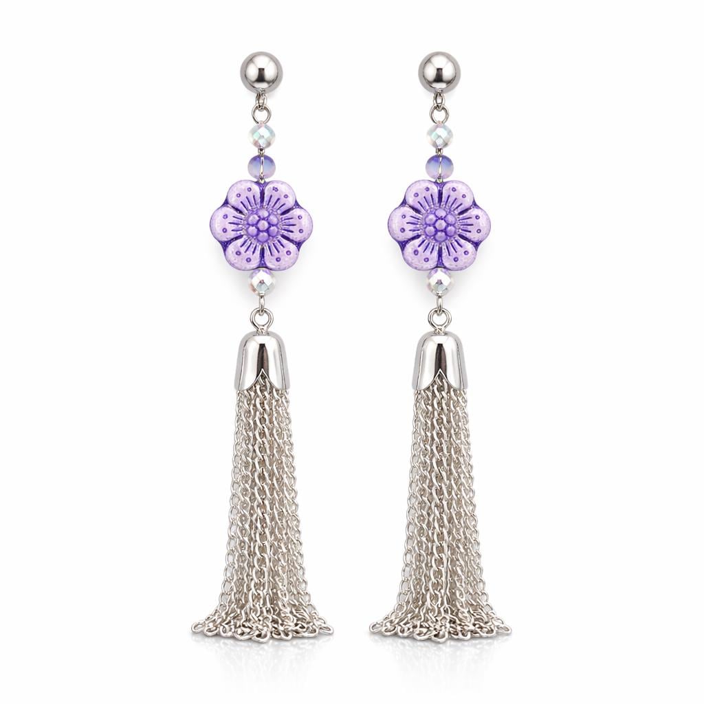 Violet Petal Serenity Tassel Earrings – Czech Glass Flower, Silver Hematite, AB Crystal Beads, Stainless Steel Post, Boho Goddess Drops