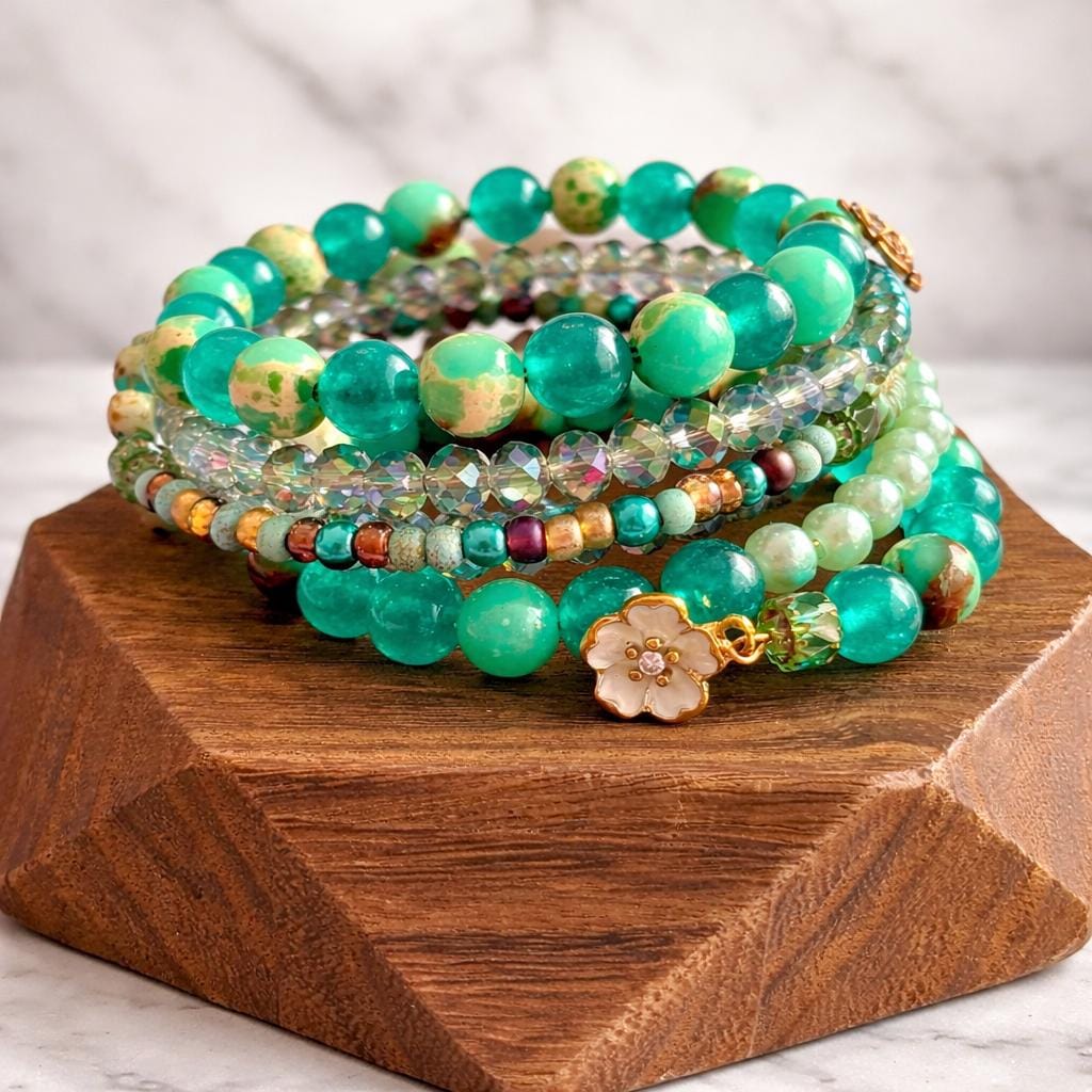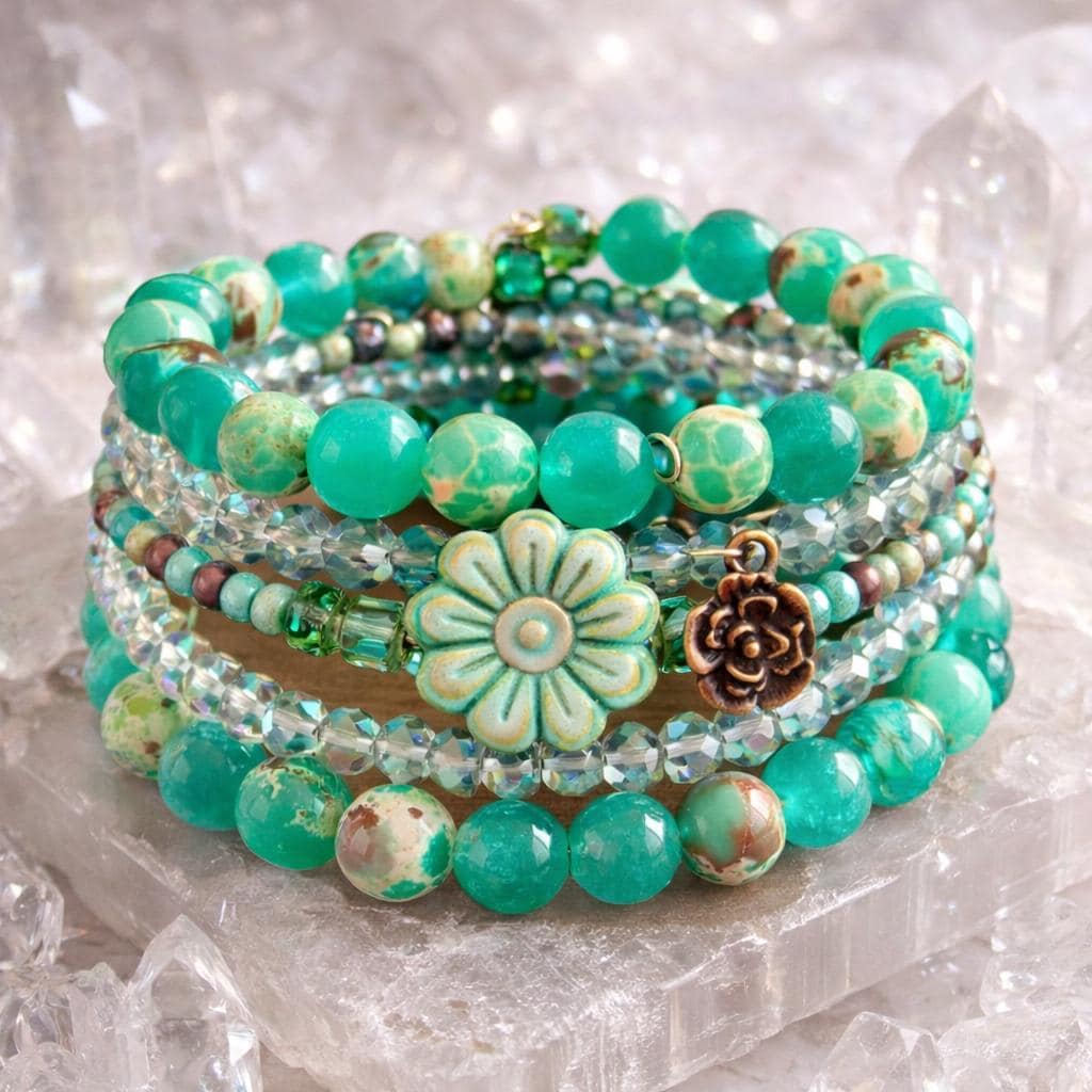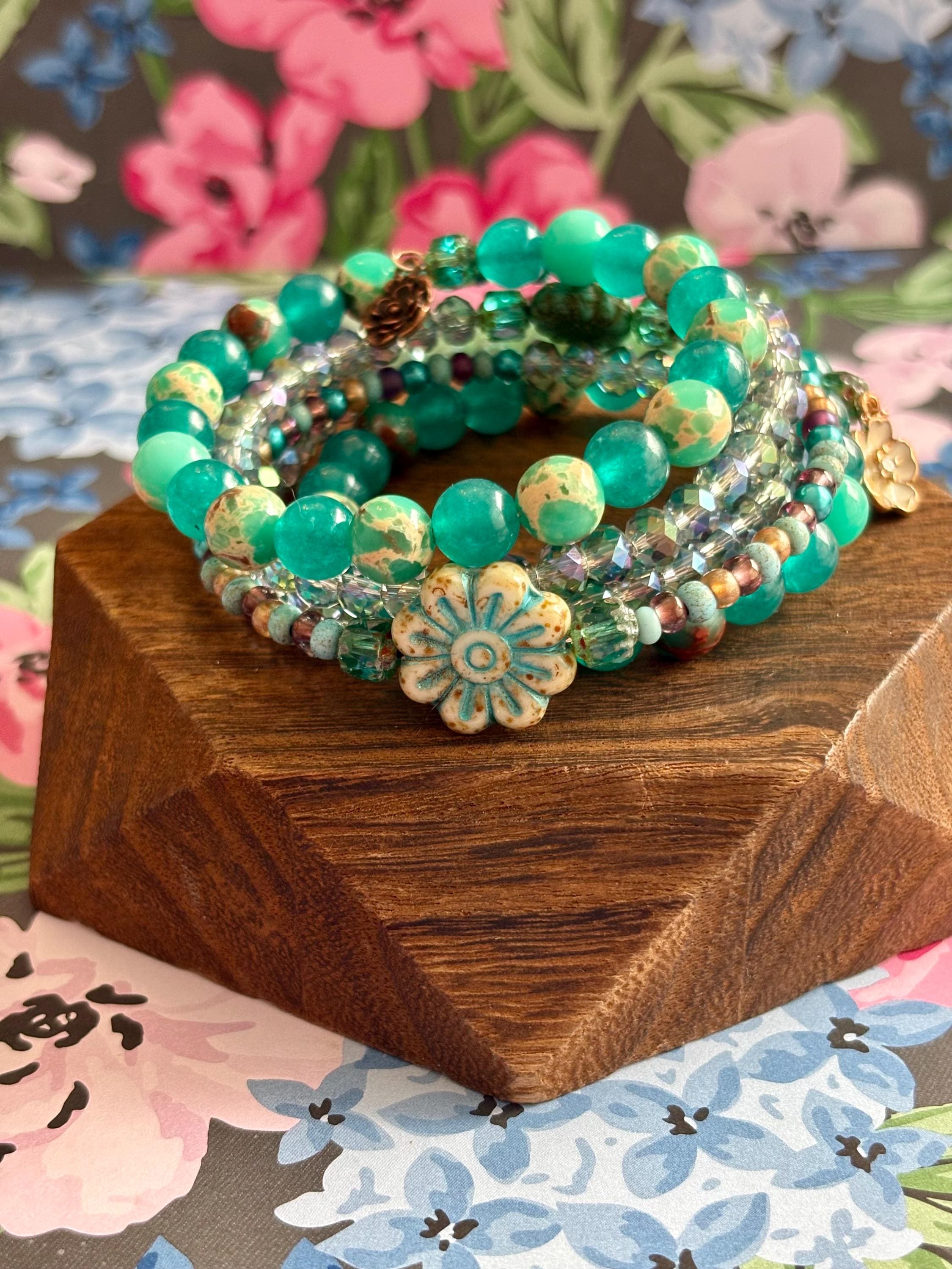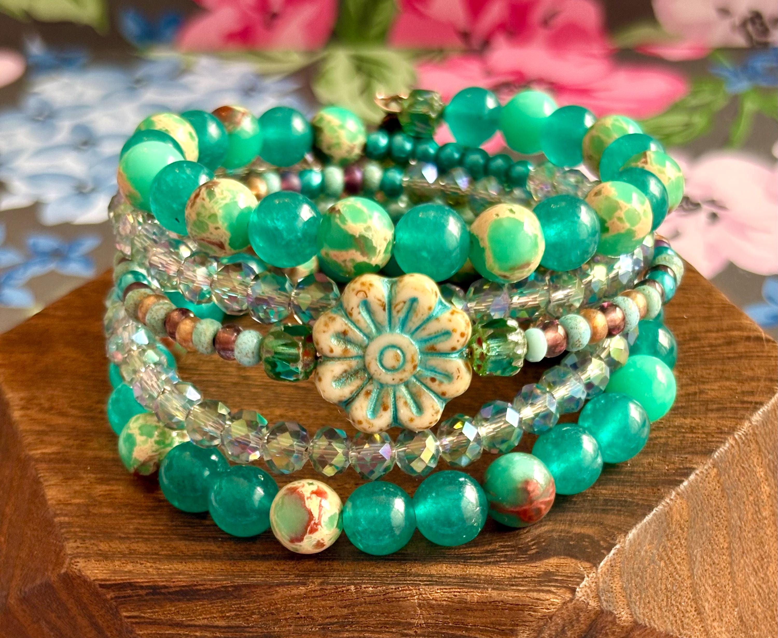 Teal Meadow Bloom Coil Wrap Bracelet – Jade, Czech Glass Daisy, AB Crystal, Floral Stack