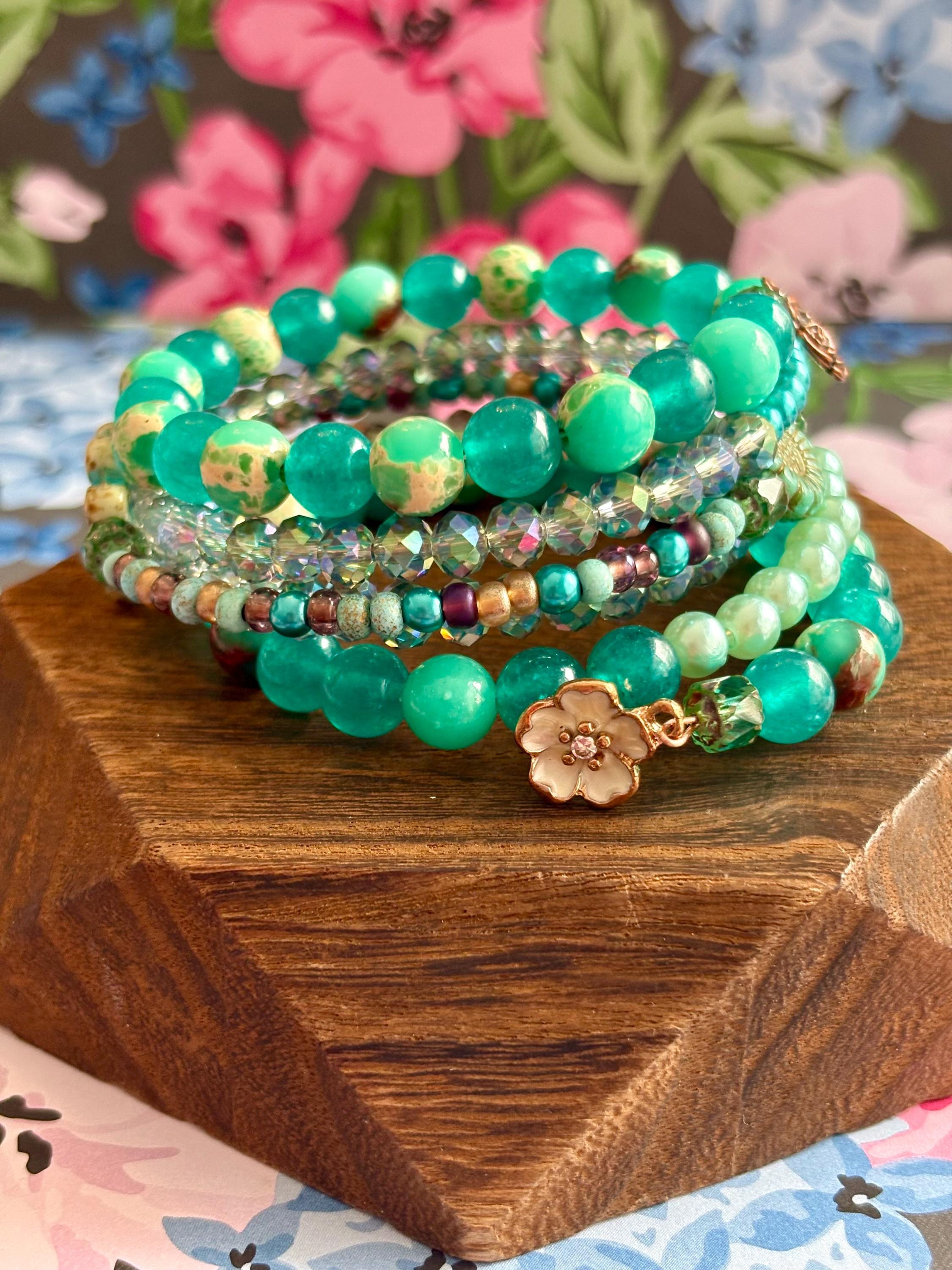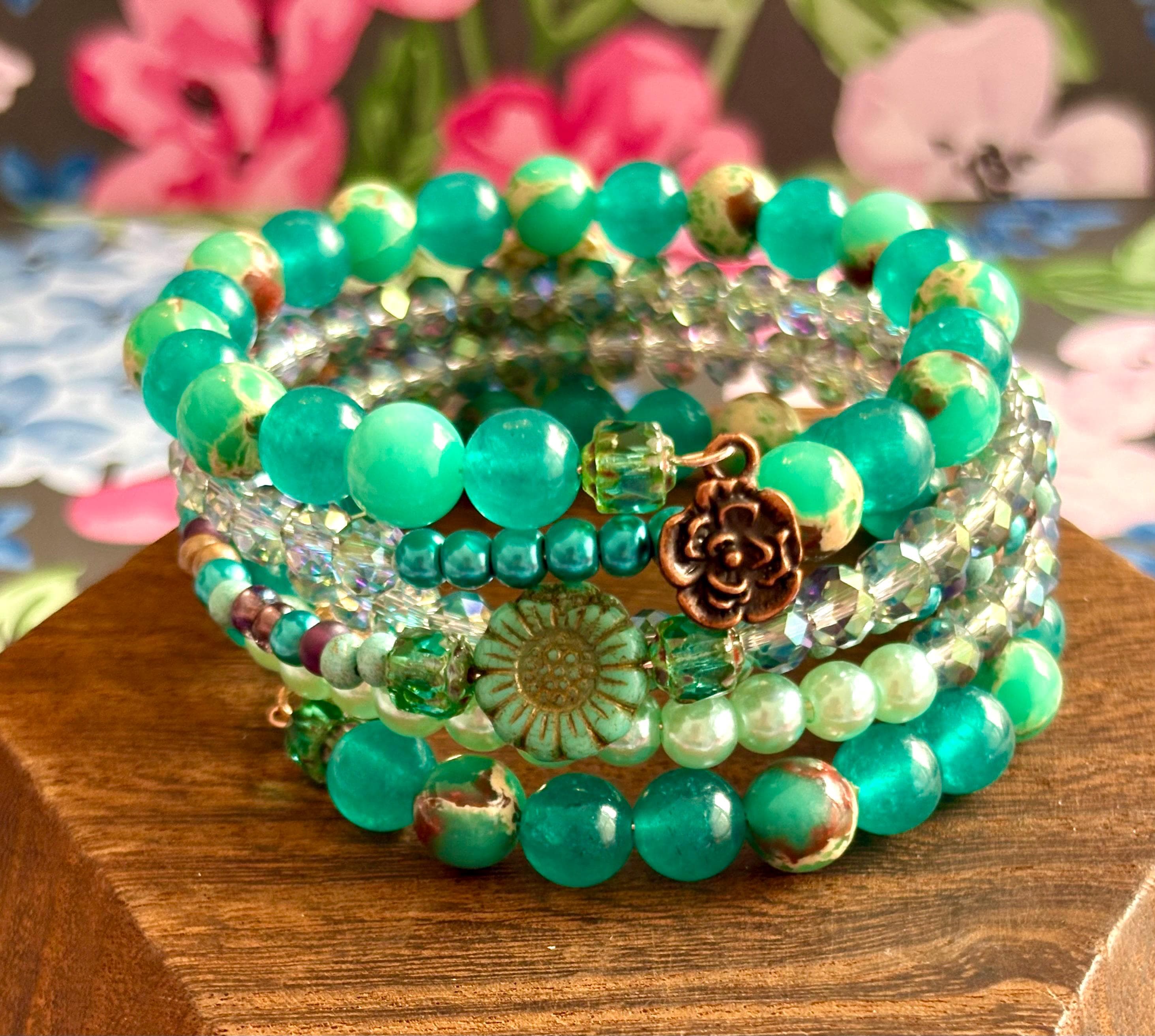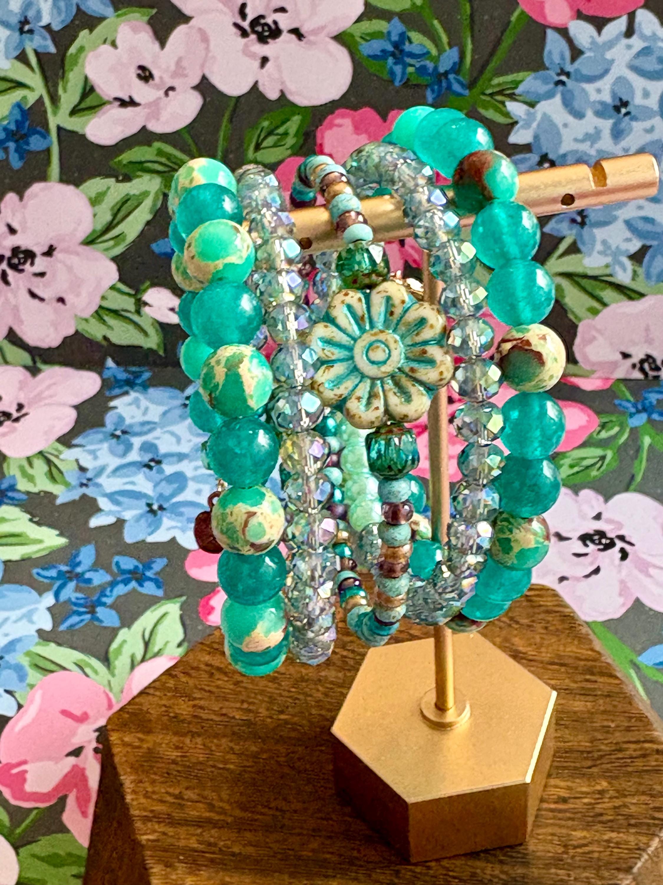 Teal Meadow Bloom Coil Wrap Bracelet – Jade, Czech Glass Daisy, AB Crystal, Floral Stack