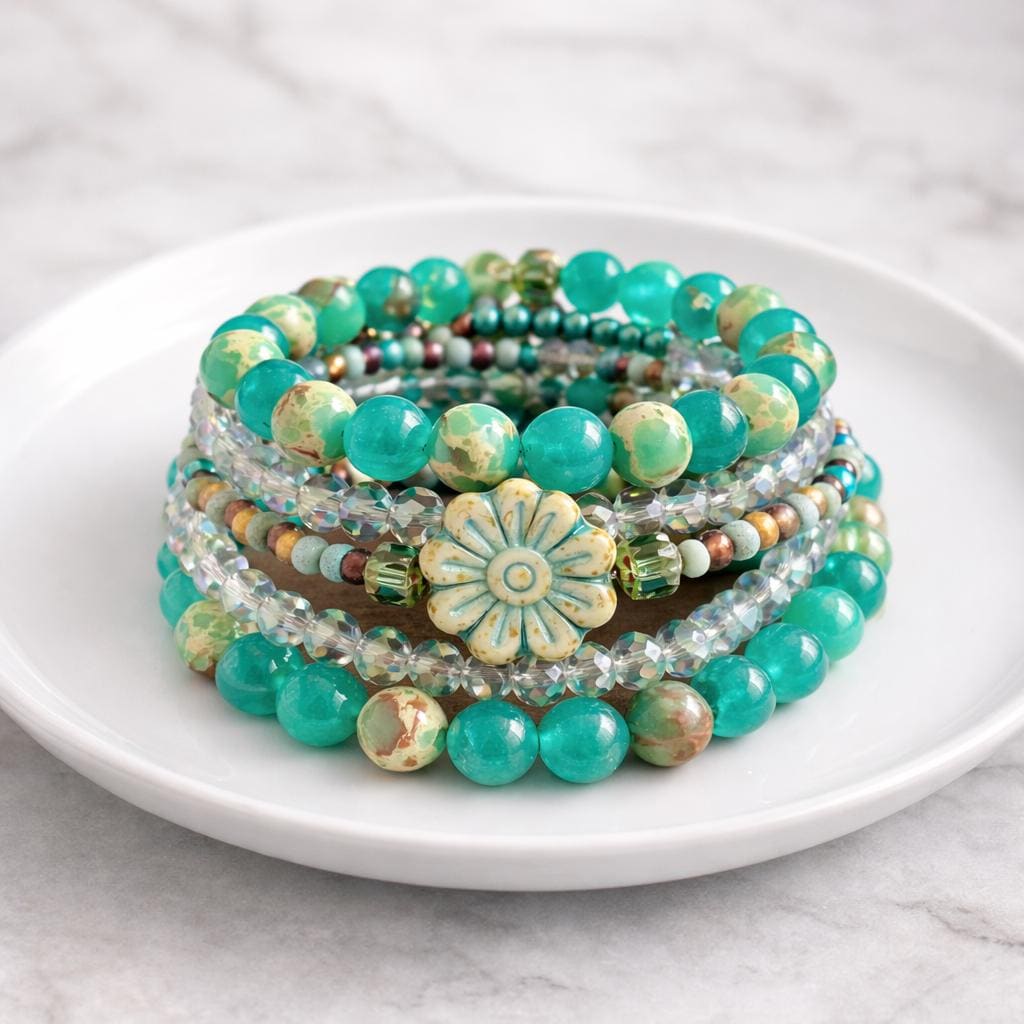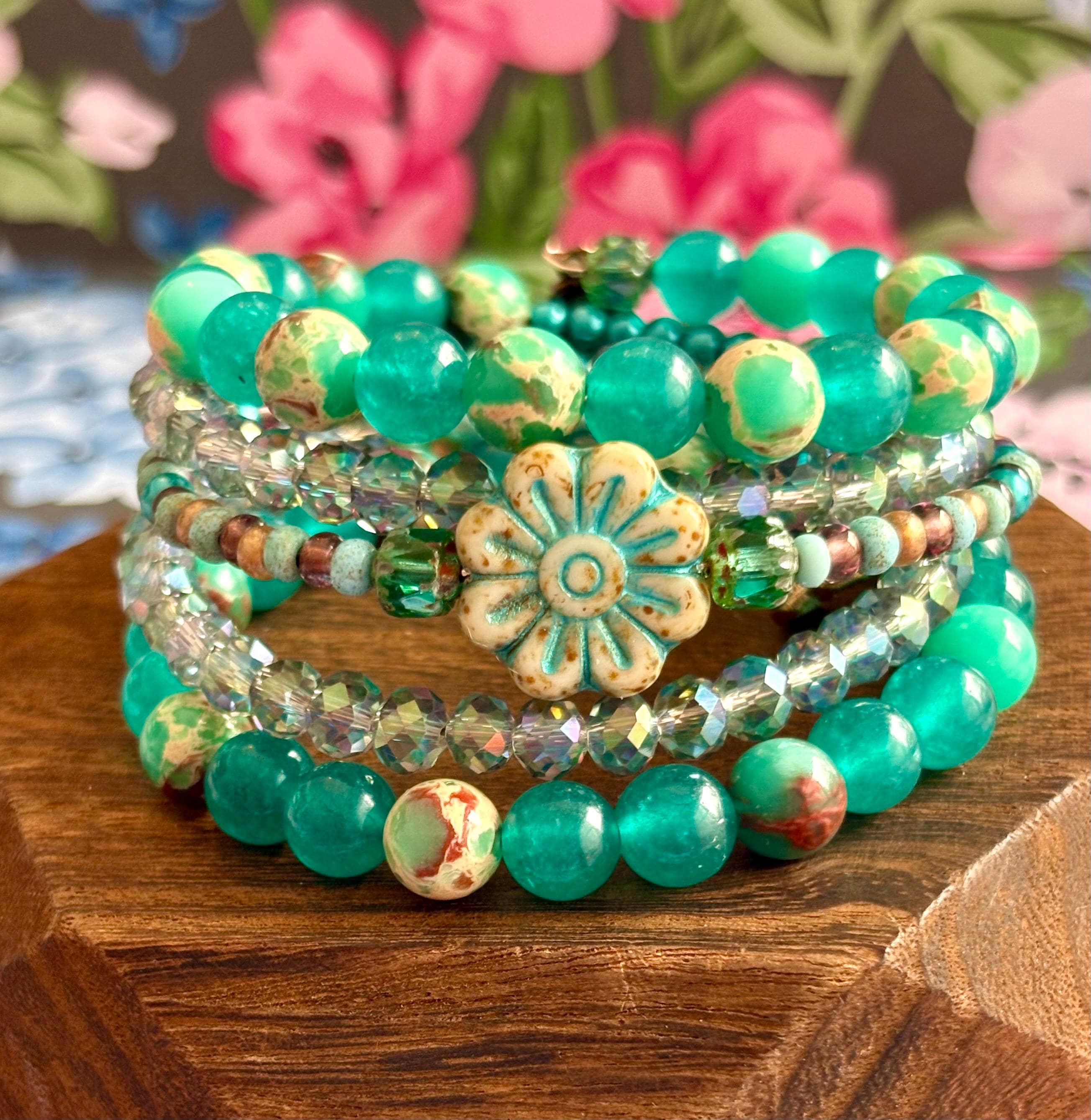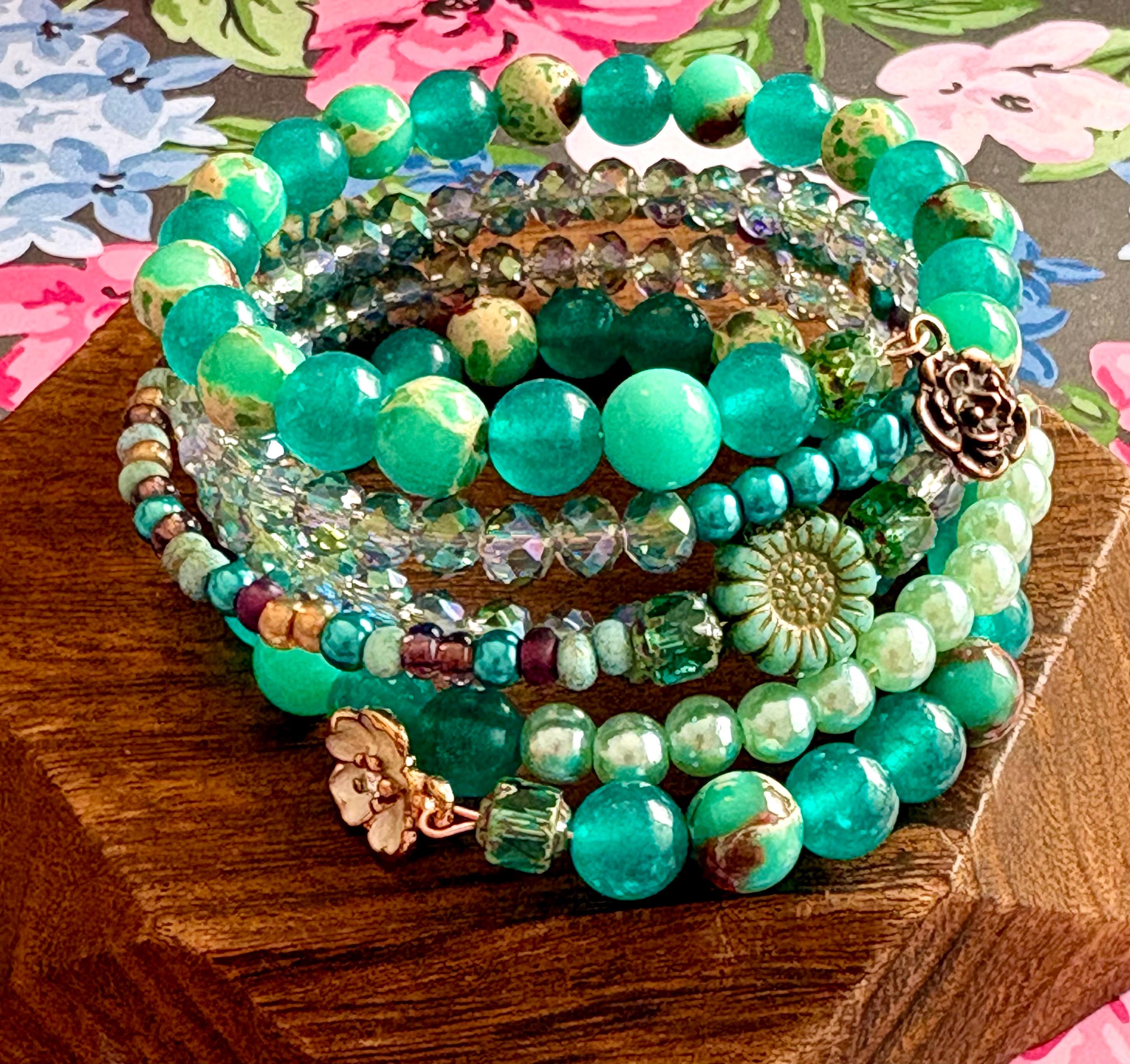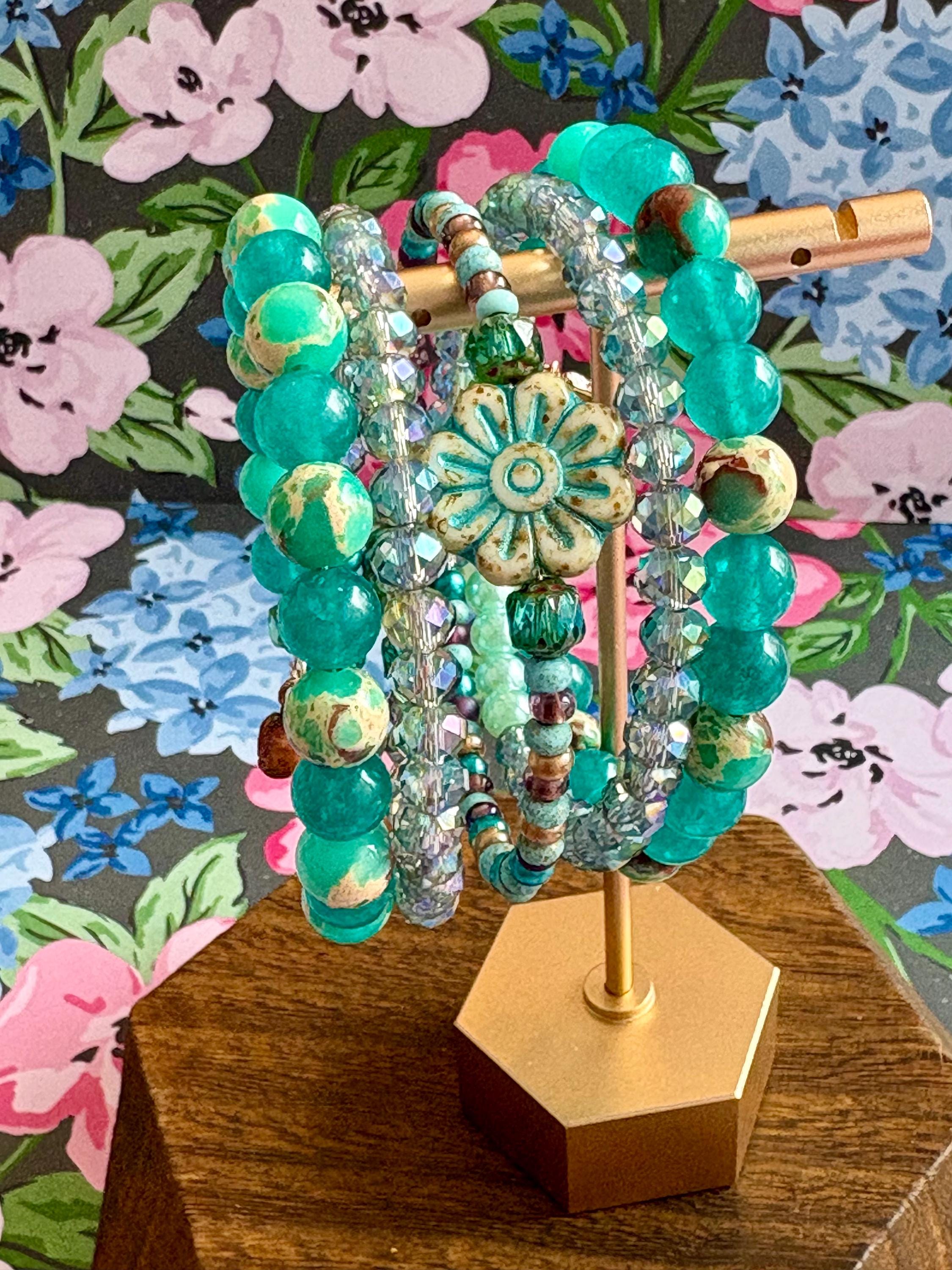 Teal Meadow Bloom Coil Wrap Bracelet – Jade, Czech Glass Daisy, AB Crystal, Floral Stack