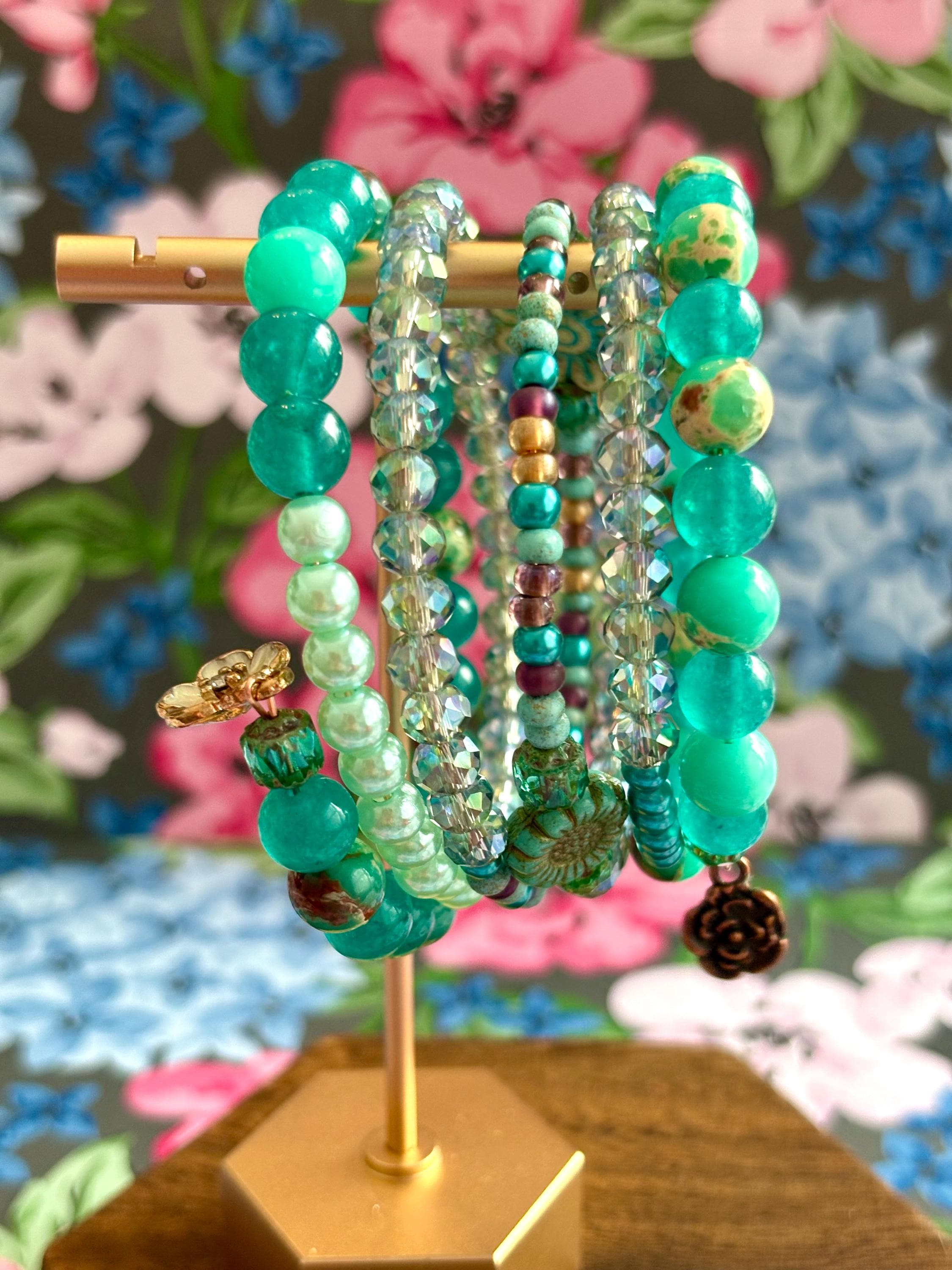 Layers of vibrant jade gemstones, sparkling AB faceted crystals, golden-turquoise seed bead accents, and radiant Czech glass daisy, sunflower, and cathedral beads wrap gracefully around your wrist in a garden-inspired embrace.
