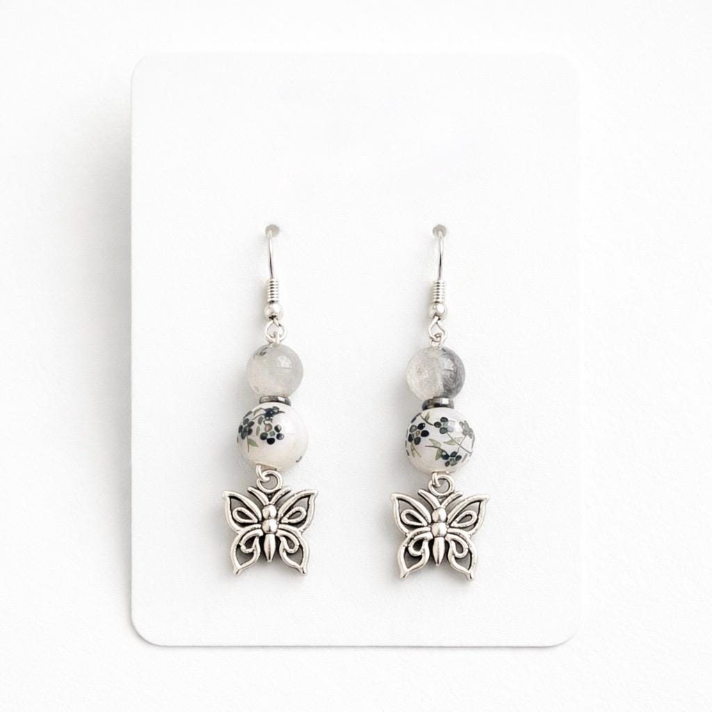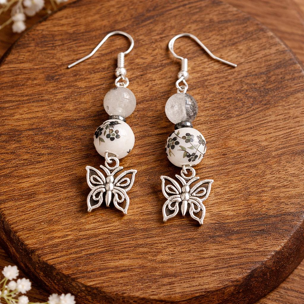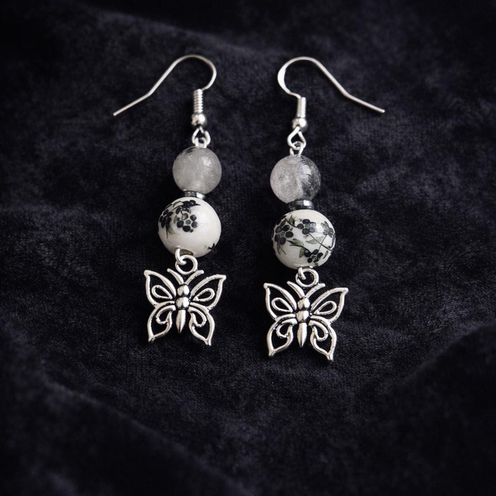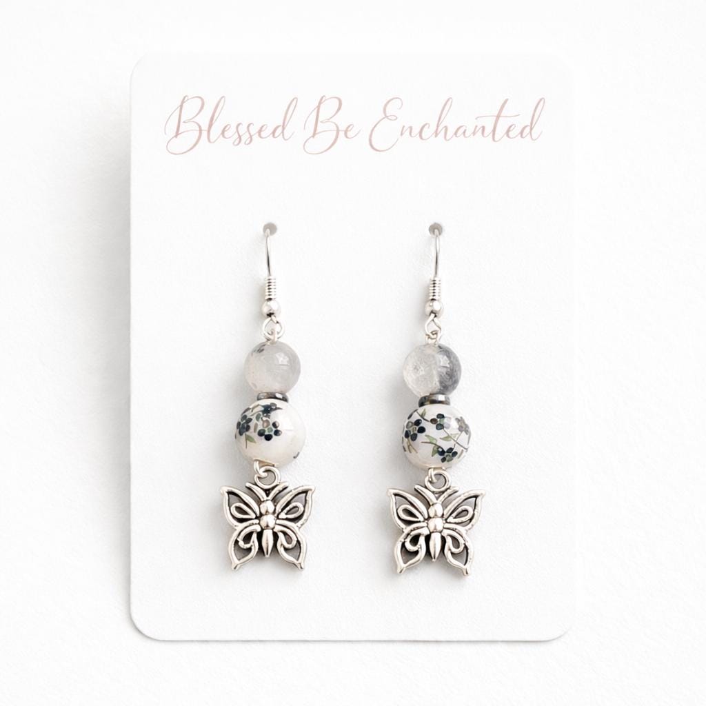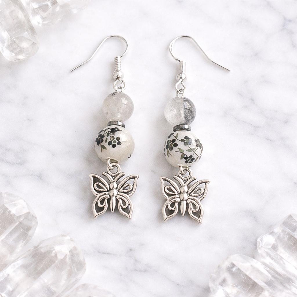 With deep noir tones, grounding hematite, and tourmalinated quartz kissed with silver, these earrings carry the energy of transformation, protection, and inner clarity. Finished with delicate butterfly charms, they are a symbol of rebirth rising from shadow into light.