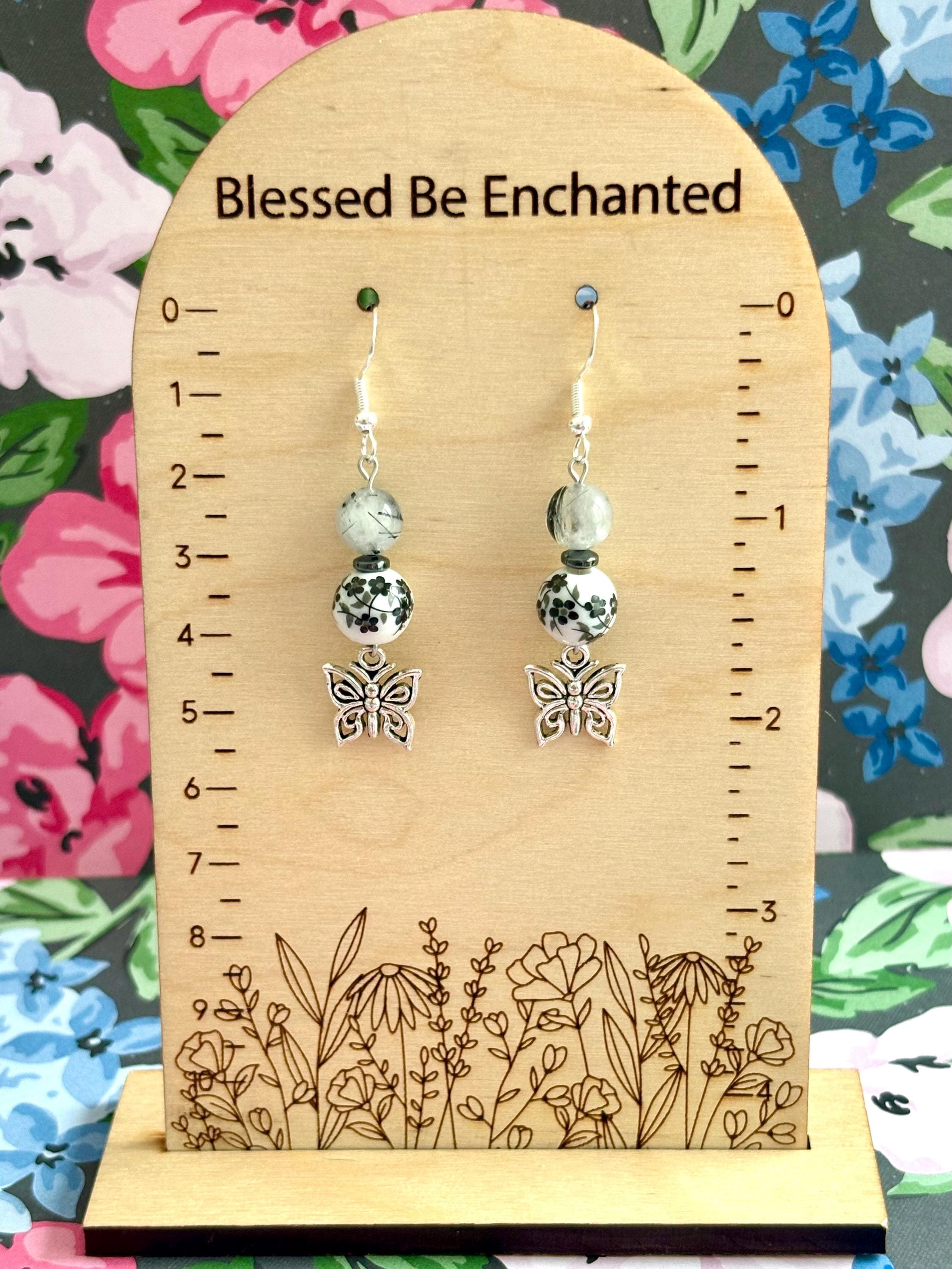 Midnight Garden Butterfly Earrings – Tourmalinated Quartz & Noir Hematite Crystal Energy Dangles – Silver Hypoallergenic Stainless Steel – Gothic Floral Boho