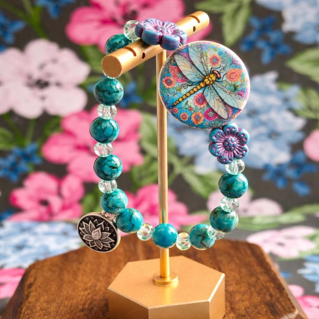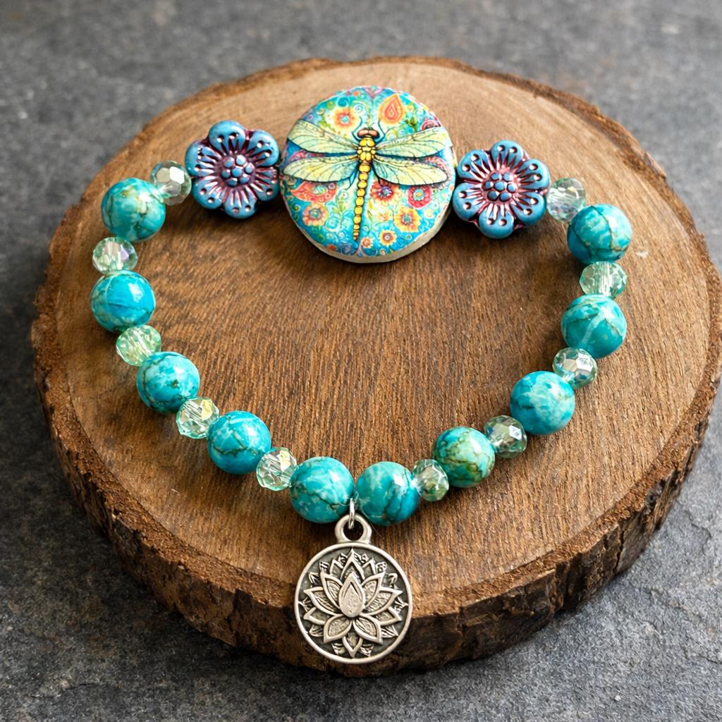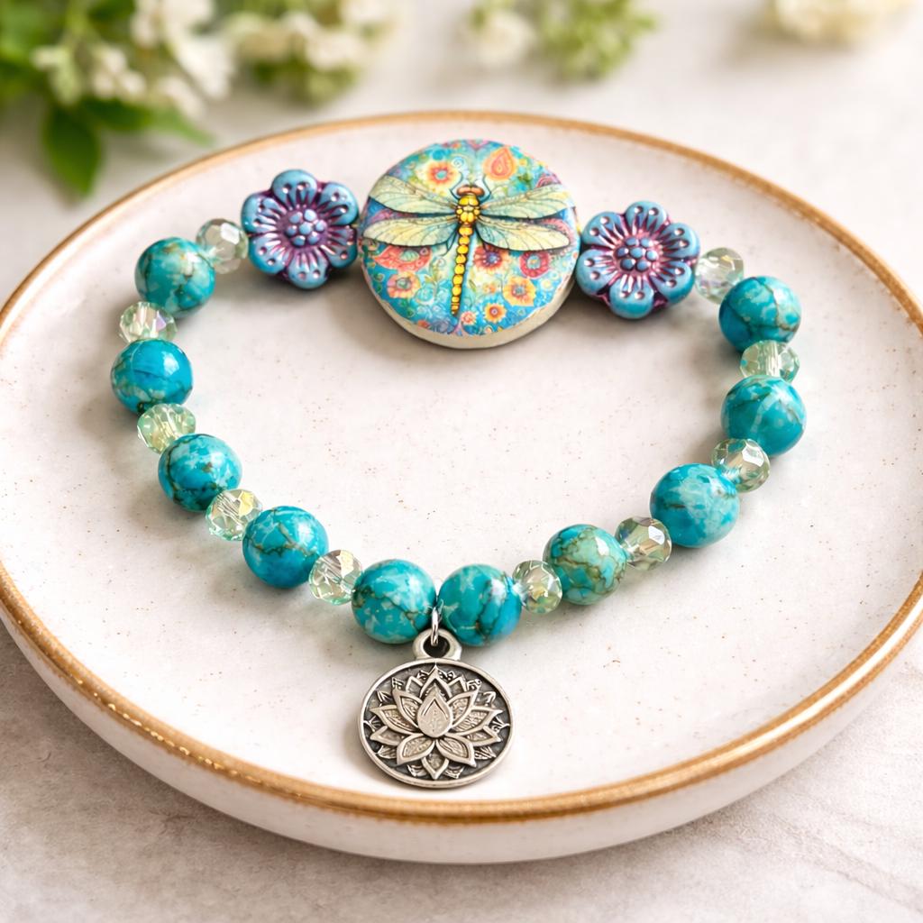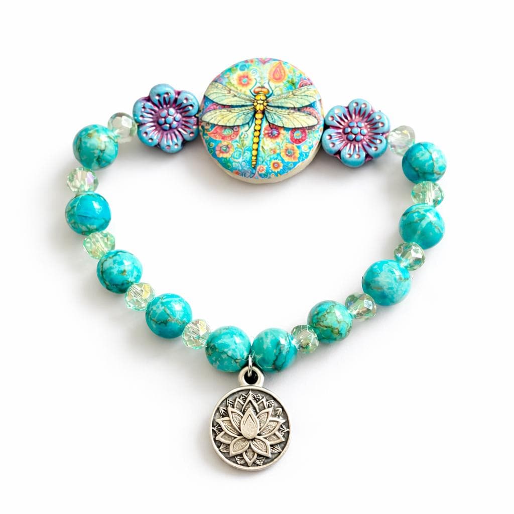 Featuring a colorful artisan dragonfly focal bead surrounded by floral accents, calming turquoise tones, and a sacred lotus charm, this bracelet symbolizes rising gracefully through life’s changes.