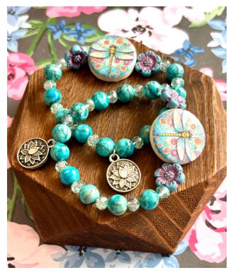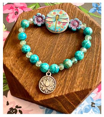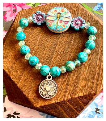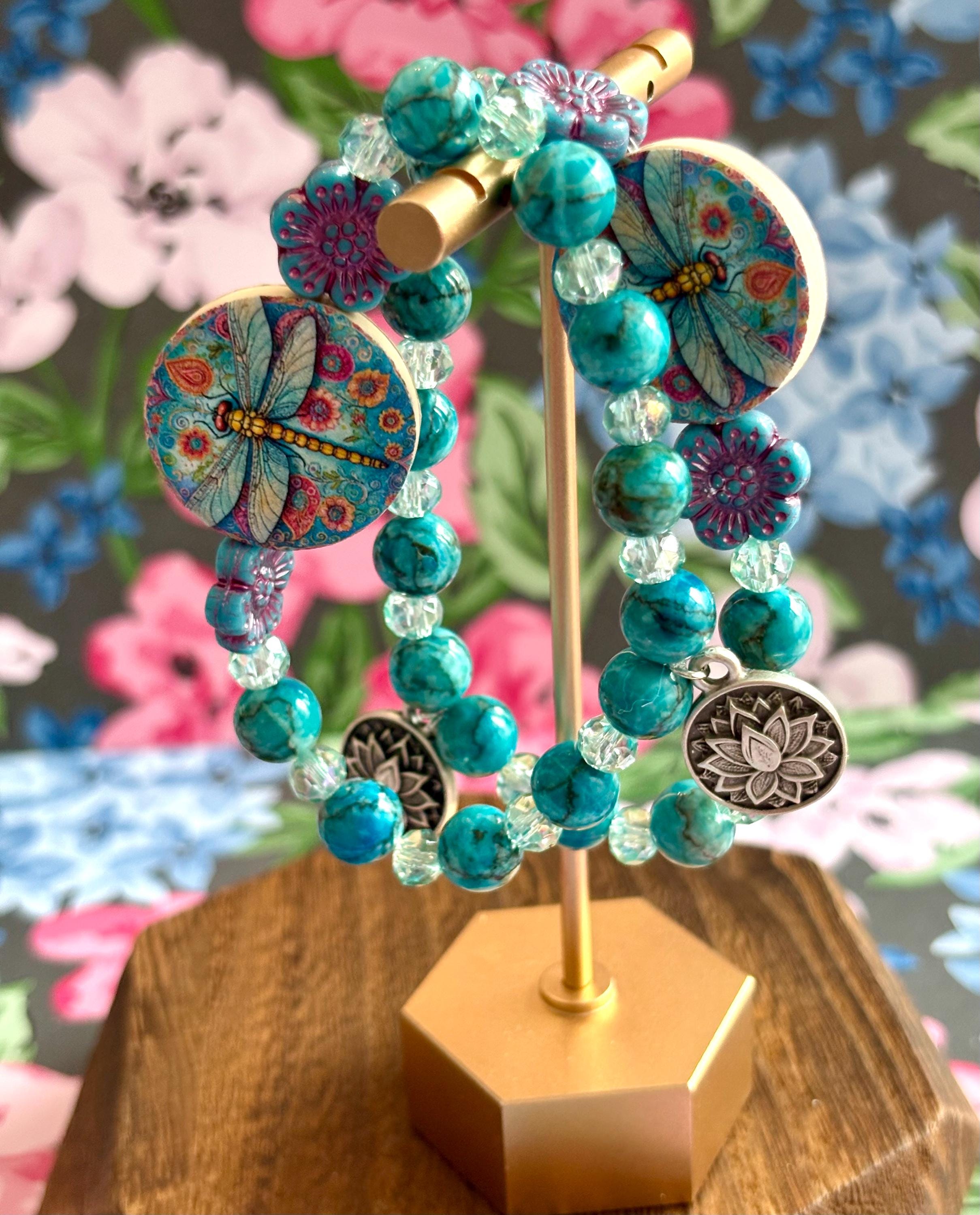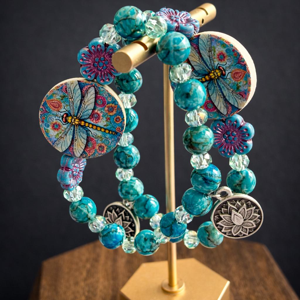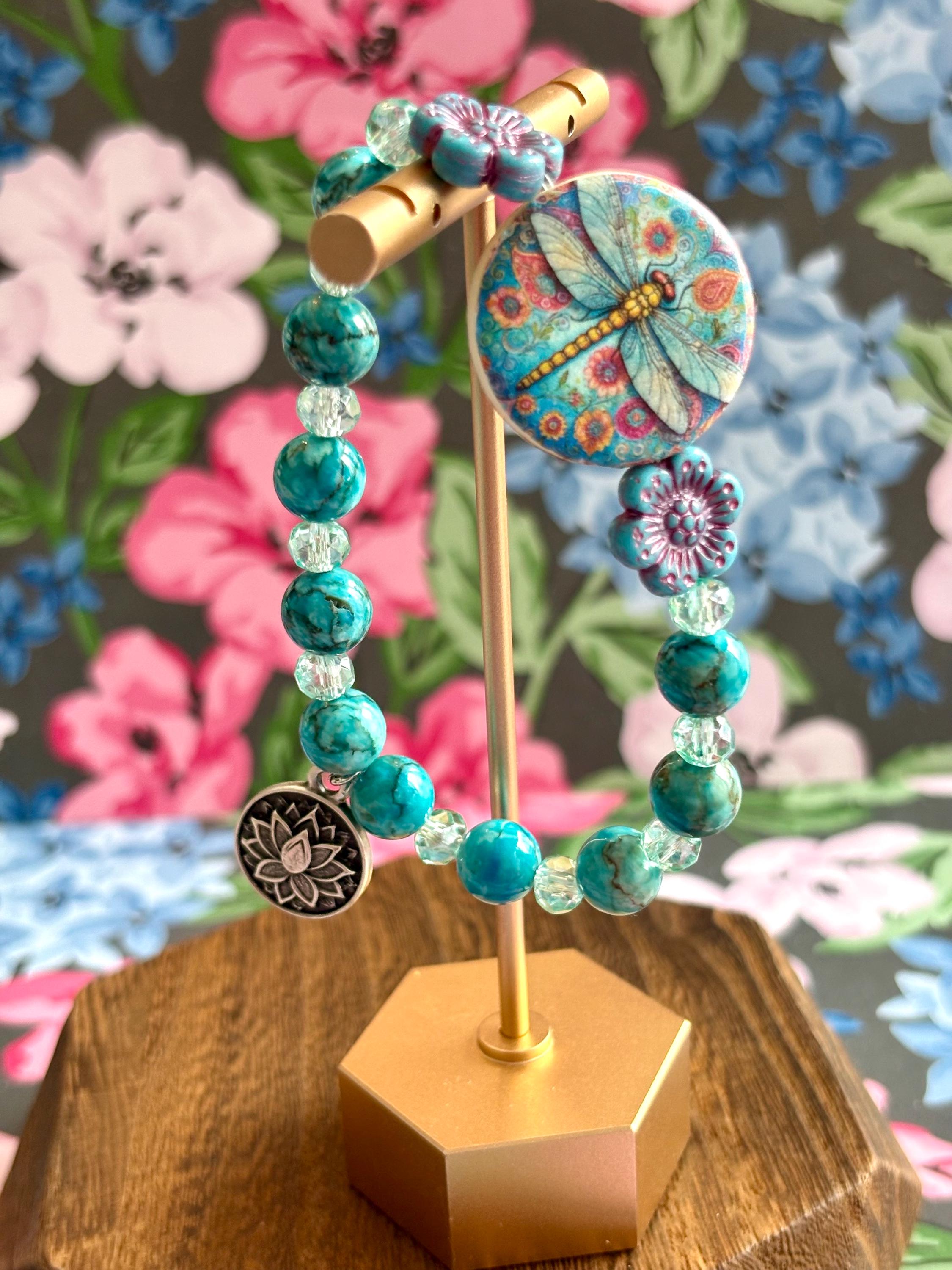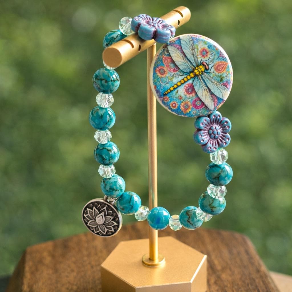 Featuring a colorful artisan dragonfly focal bead surrounded by floral accents, calming turquoise tones, and a sacred lotus charm, this bracelet symbolizes rising gracefully through life’s changes.
