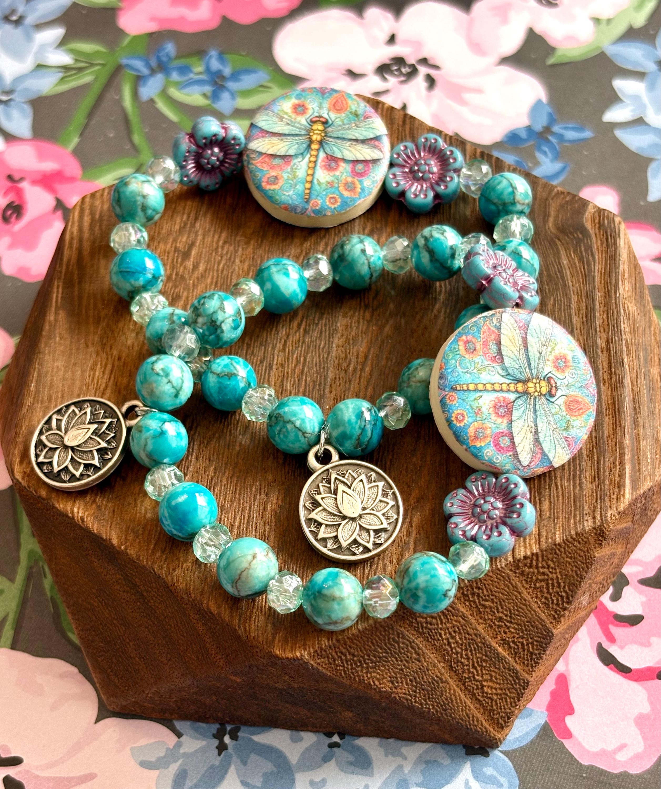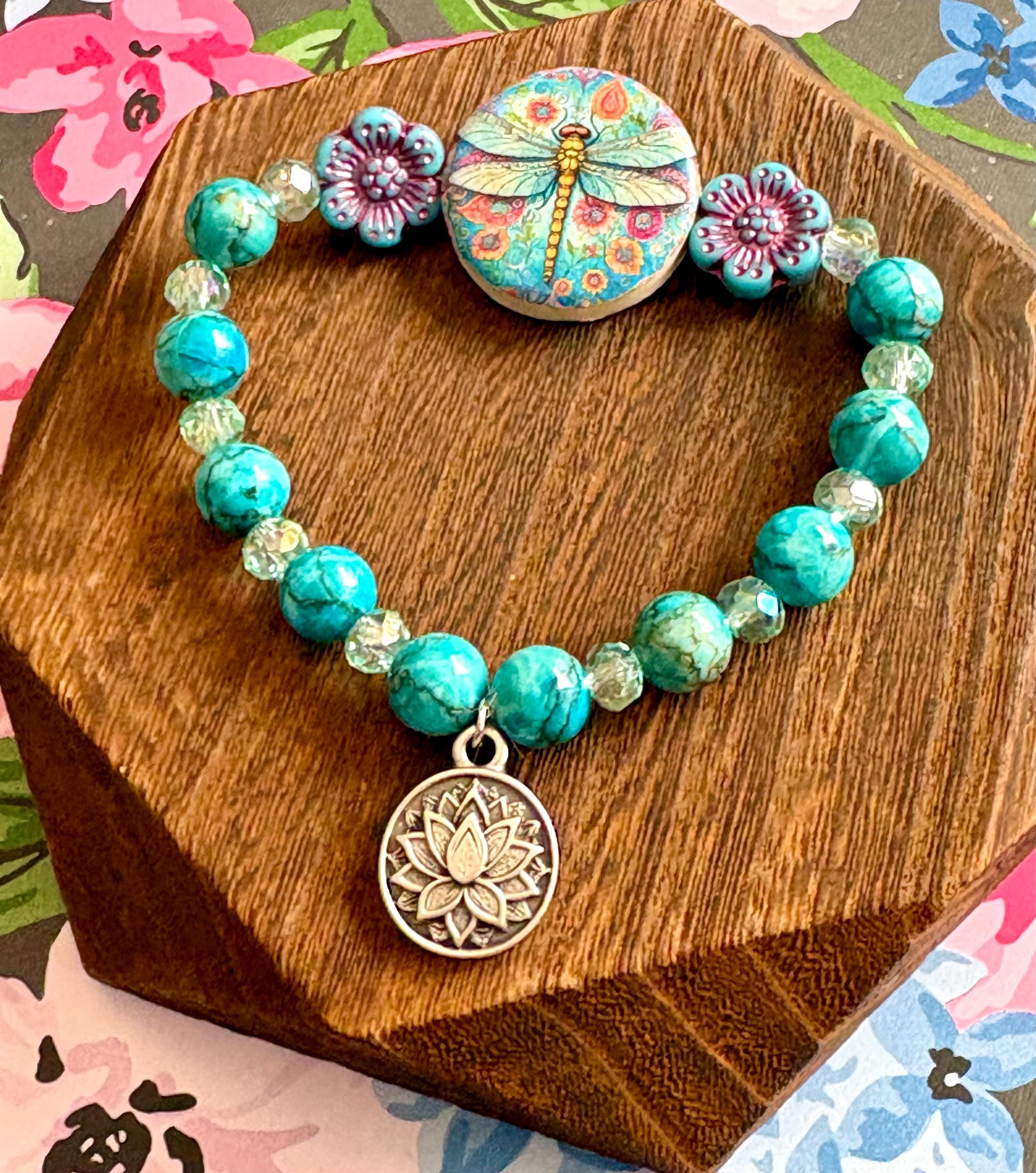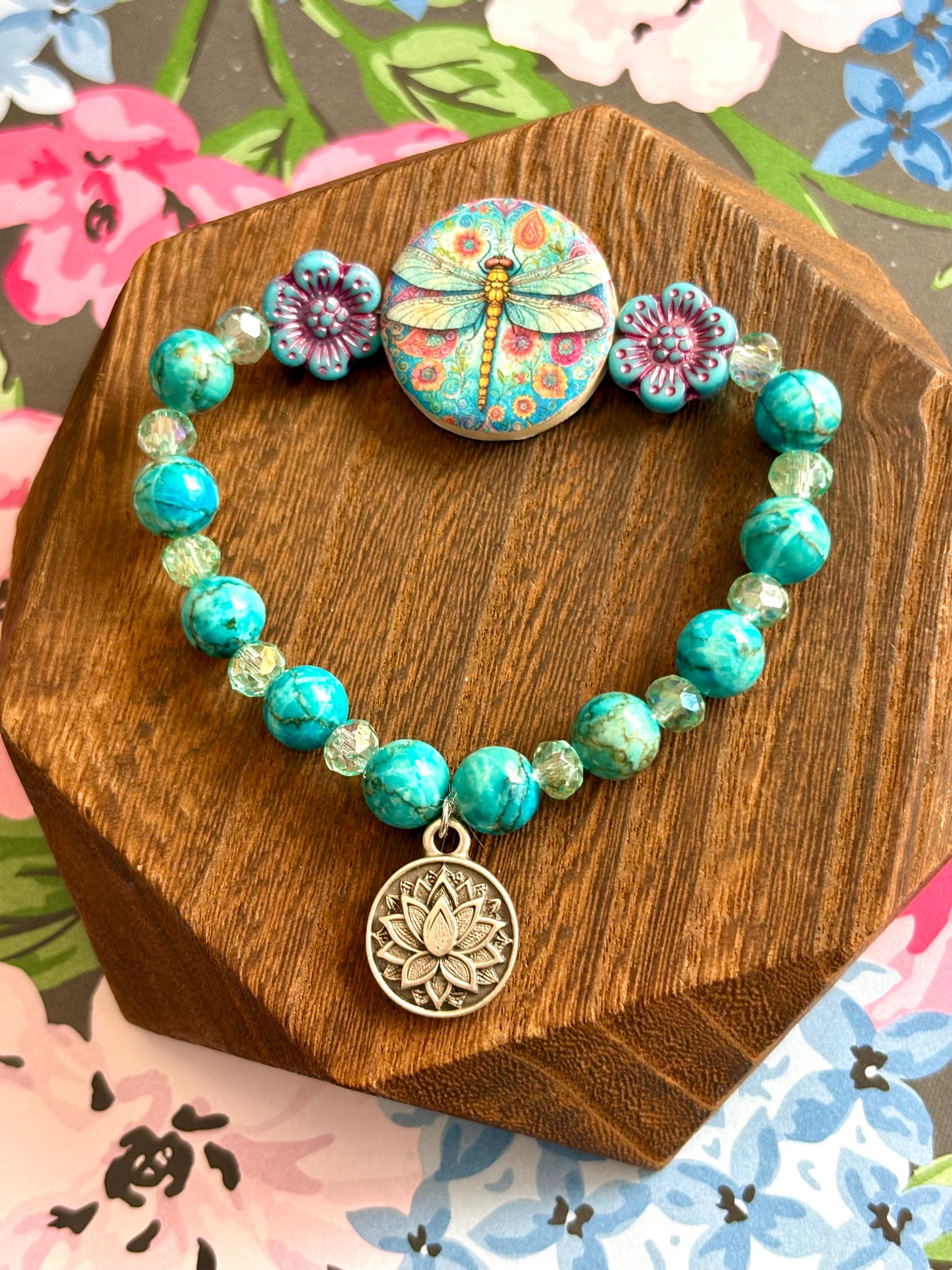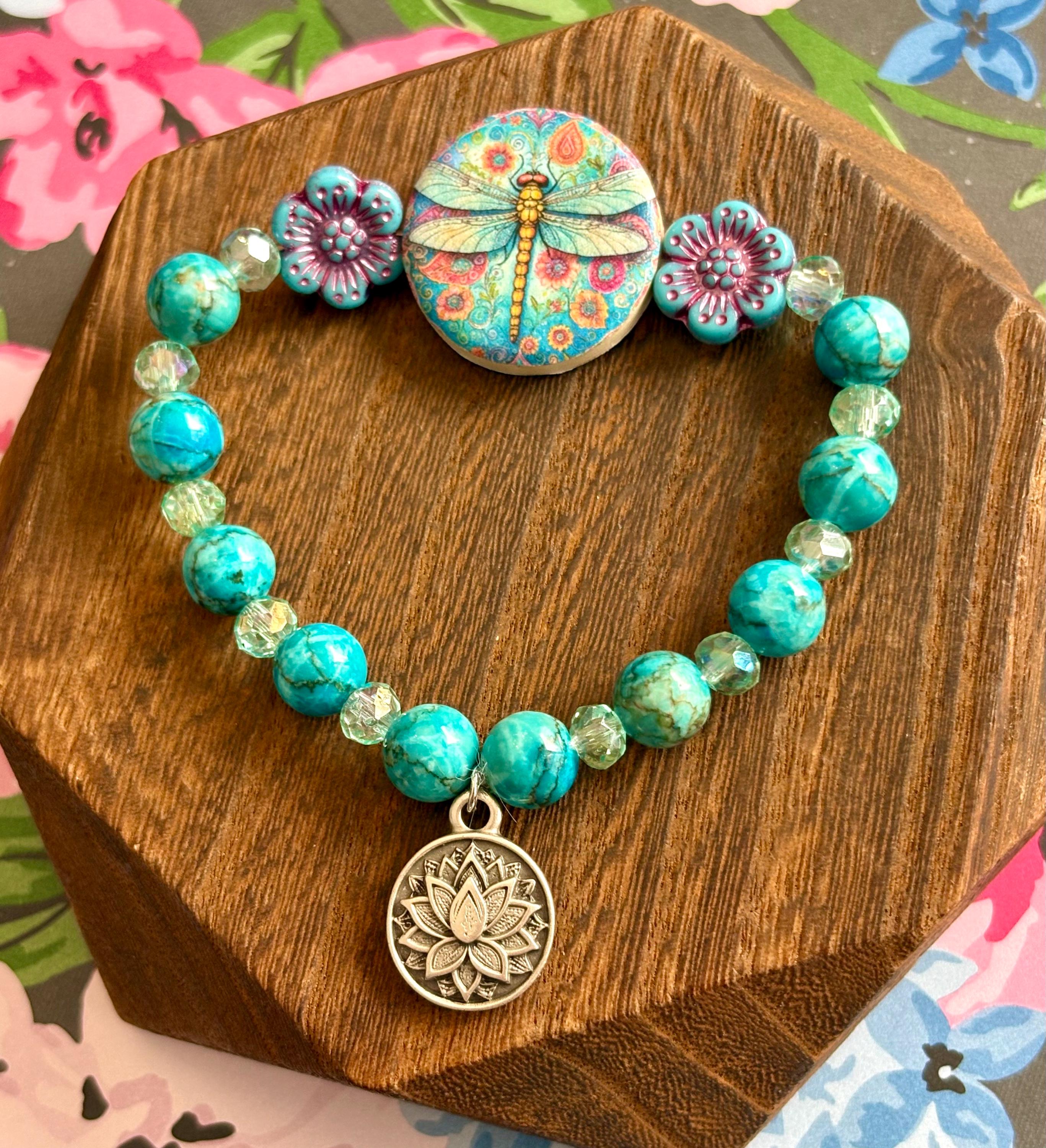 Dragonfly Bracelet – Cyan Magnesite Turquoise, Mint Crystal, Czech Glass Flowers, Lotus Charm