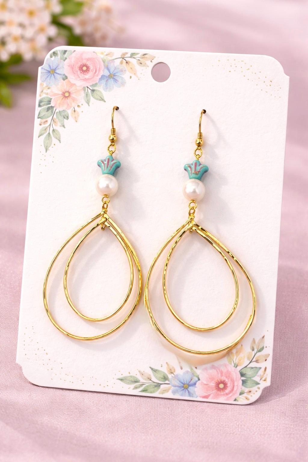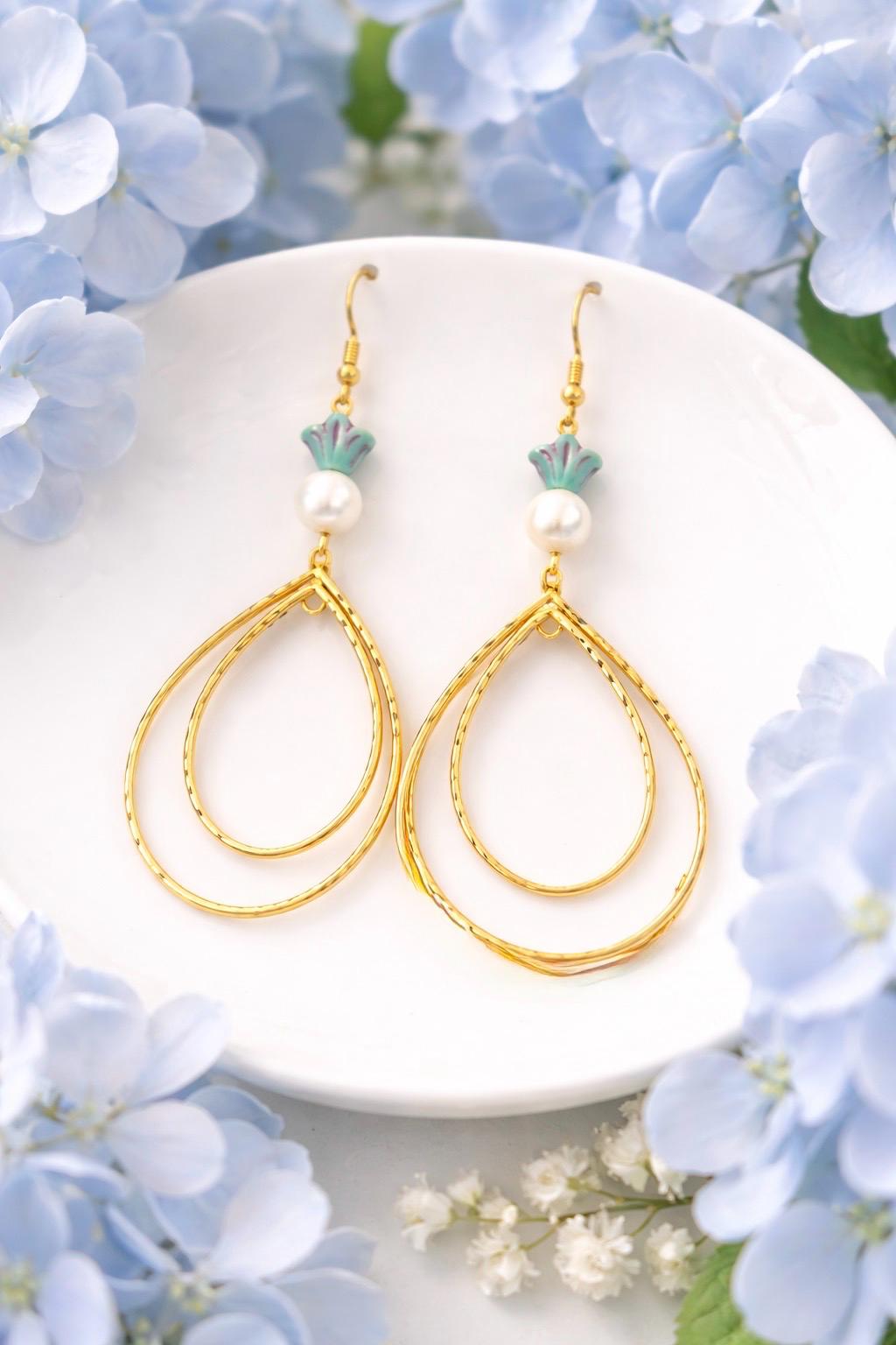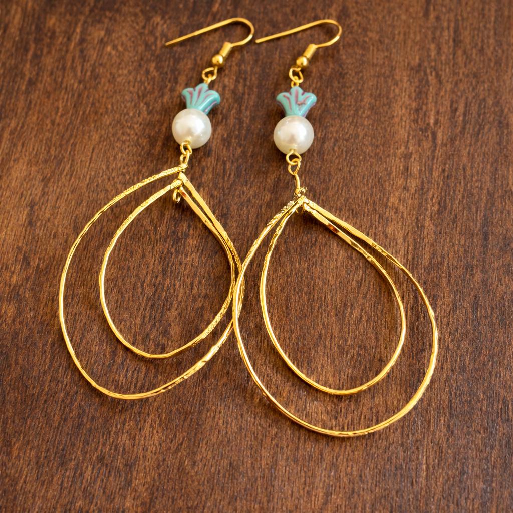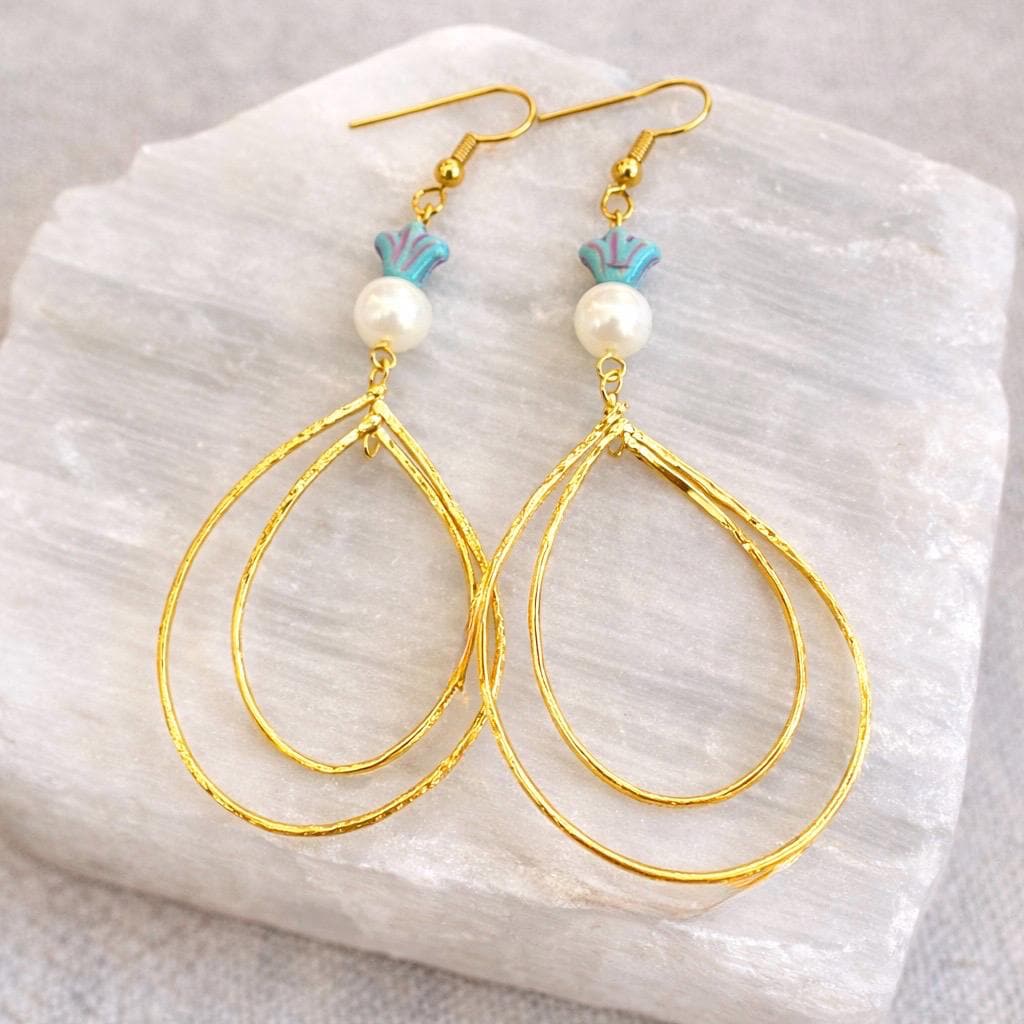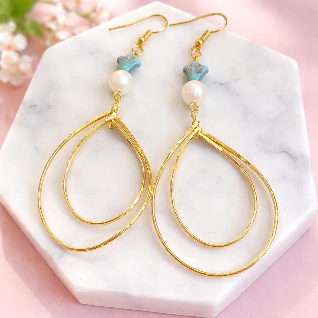 These radiant statement earrings are designed to flow like golden light around you. Featuring decorative rotating double twisted teardrops in a 16k gold finish, luminous shell pearl beads, and delicate Czech glass accents, they are graceful, feminine, and beautifully eye-catching.