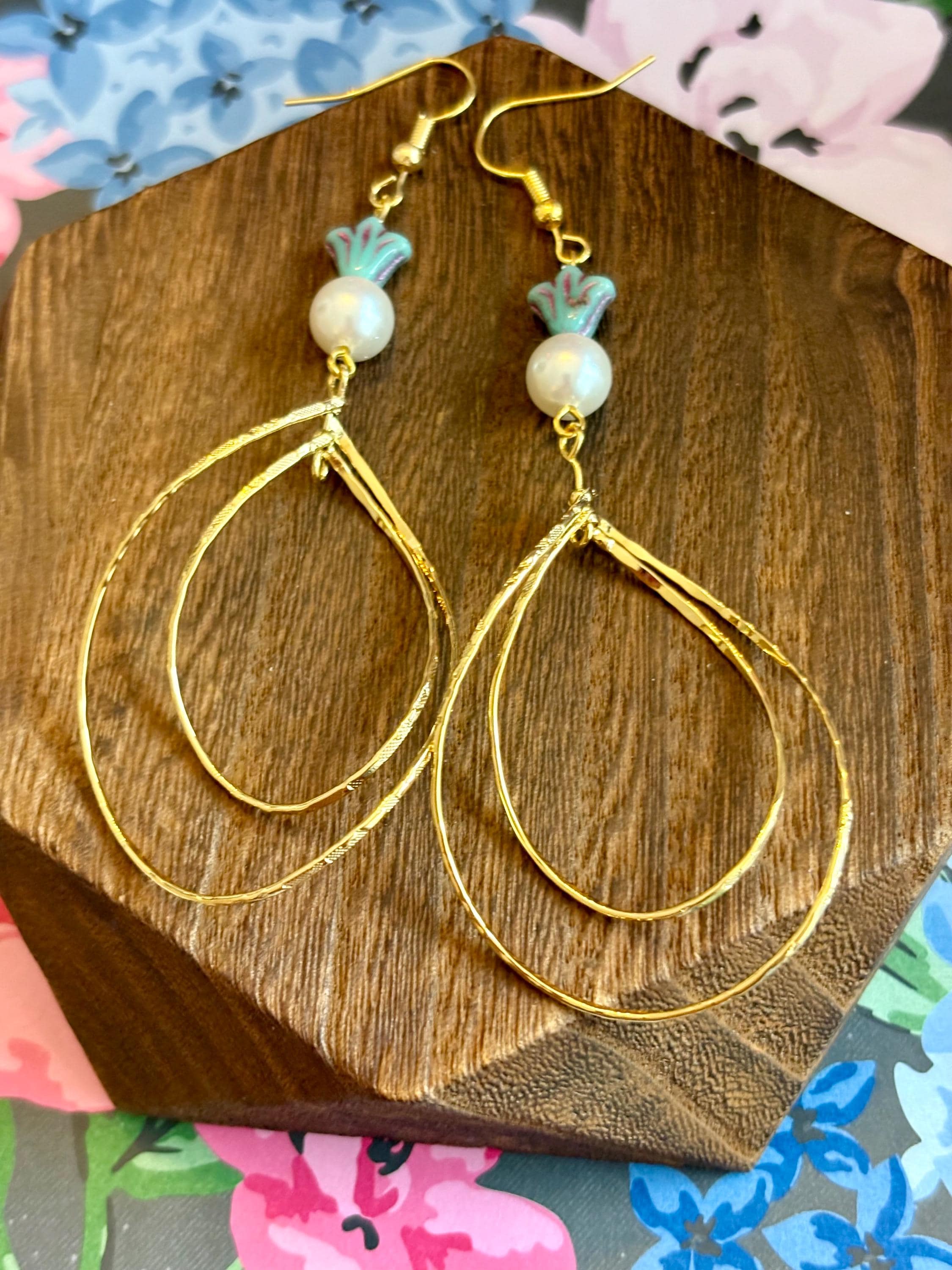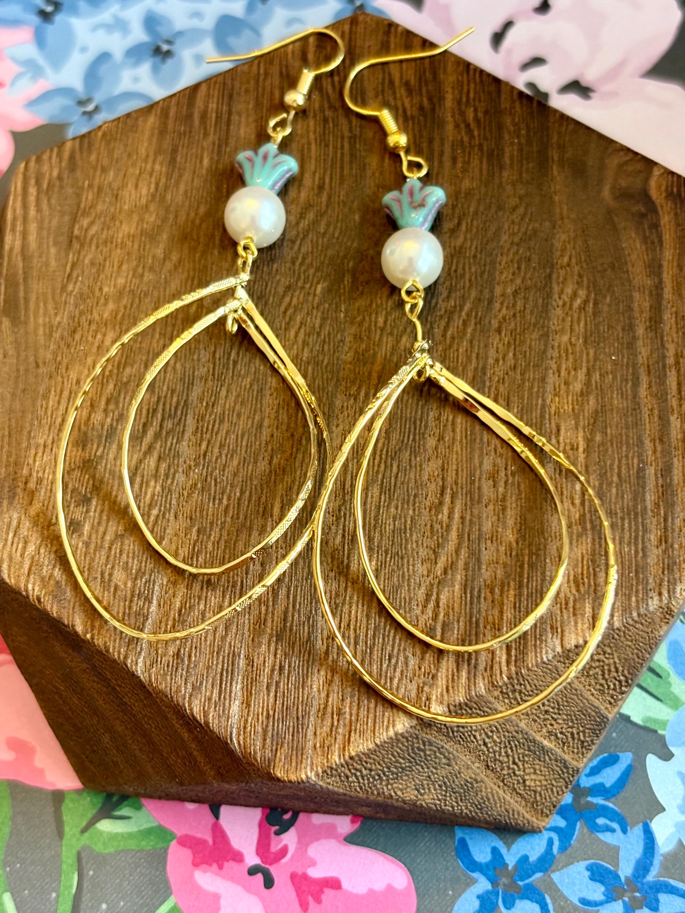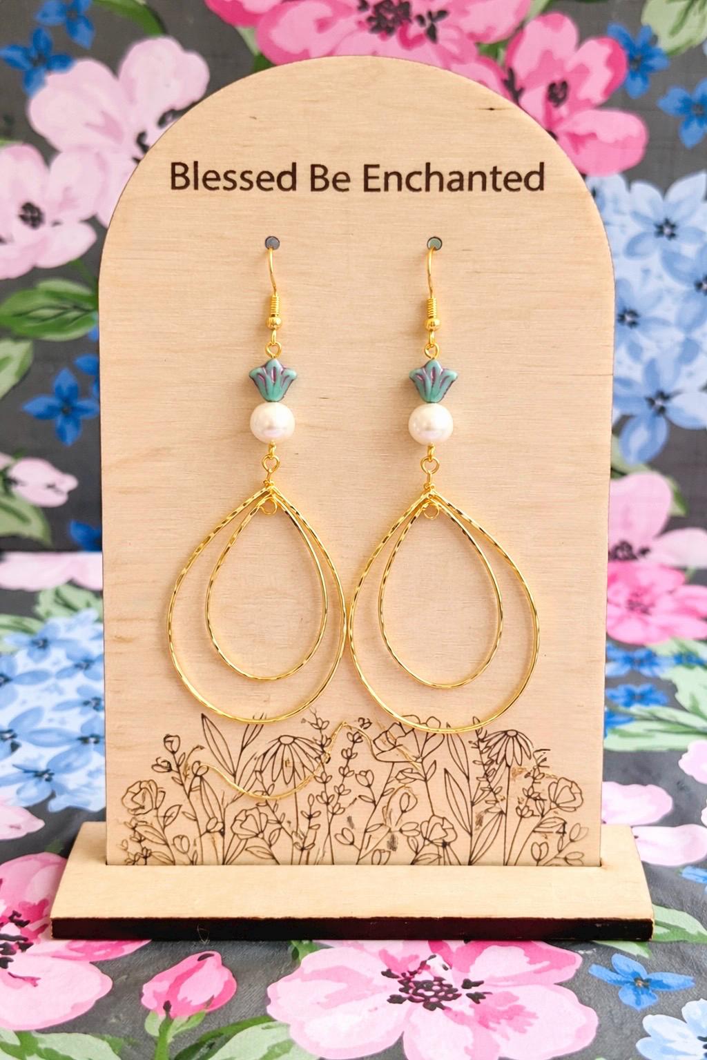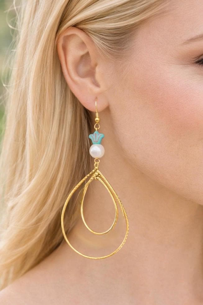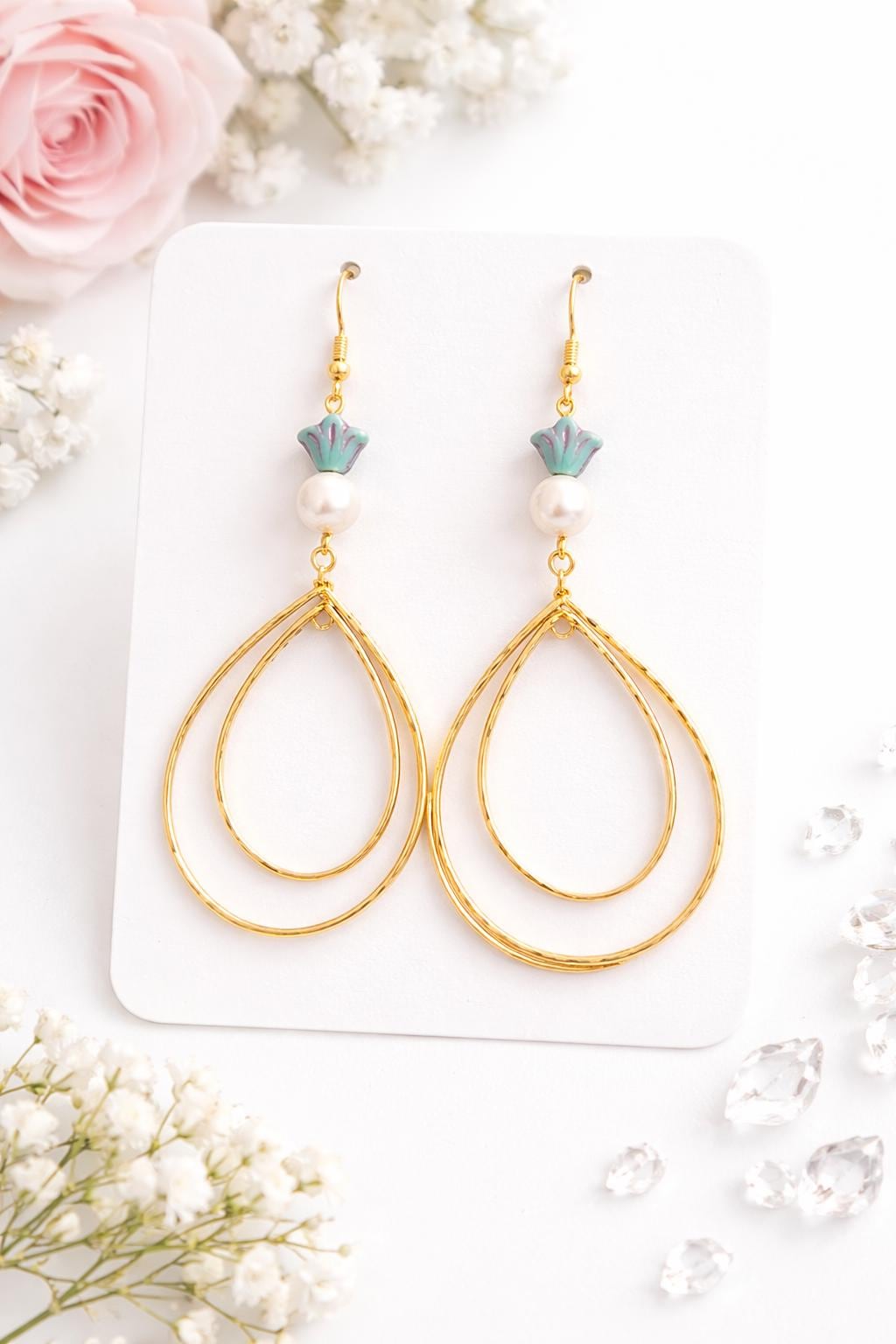 These radiant statement earrings are designed to flow like golden light around you. Featuring decorative rotating double twisted teardrops in a 16k gold finish, luminous shell pearl beads, and delicate Czech glass accents, they are graceful, feminine, and beautifully eye-catching.