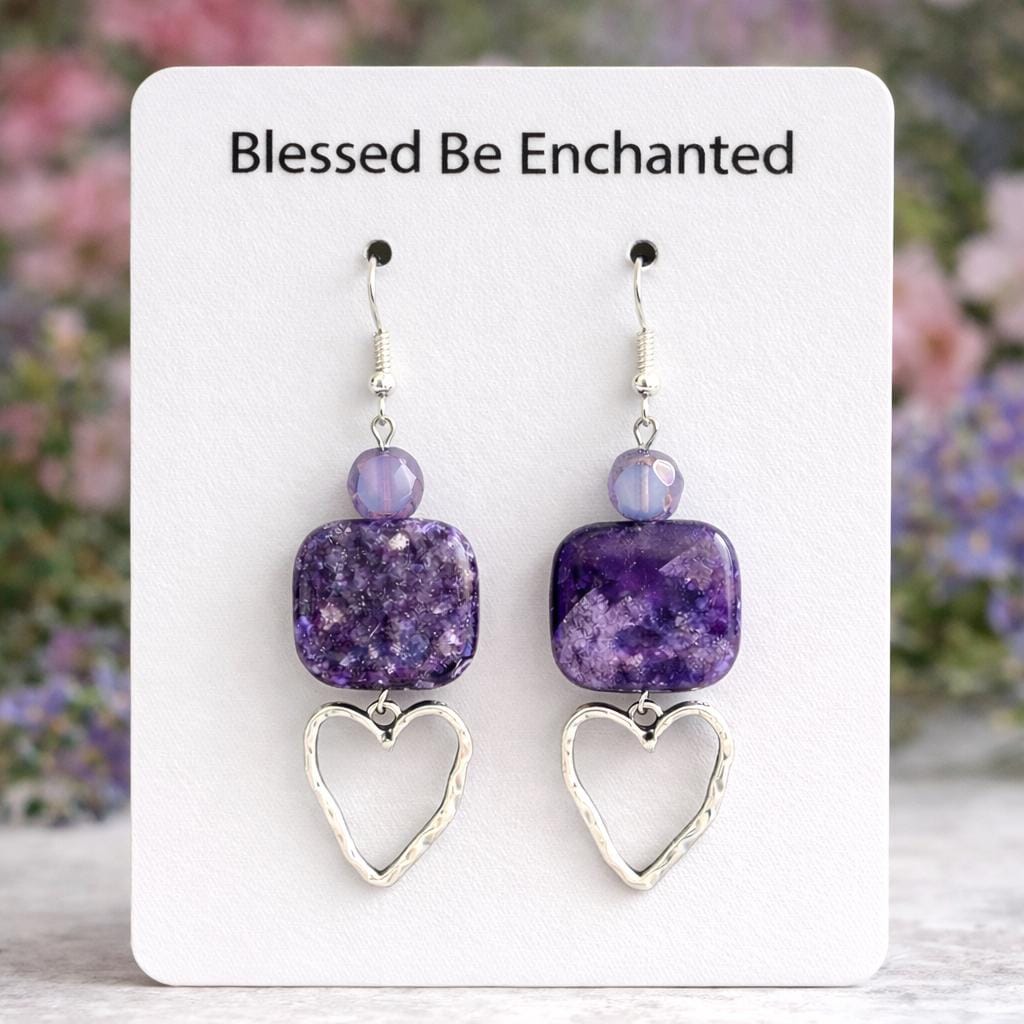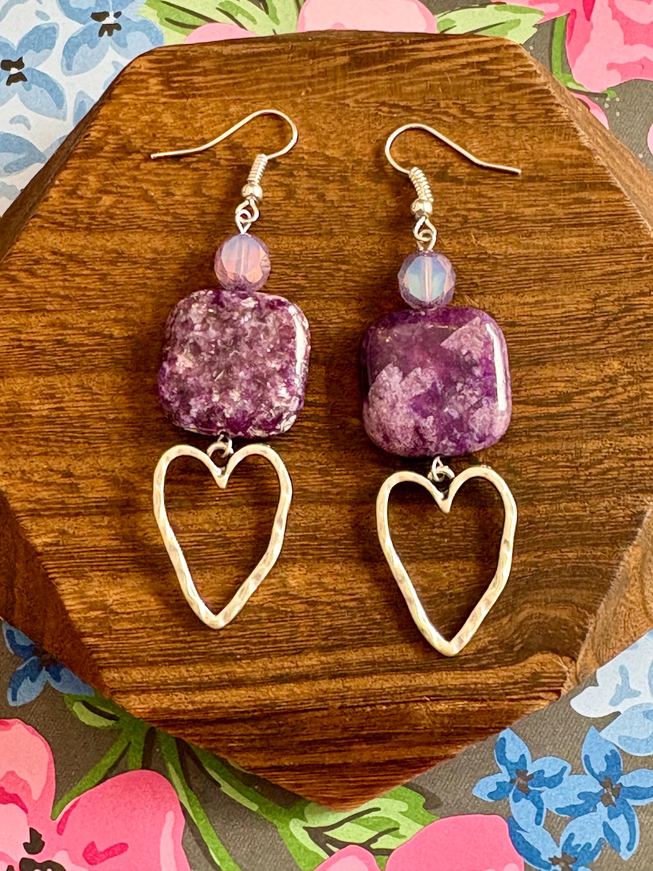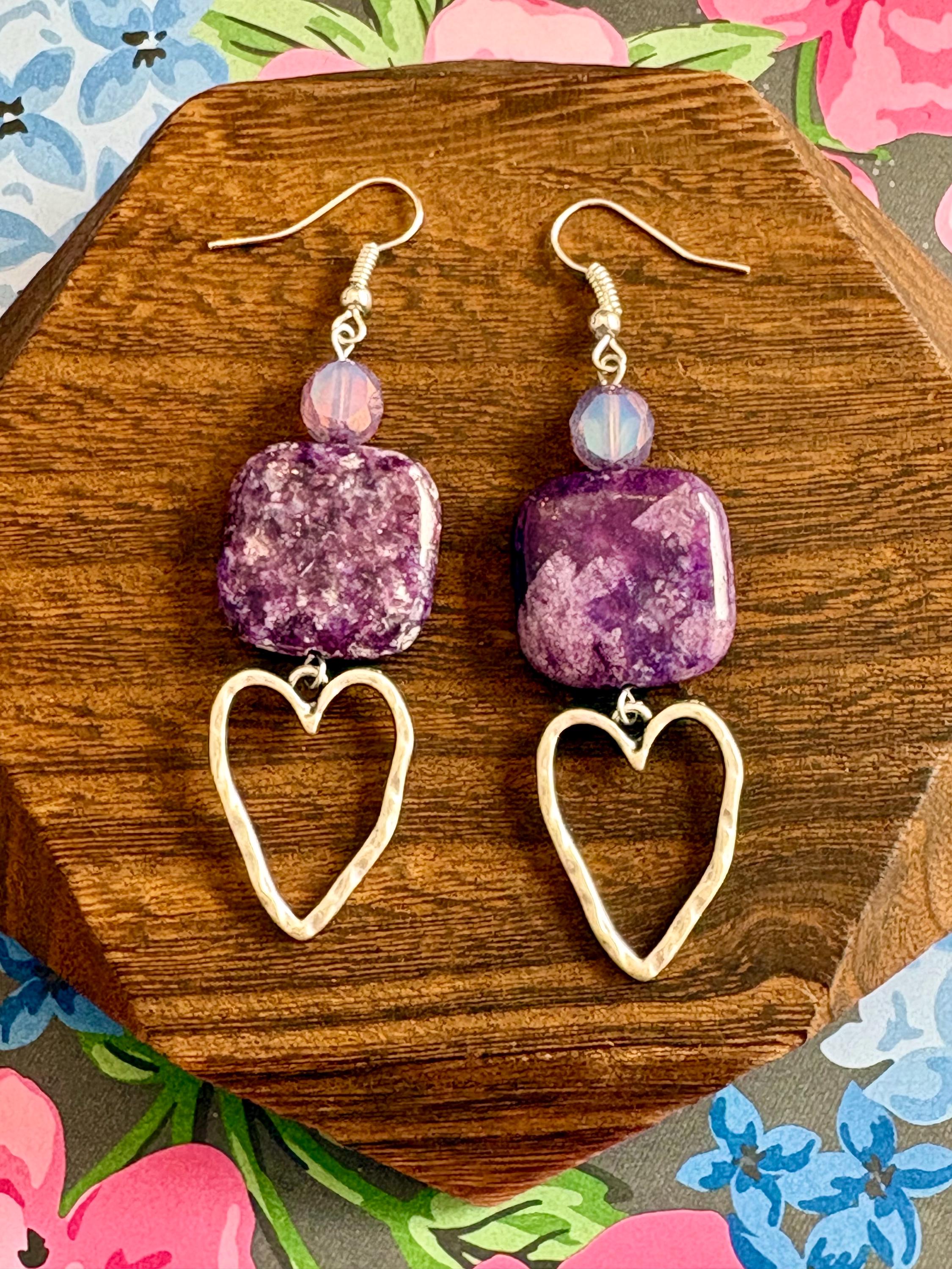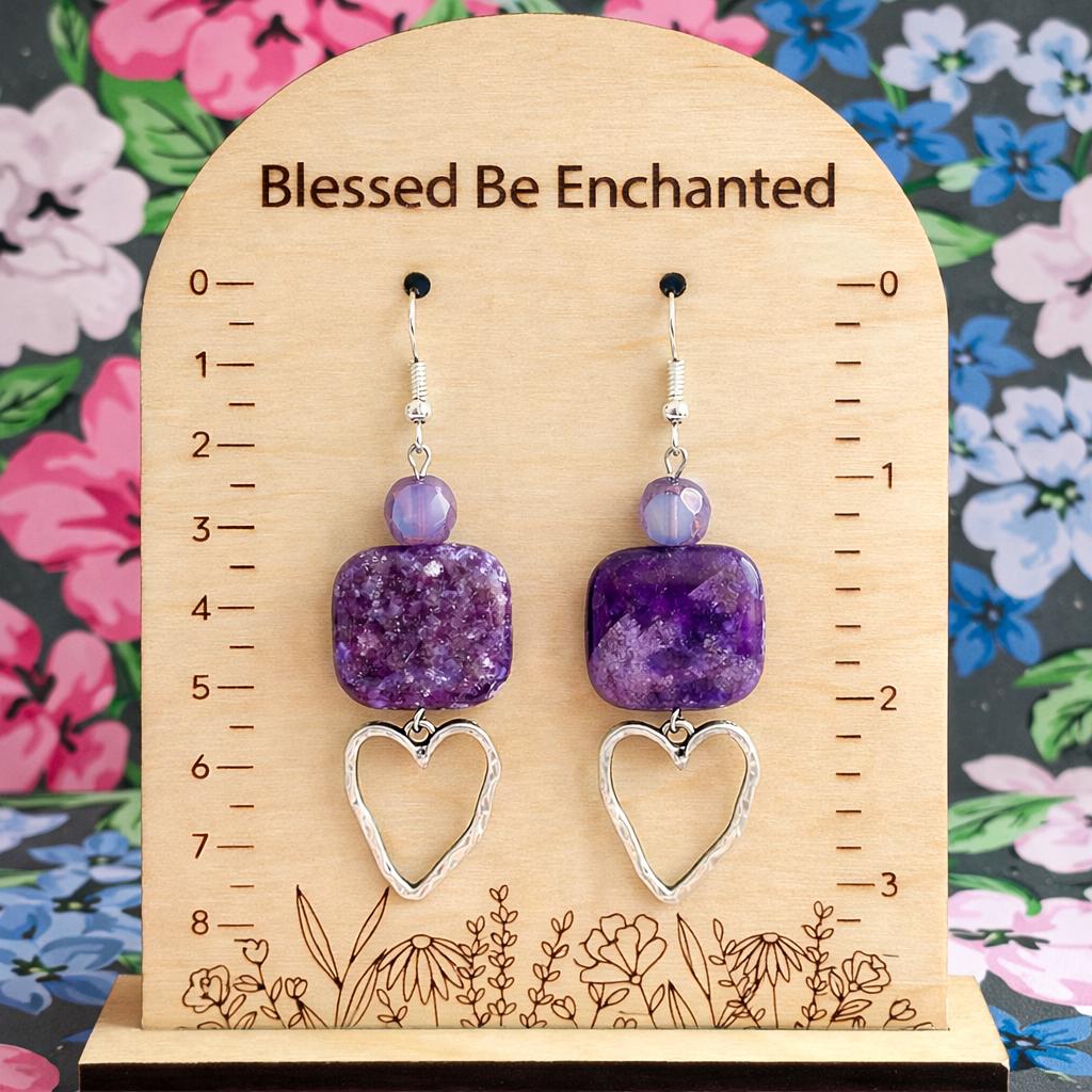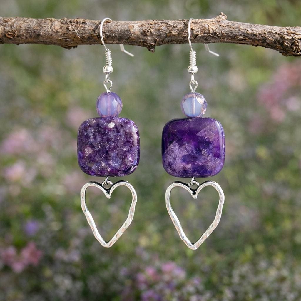 These elegant gemstone earrings feature square amethyst gemstones paired with shimmering Czech glass table-cut beads in soft purple tones! Finished with silver open heart charms, they symbolize openness, healing, and soulful love.