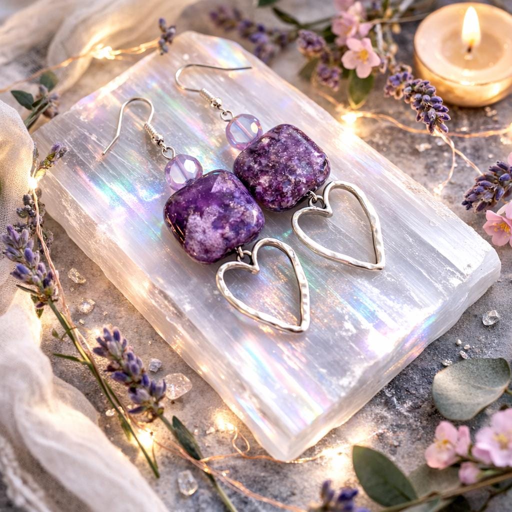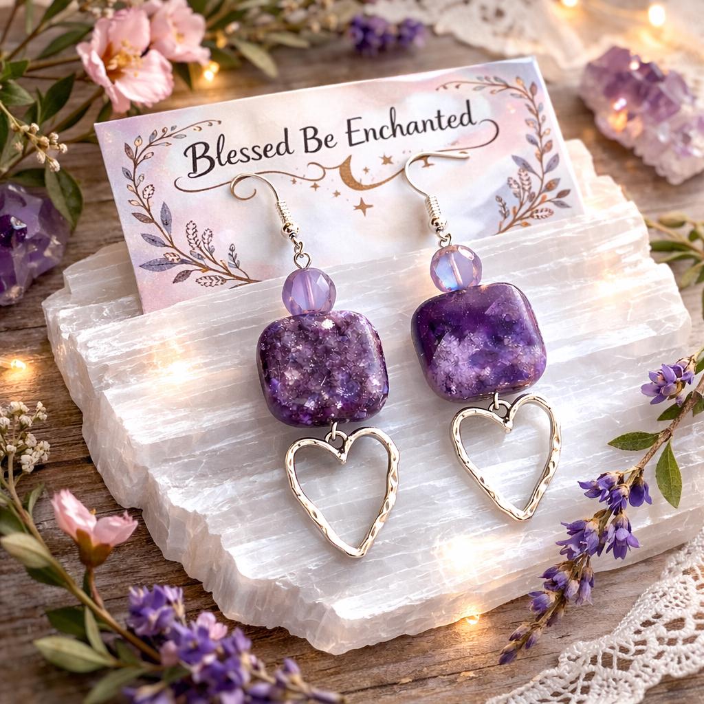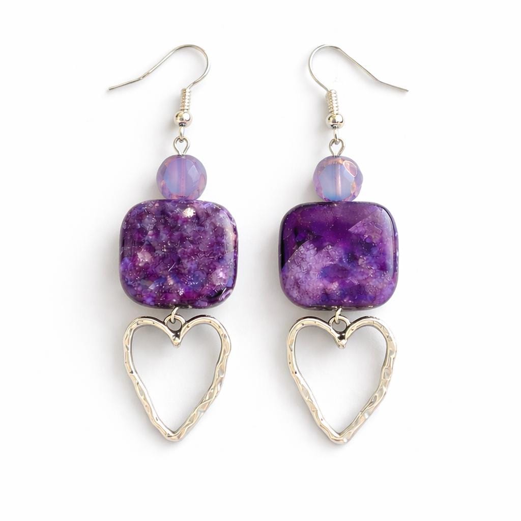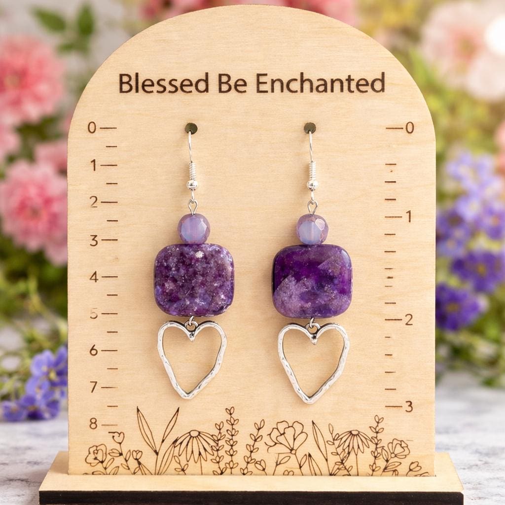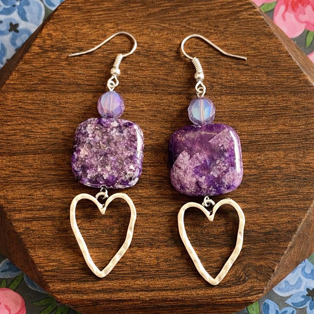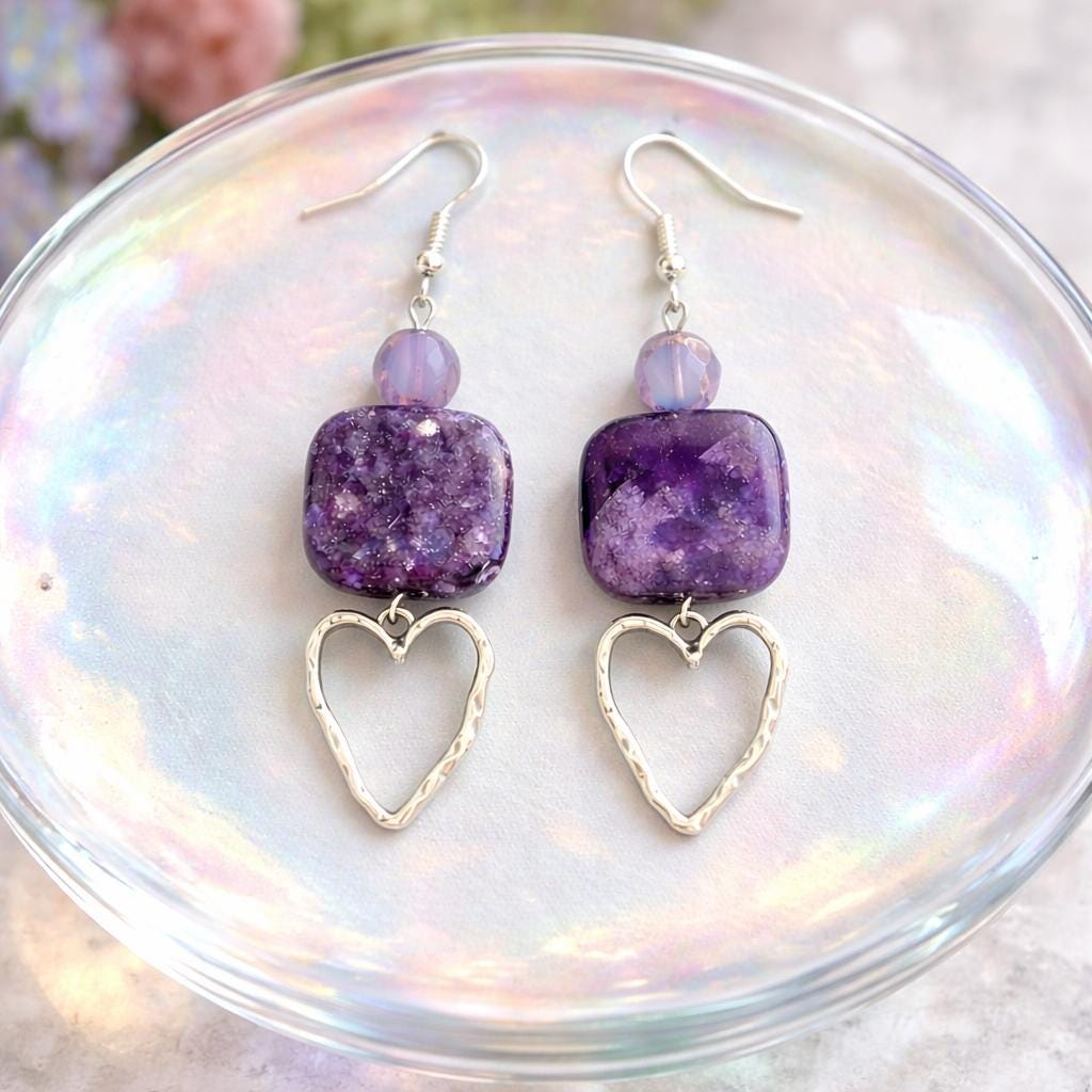 These elegant gemstone earrings feature square amethyst gemstones paired with shimmering Czech glass table-cut beads in soft purple tones! Finished with silver open heart charms, they symbolize openness, healing, and soulful love.