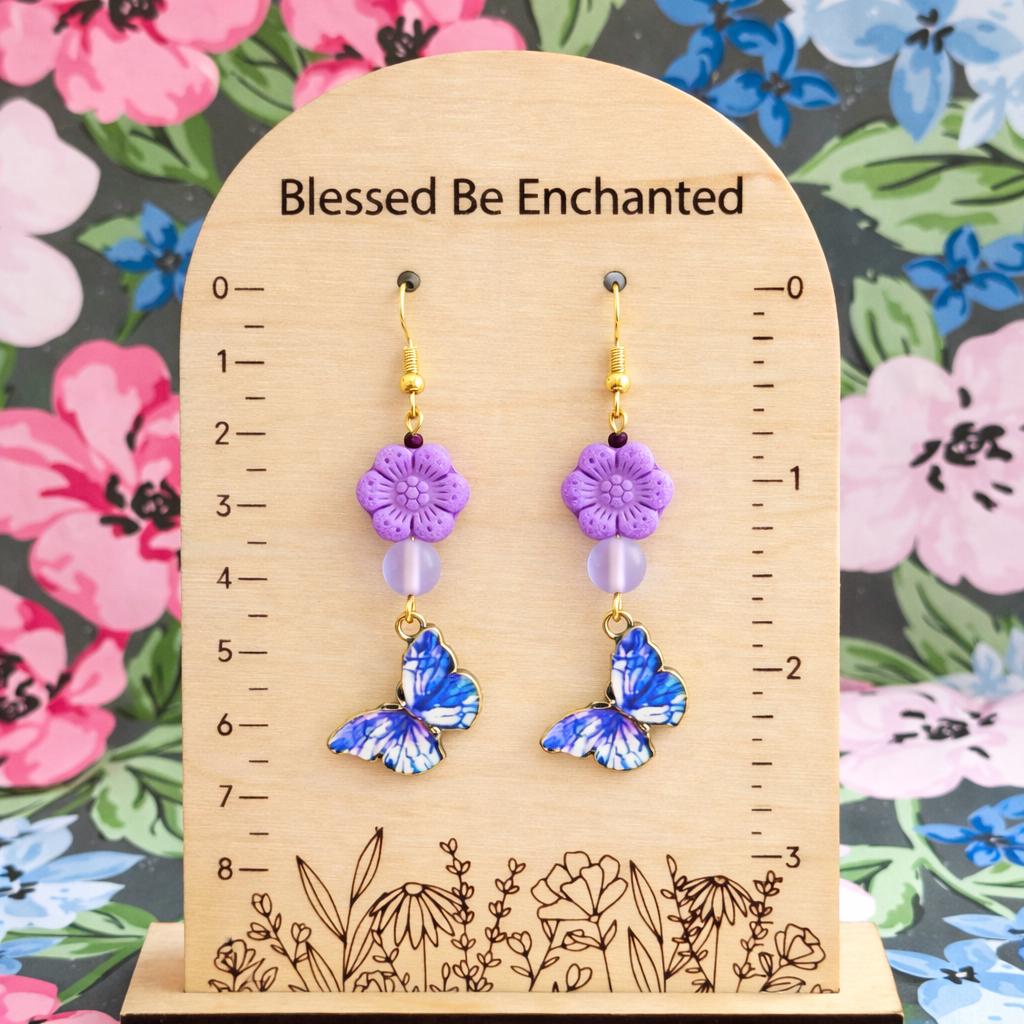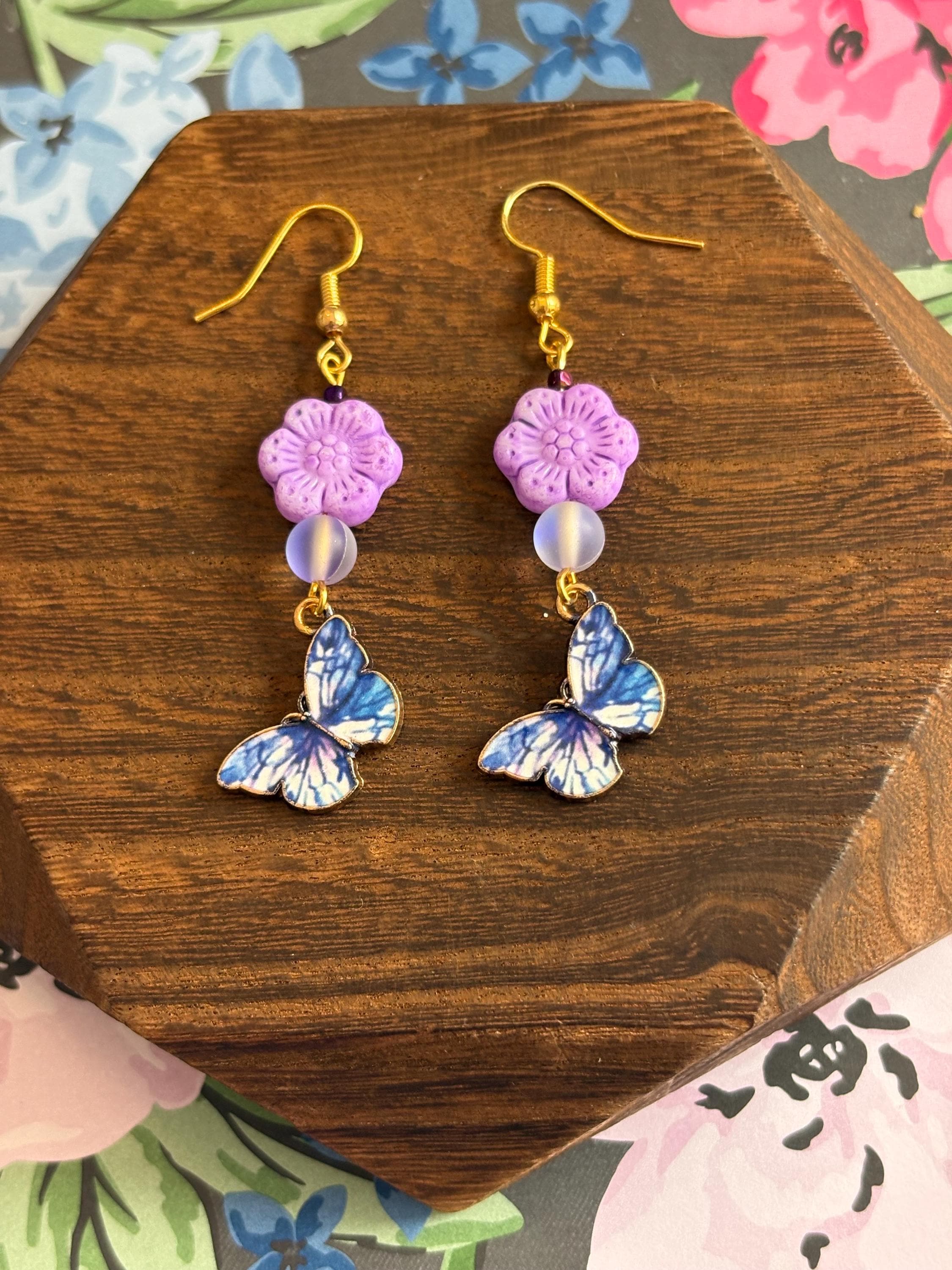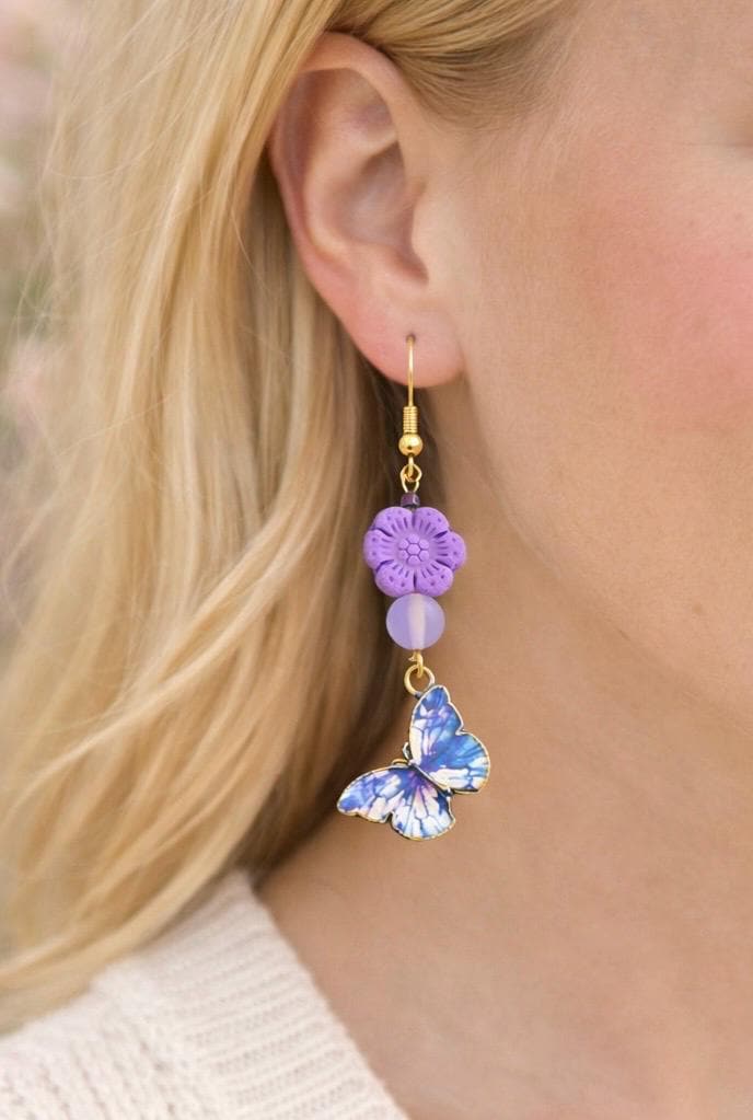 Lavender Winged Whispers are a romantic celebration of blooming hearts and gentle transformation! A soft violet Czech glass flower rests above luminous mystic aura quartz and grounding purple hematite, finished with delicate blue enamel butterfly charms that seem ready to take flight.