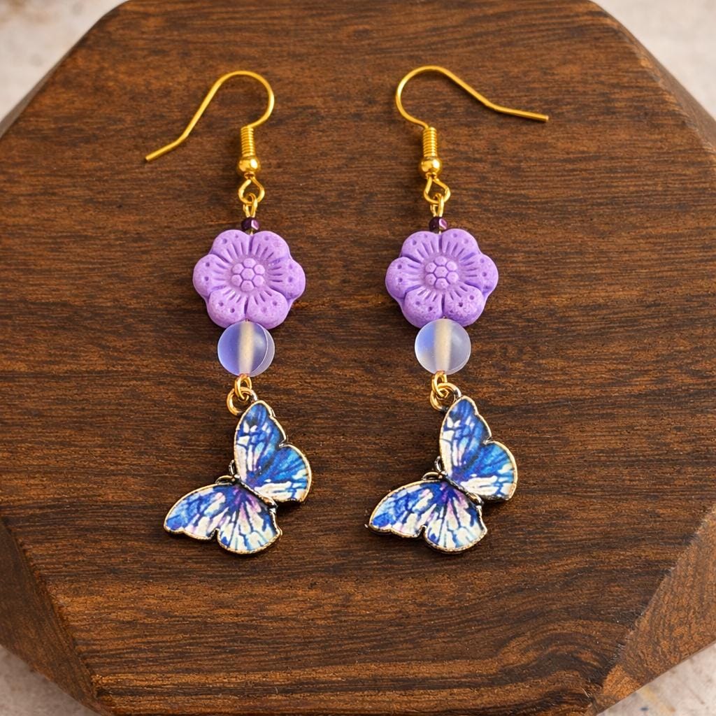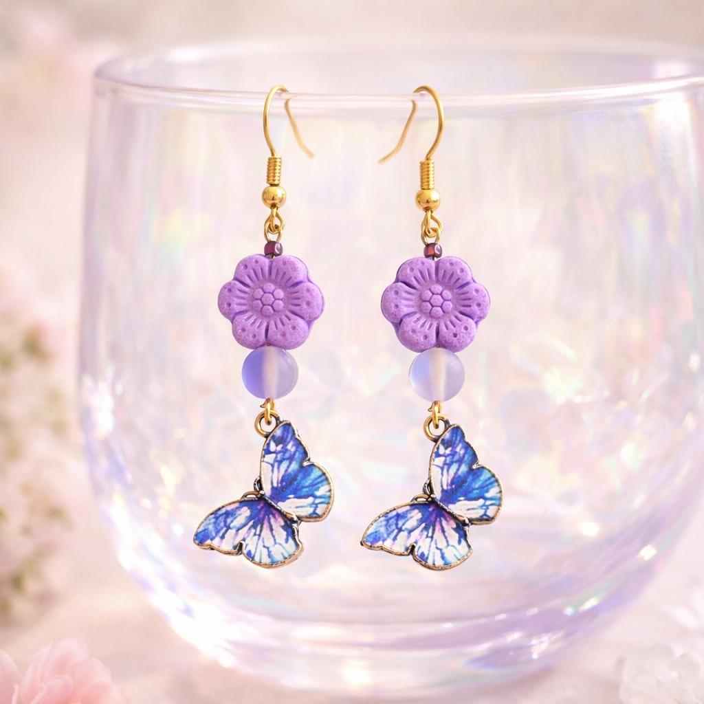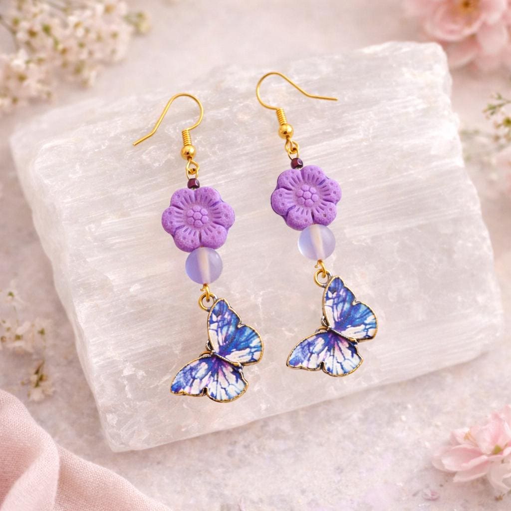 Lavender Butterfly Earrings – Purple Hematite, Aura Quartz, Floral Dangle – Hypoallergenic Stainless Steel