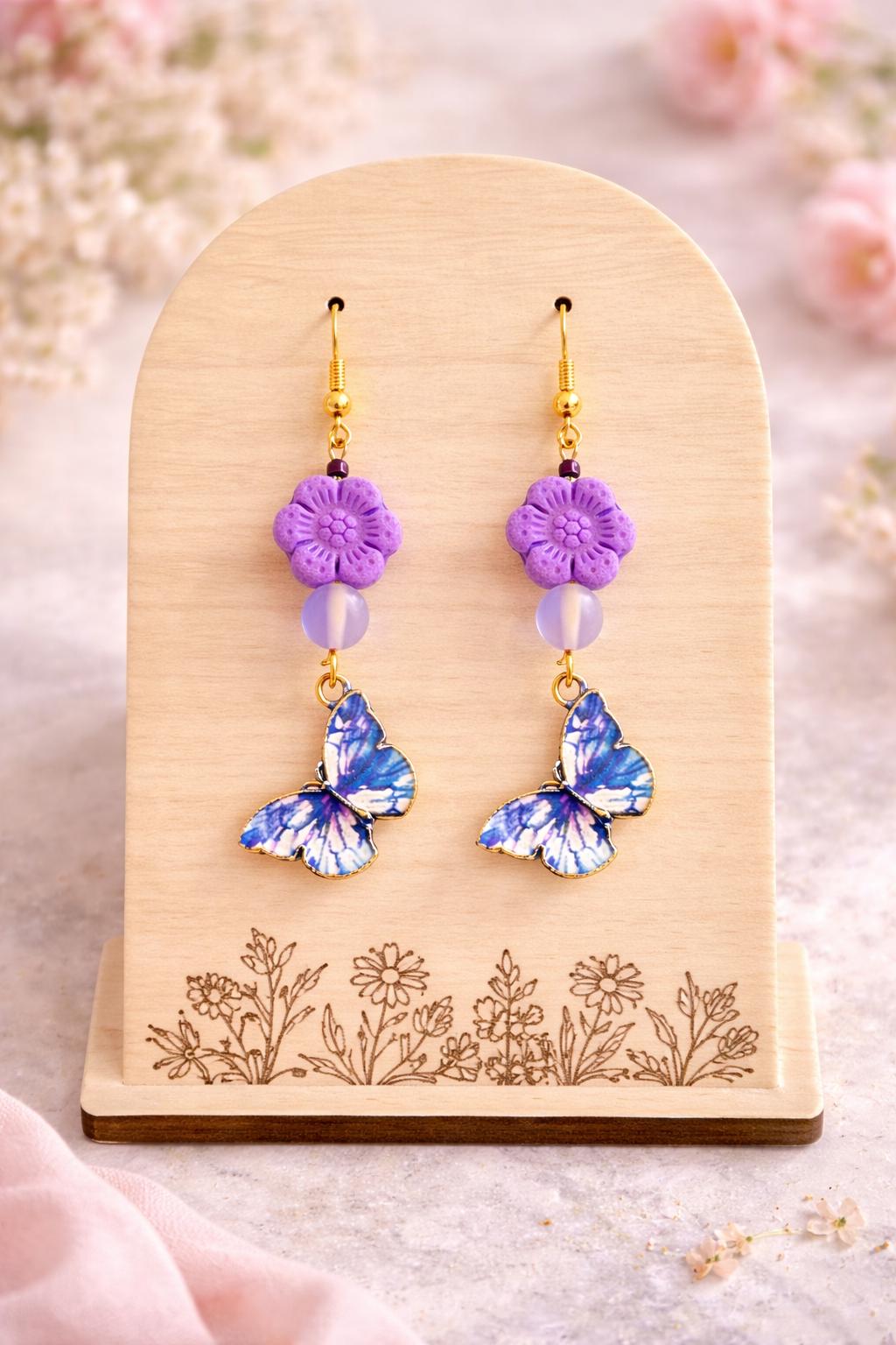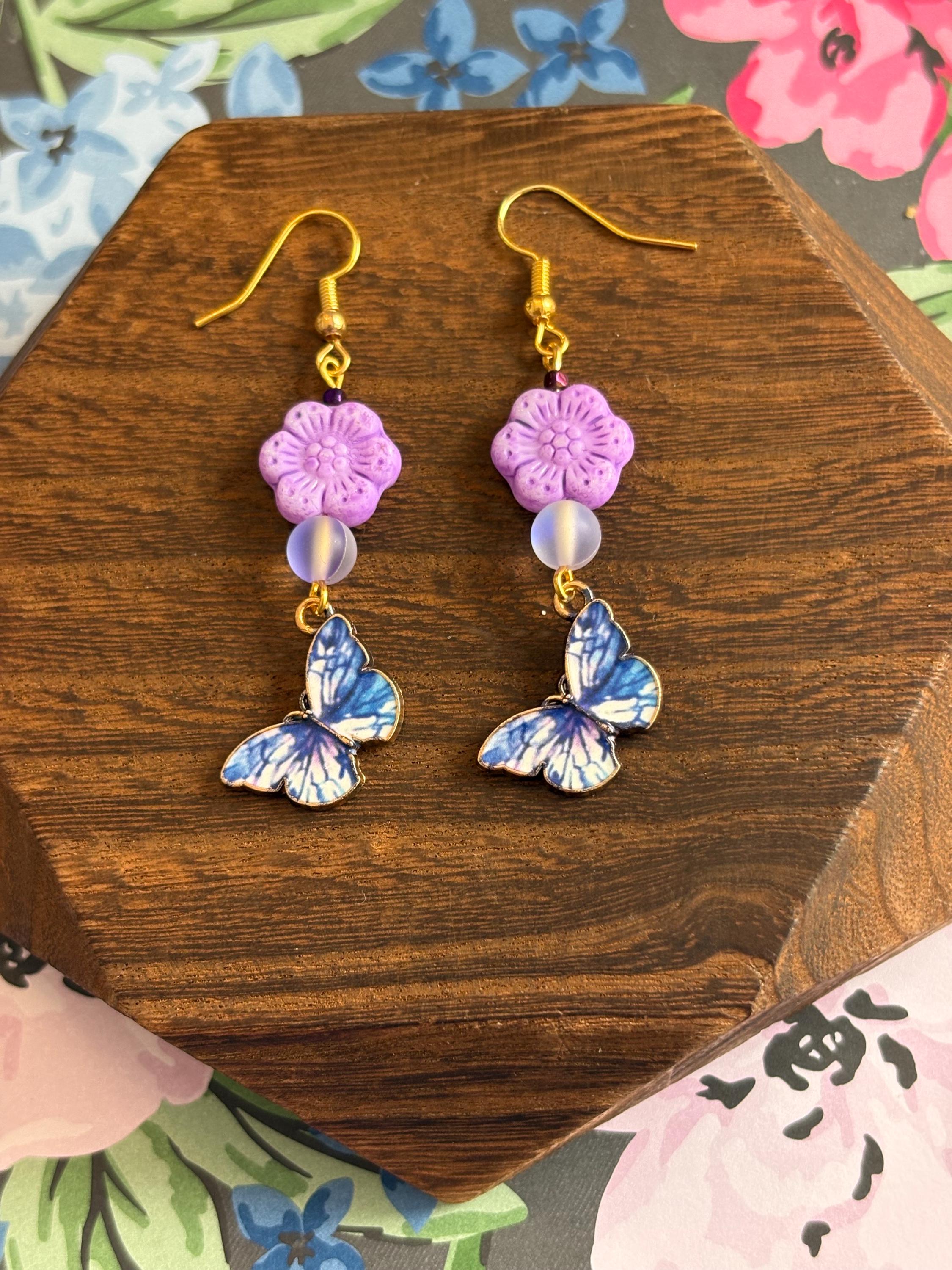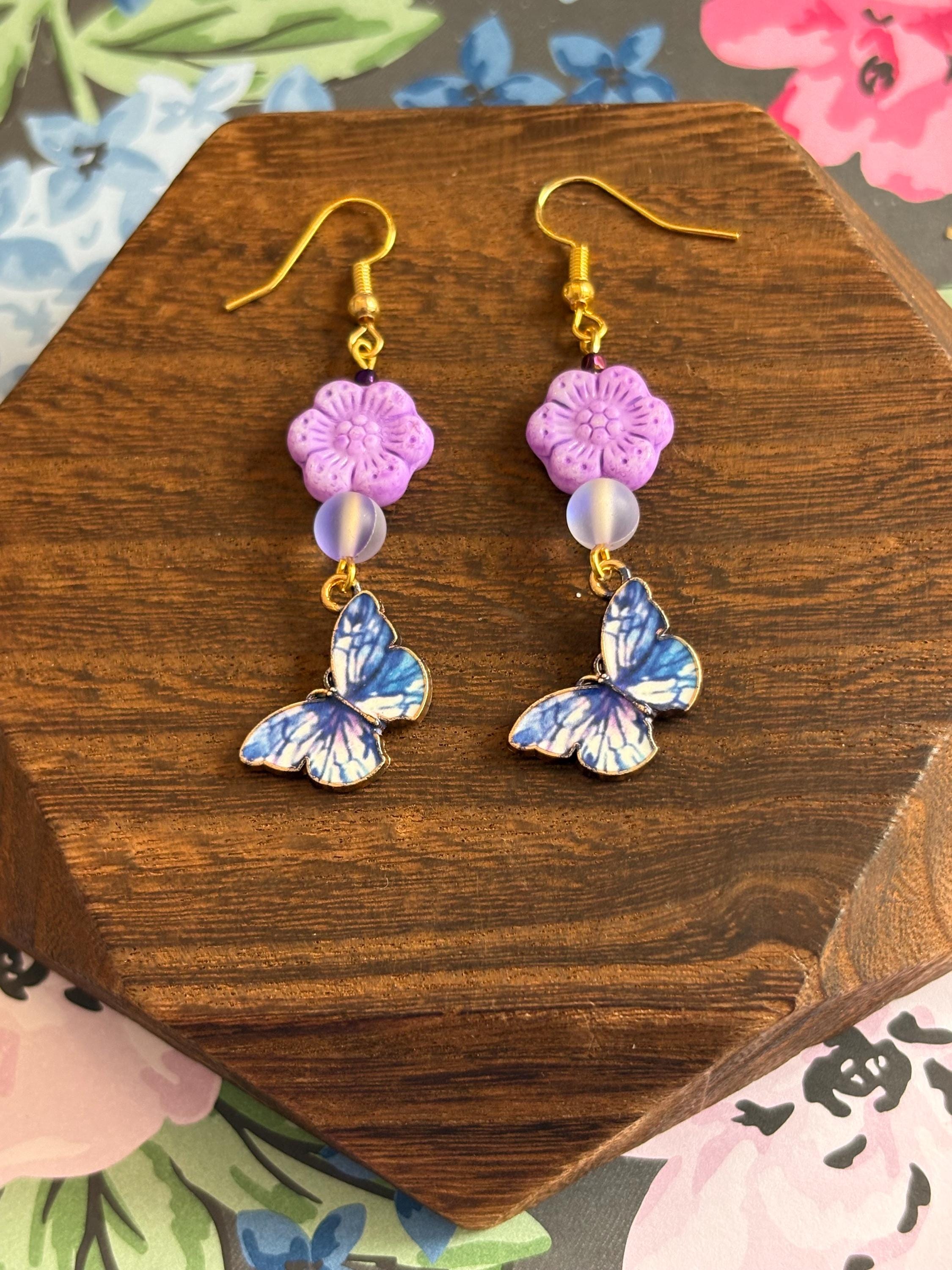 Lavender Butterfly Earrings – Purple Hematite, Aura Quartz, Floral Dangle – Hypoallergenic Stainless Steel