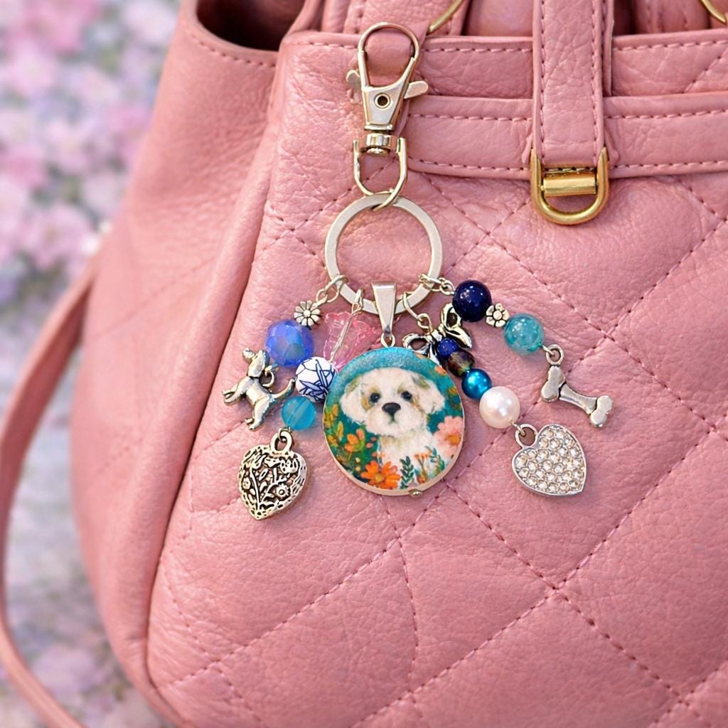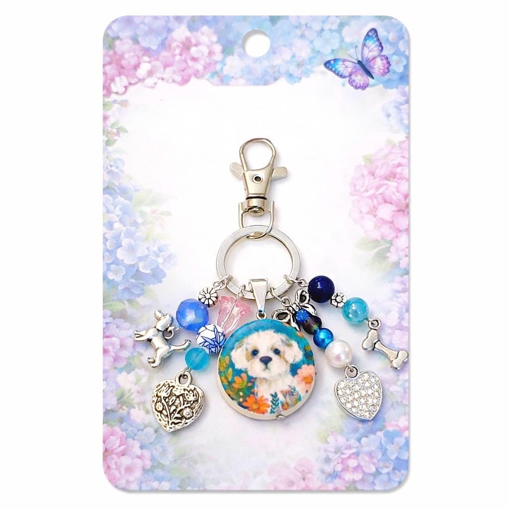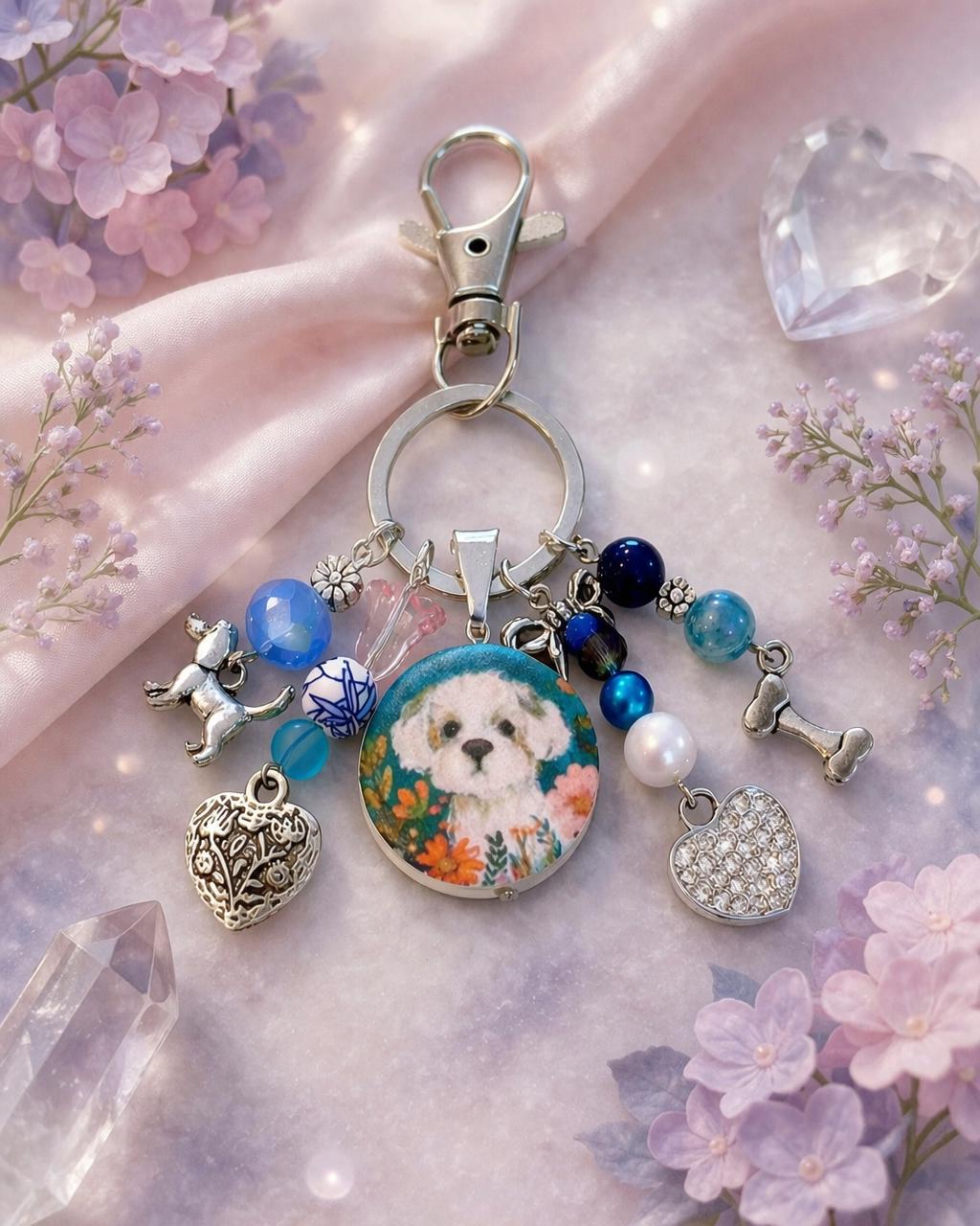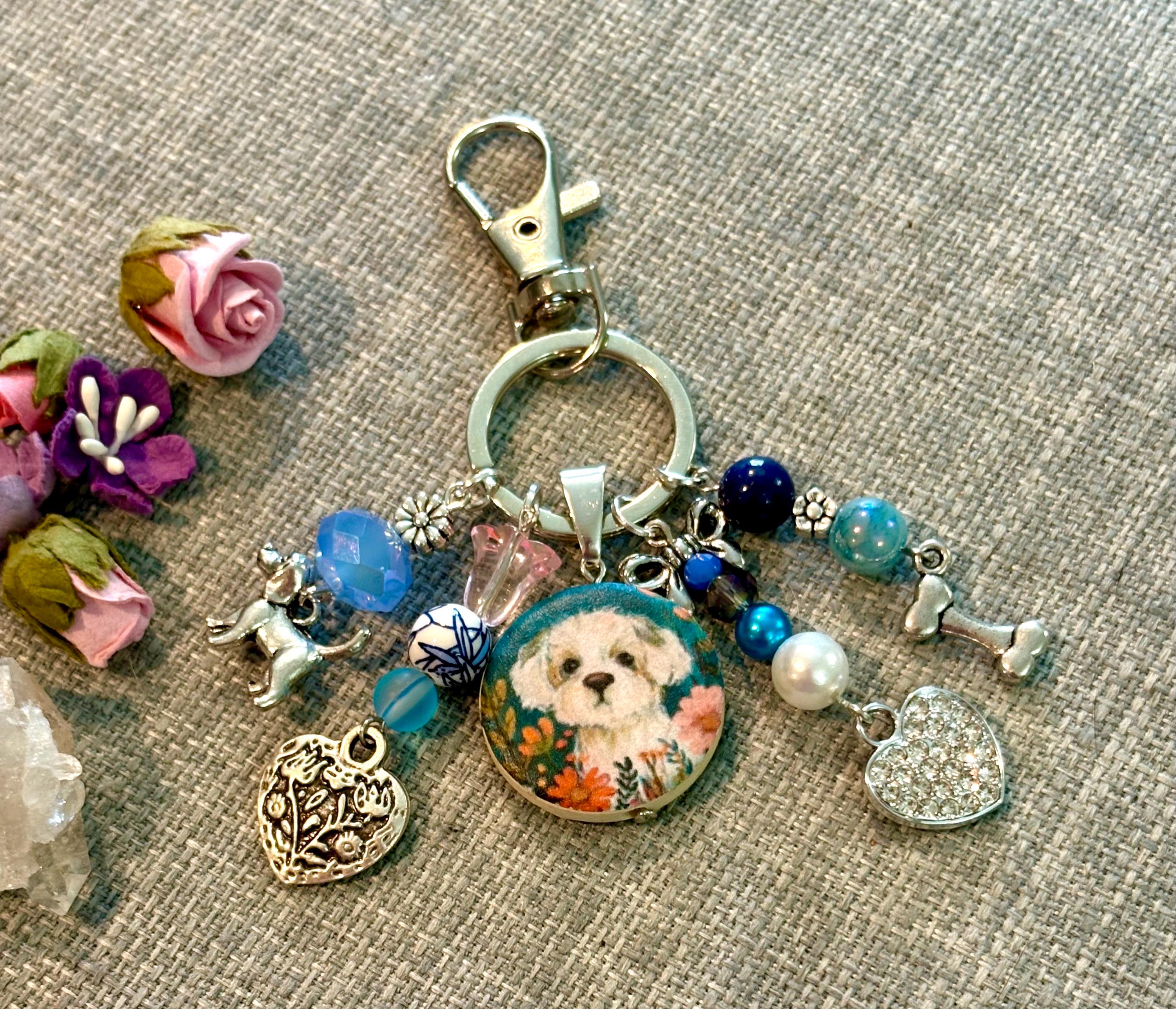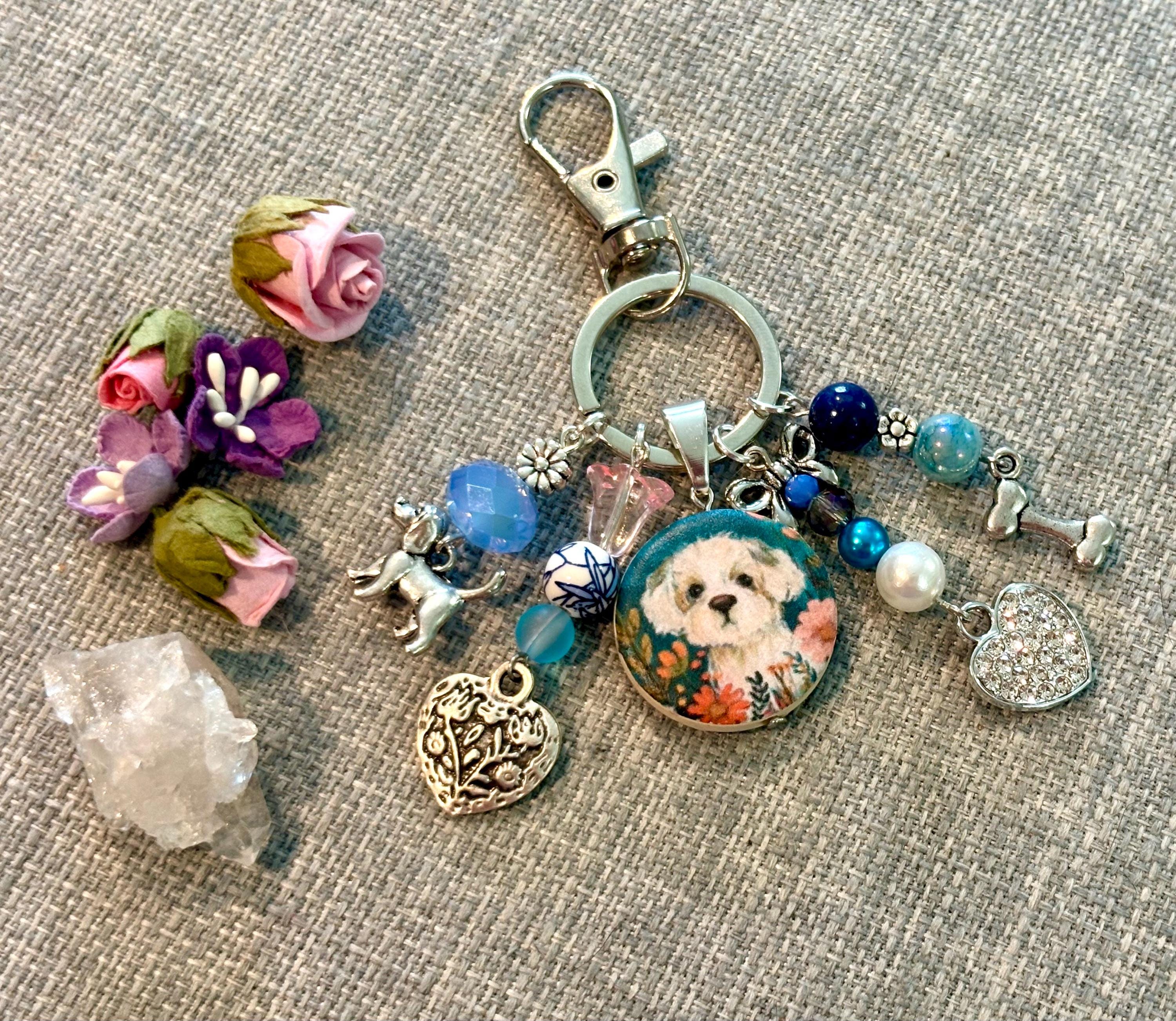 This whimsical, heartwarming purse charm/keychain is lovingly handcrafted with dreamy shades of blue, periwinkle, and peacock tones, centered around an adorable artisan wood bead puppy surrounded by soft floral beauty.