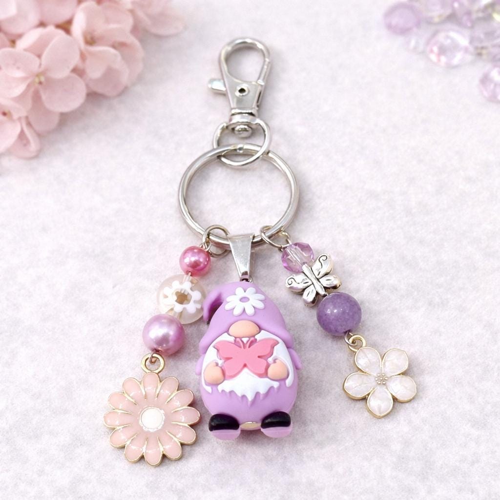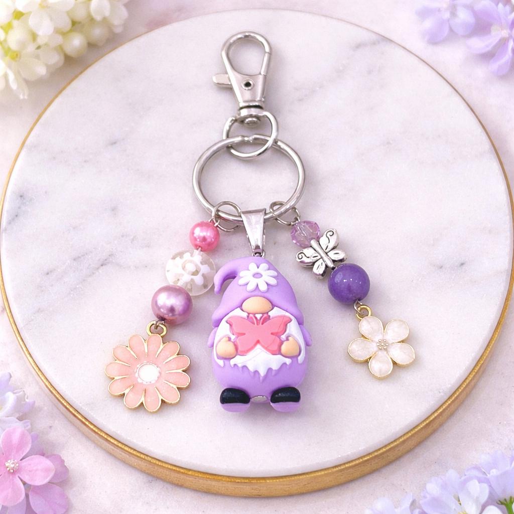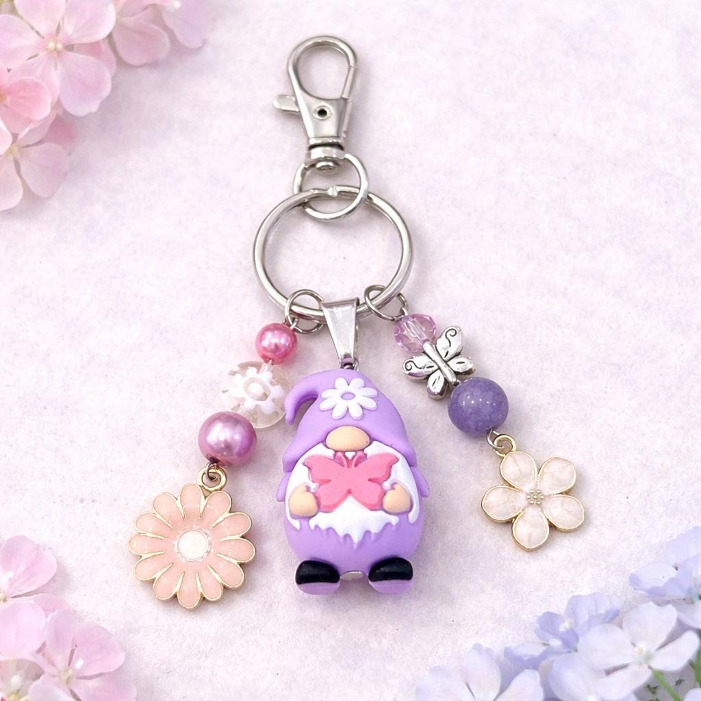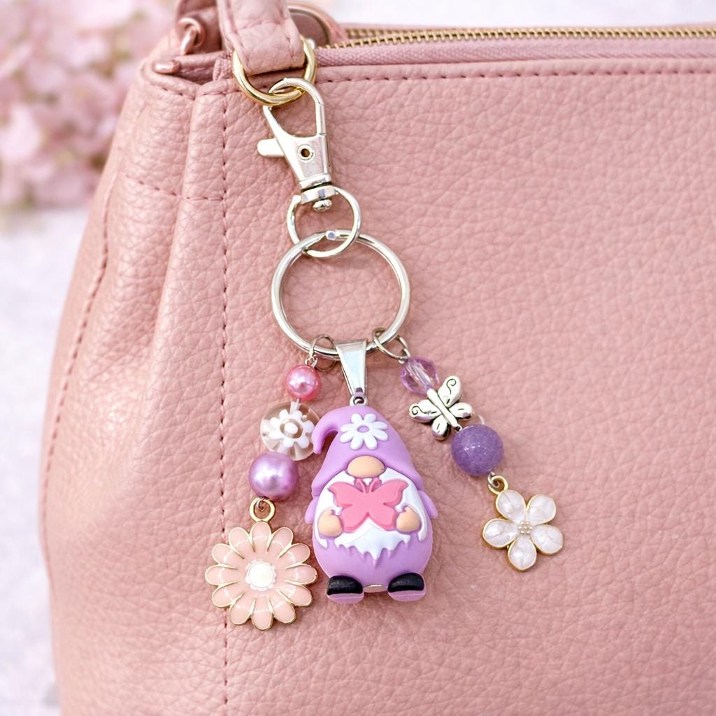 Featuring an adorable silicone gnome in soft lavender tones, this whimsical purse charm/keychain is bursting with playful energy and dreamy detail. Surrounded by shimmering beads, delicate flowers, and a sweet butterfly accent, this piece feels like it stepped right out of a fairytale garden.