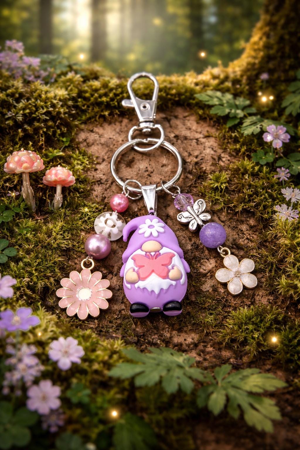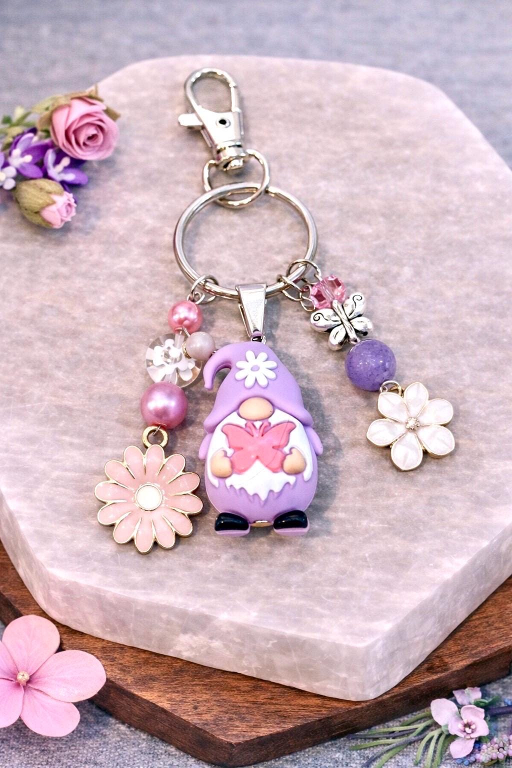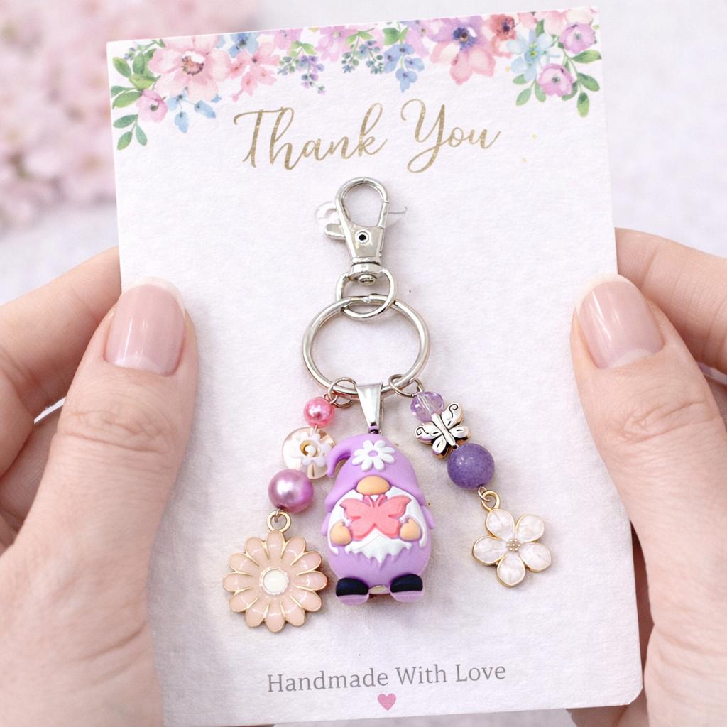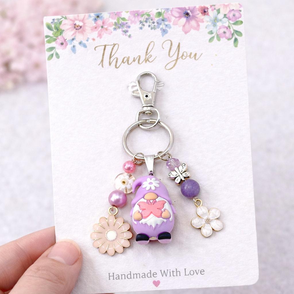Featuring an adorable silicone gnome in soft lavender tones, this whimsical purse charm/keychain is bursting with playful energy and dreamy detail. Surrounded by shimmering beads, delicate flowers, and a sweet butterfly accent, this piece feels like it stepped right out of a fairytale garden.