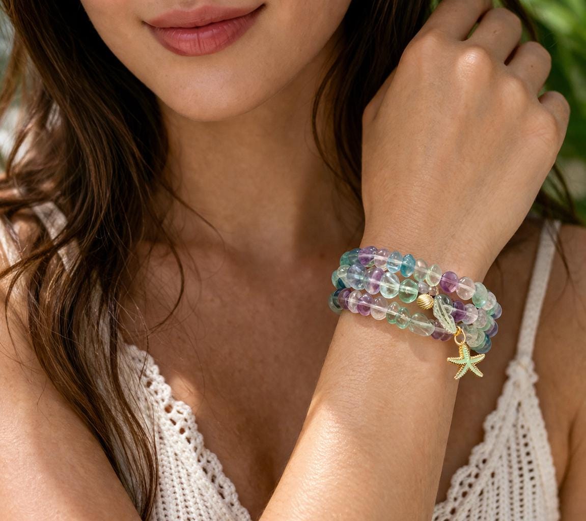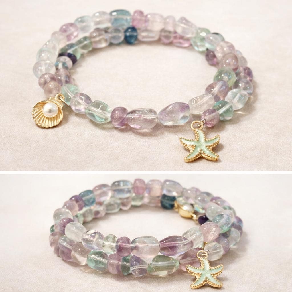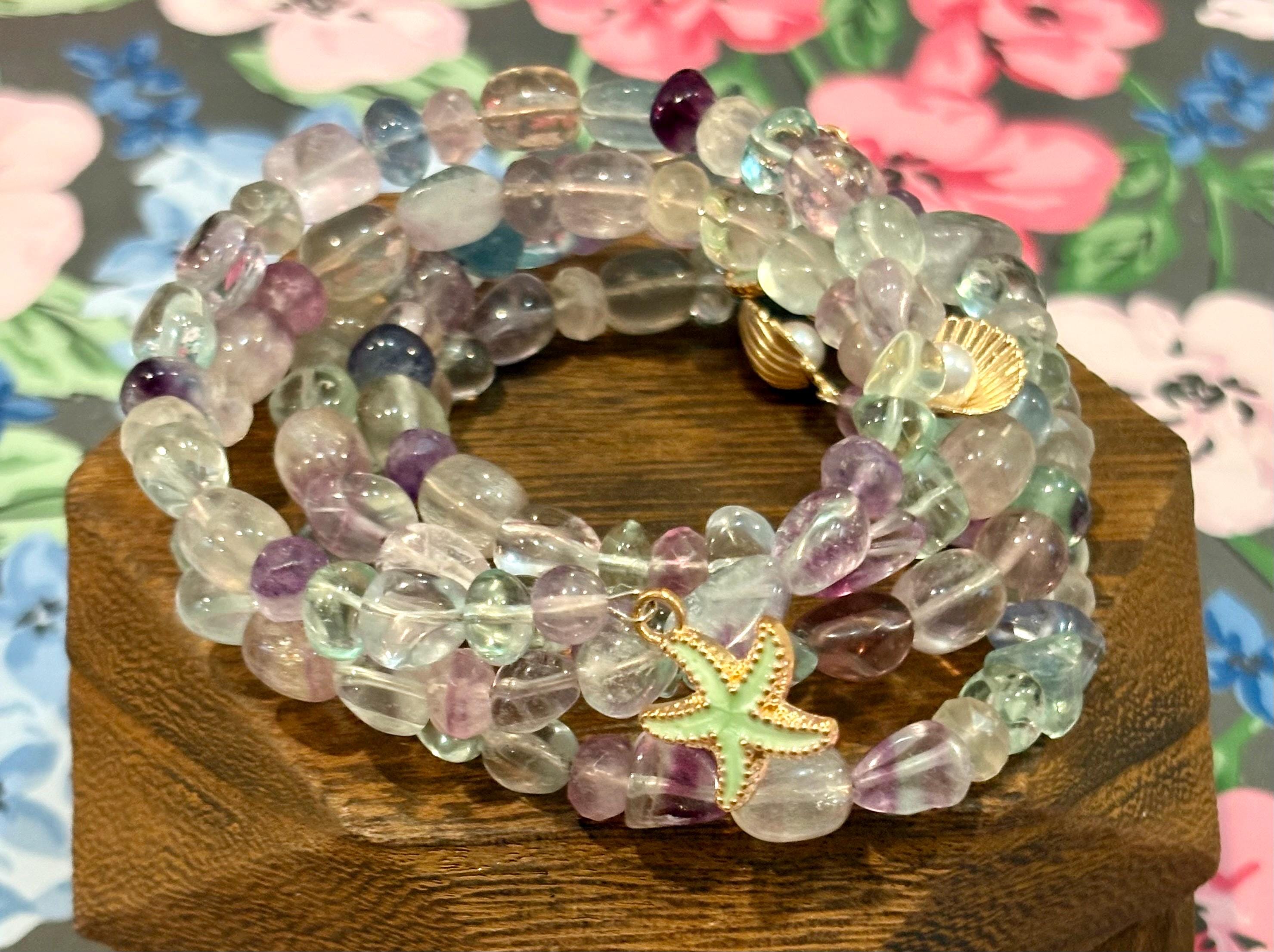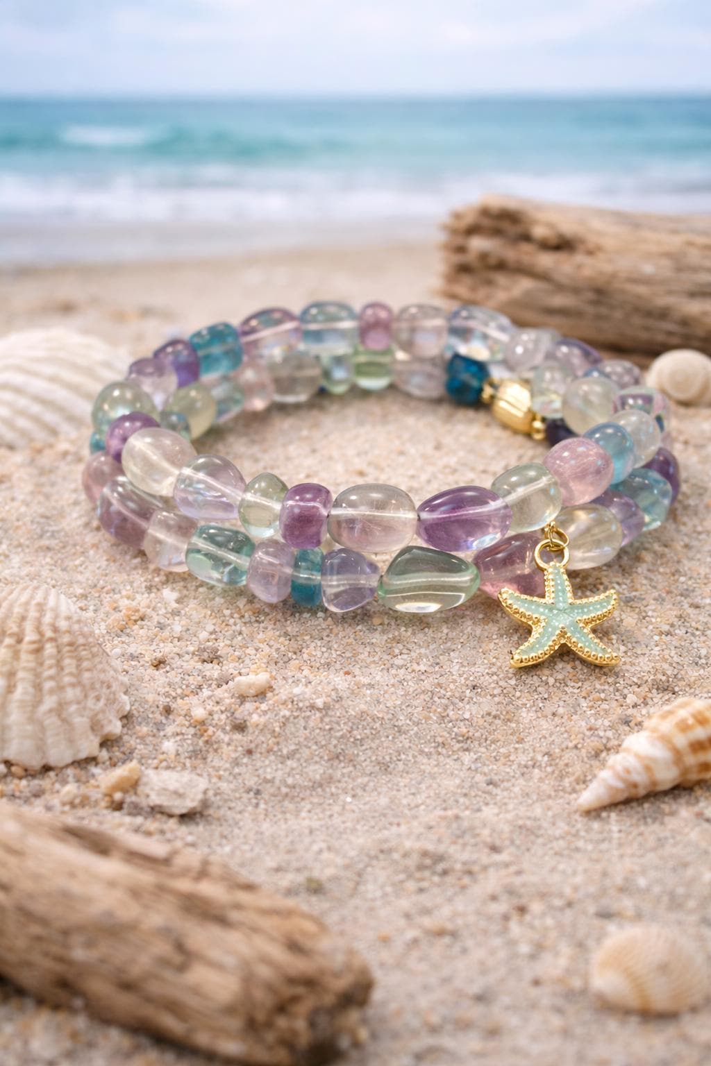 Handcrafted with genuine Fluorite gemstones, this wrap-style bracelet shimmers in calming hues of sea glass blues, soft lavender, and gentle greens. Two delicate enamel charms complete the coastal story β a mint green starfish and a gold open clamshell holding a luminous pearl, symbolizing hidden treasures and inner beauty.