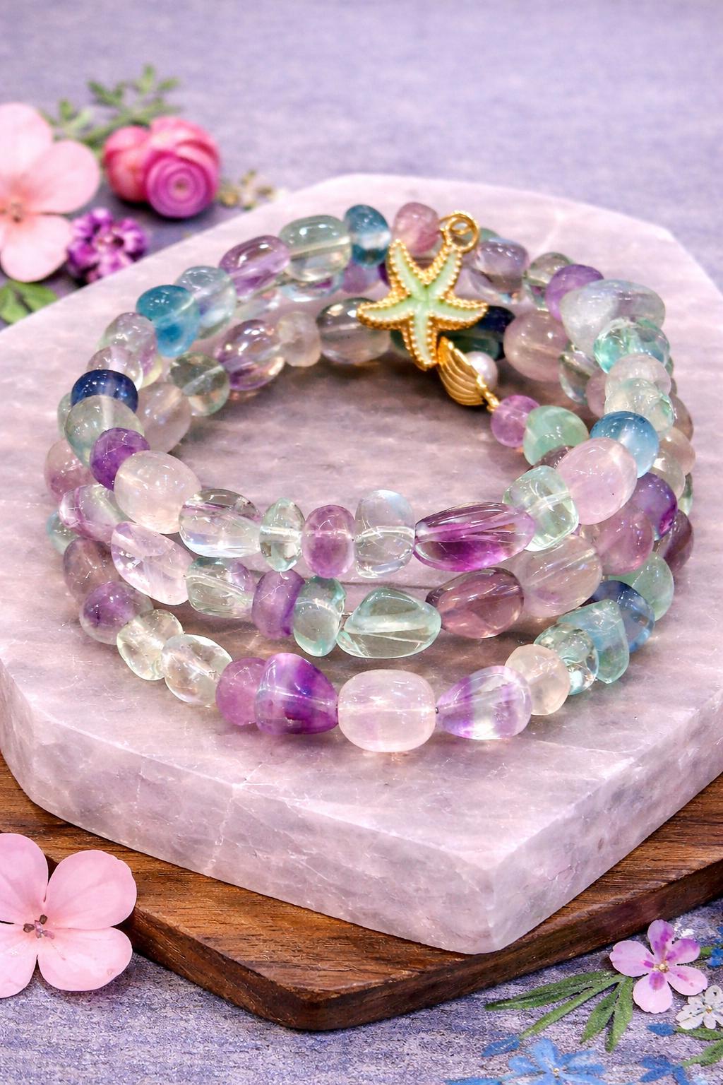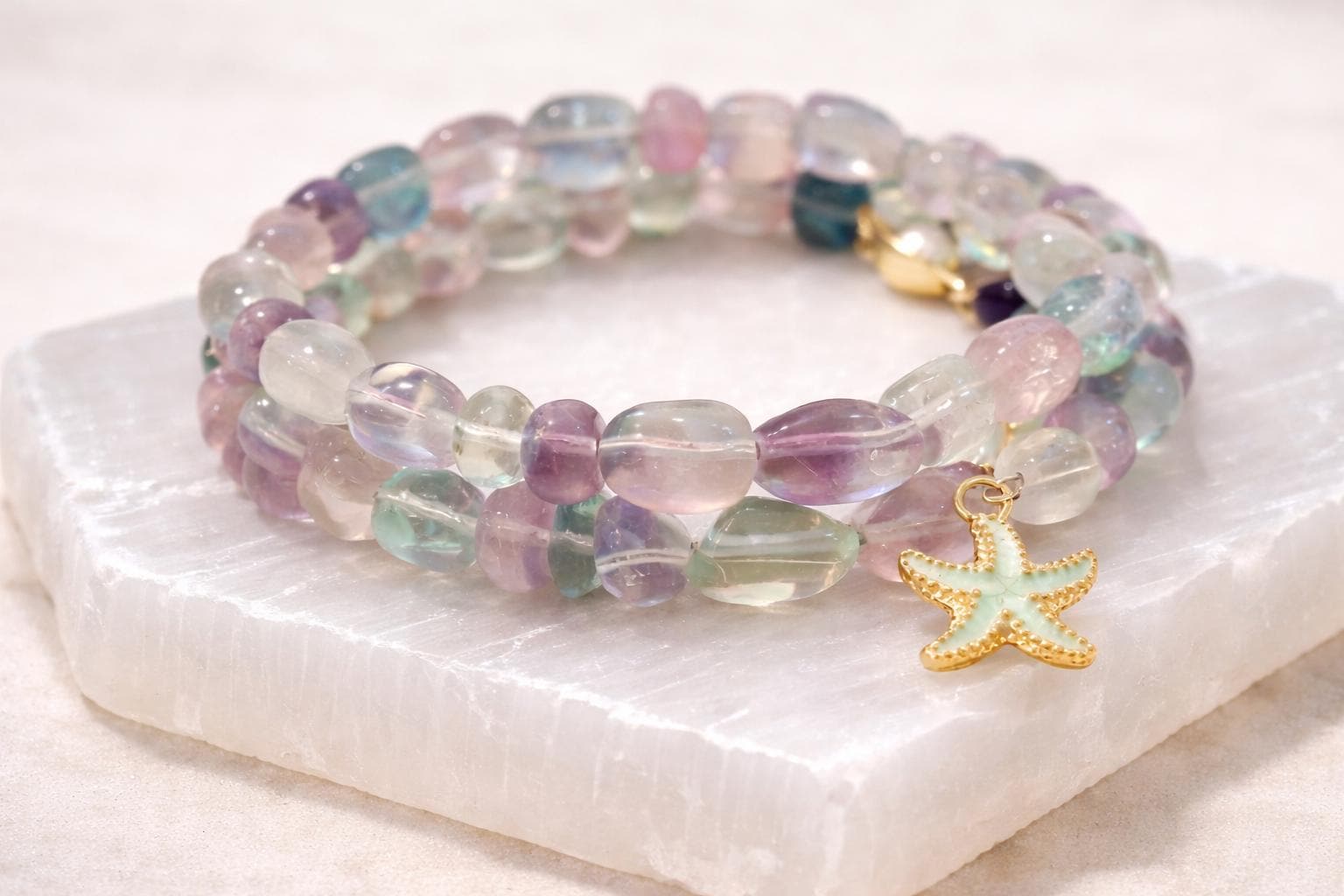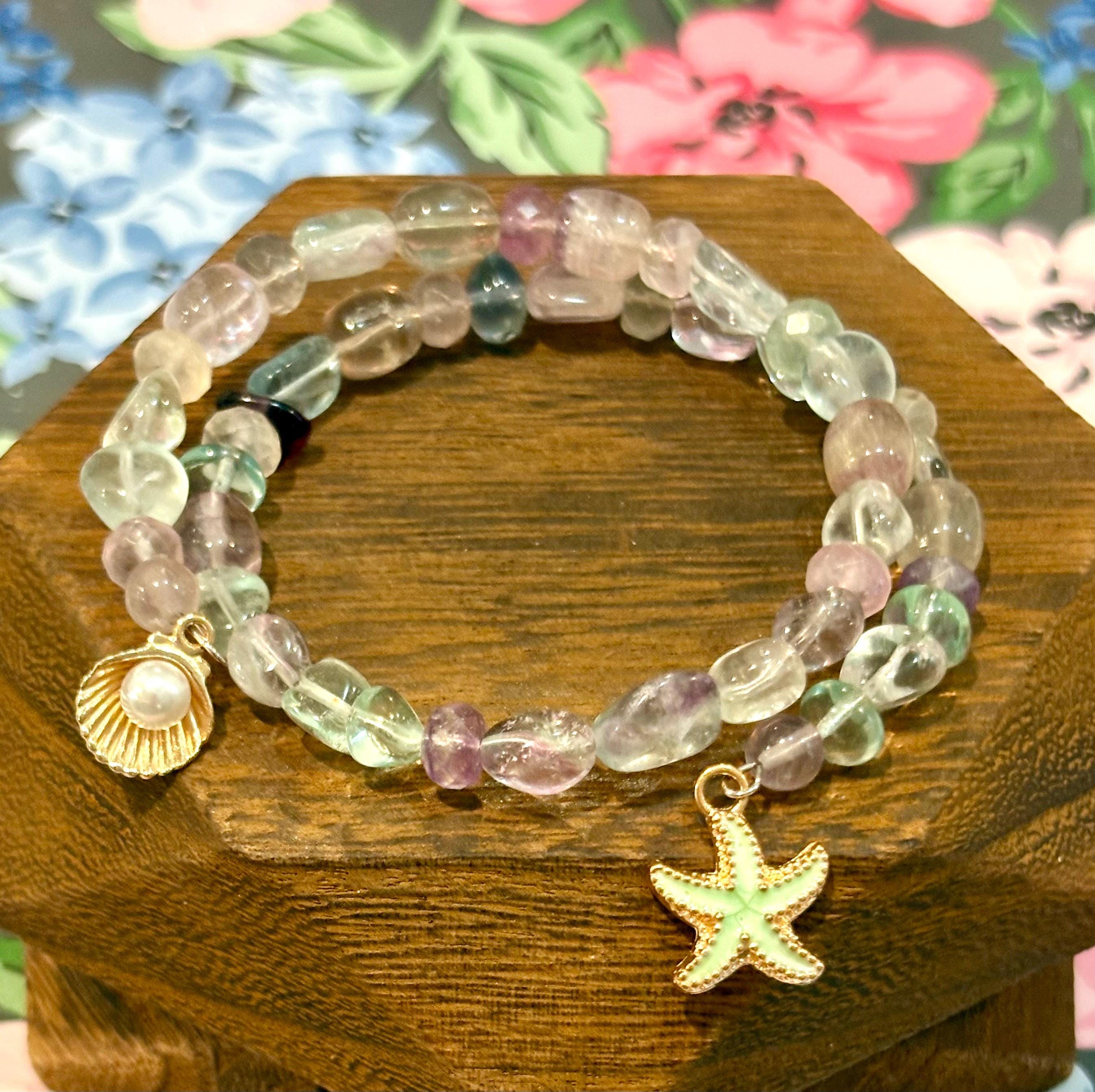 Handcrafted with genuine Fluorite gemstones, this wrap-style bracelet shimmers in calming hues of sea glass blues, soft lavender, and gentle greens. Two delicate enamel charms complete the coastal story β a mint green starfish and a gold open clamshell holding a luminous pearl, symbolizing hidden treasures and inner beauty.