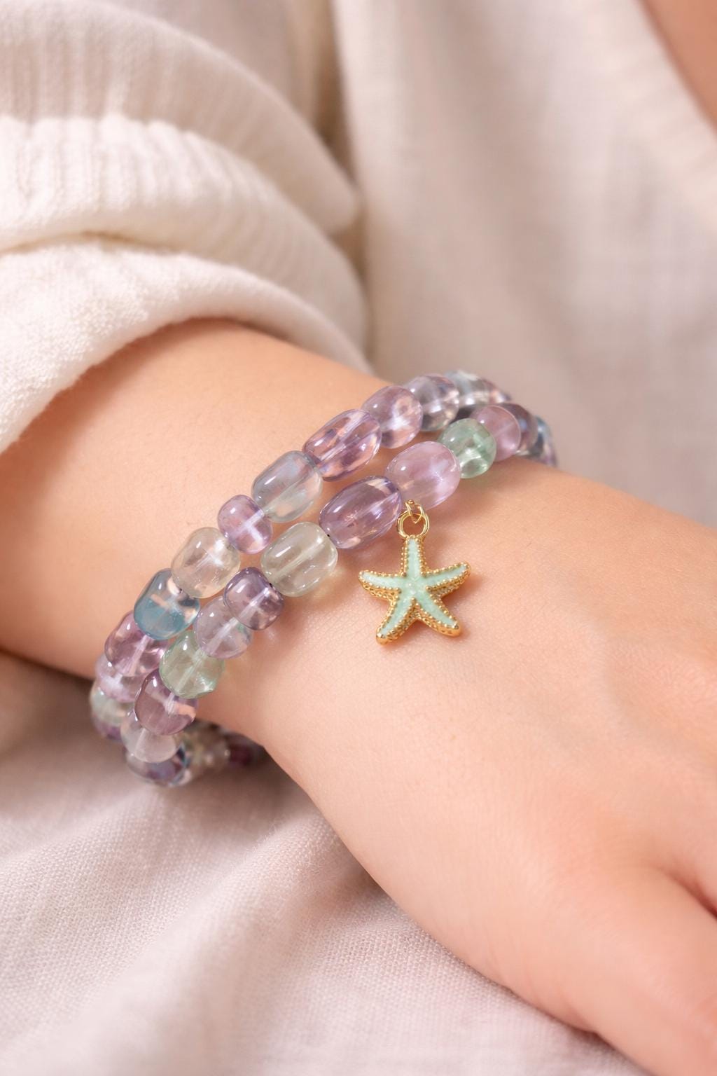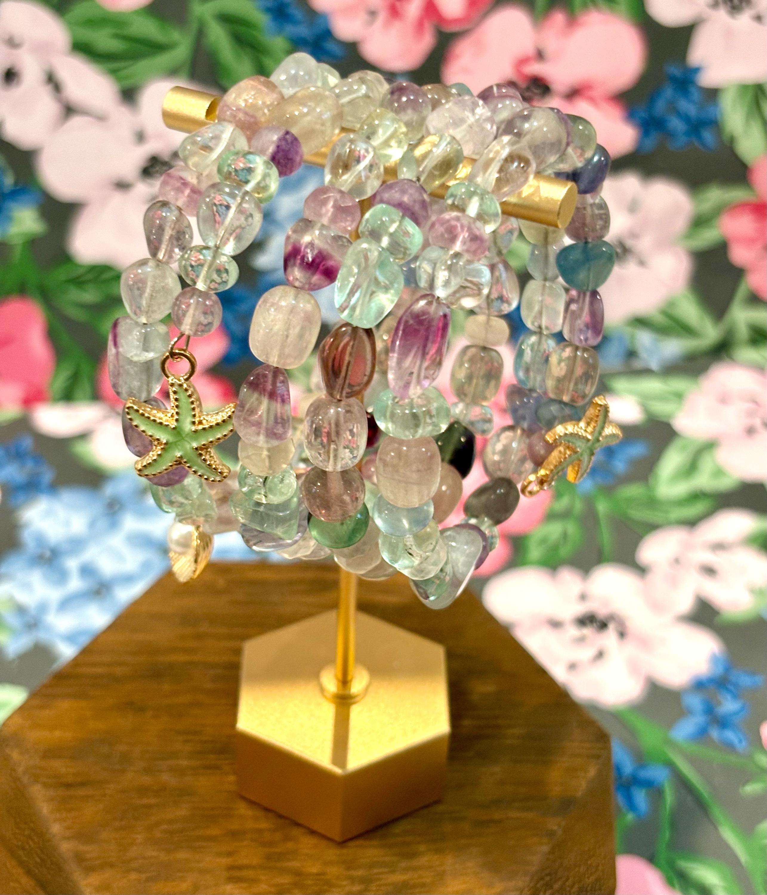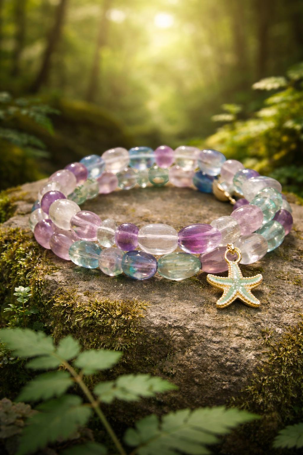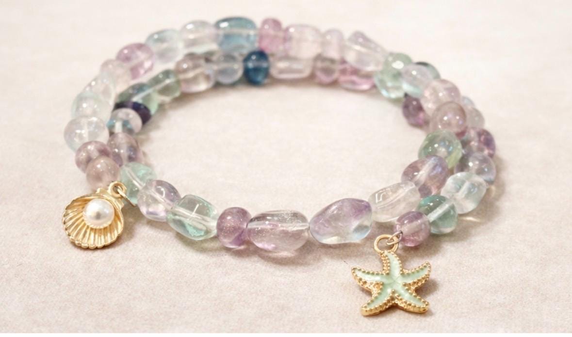 Handcrafted with genuine Fluorite gemstones, this wrap-style bracelet shimmers in calming hues of sea glass blues, soft lavender, and gentle greens. Two delicate enamel charms complete the coastal story β a mint green starfish and a gold open clamshell holding a luminous pearl, symbolizing hidden treasures and inner beauty.