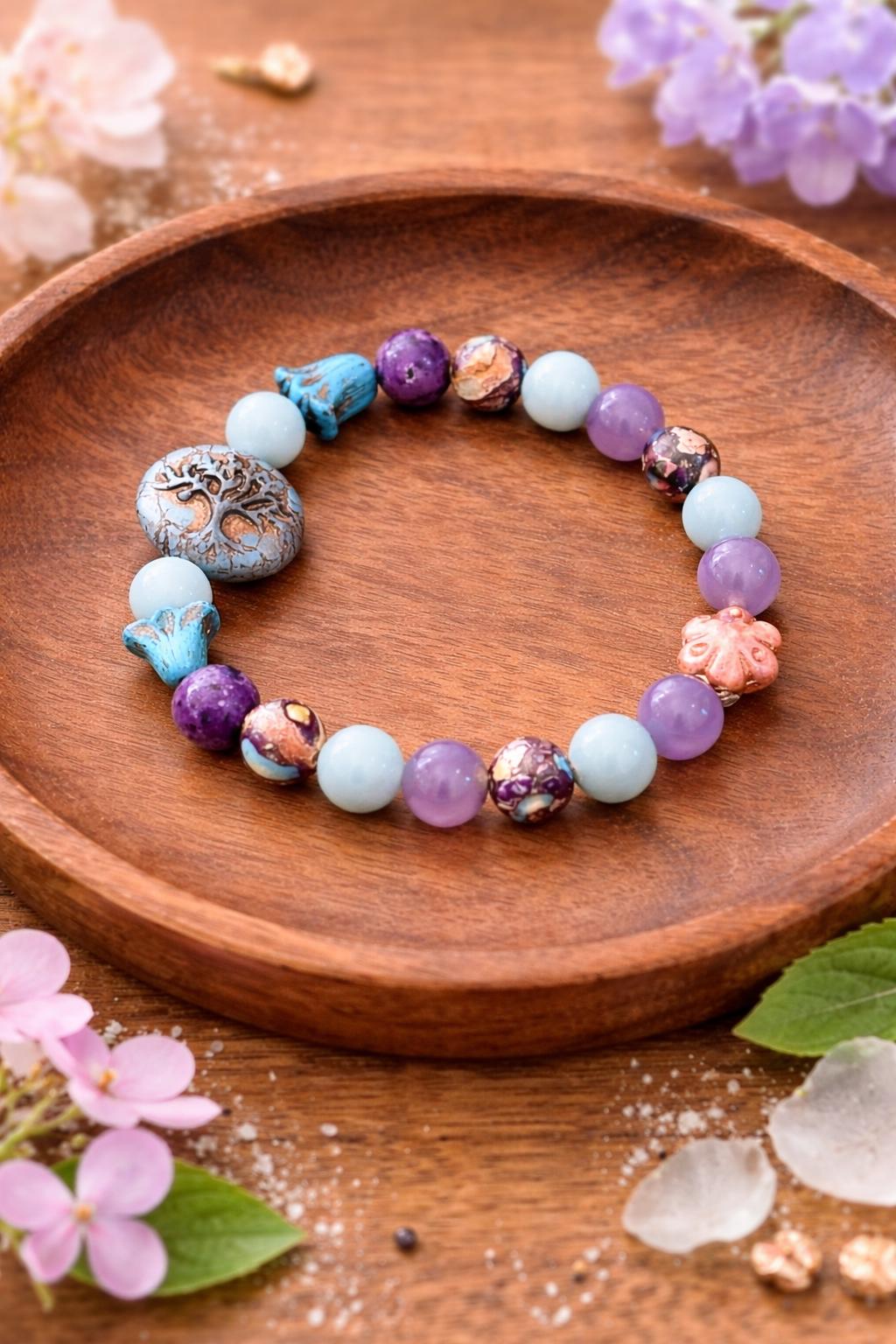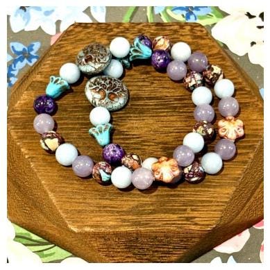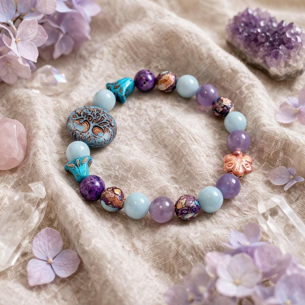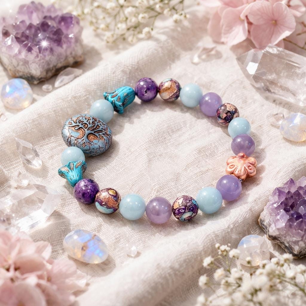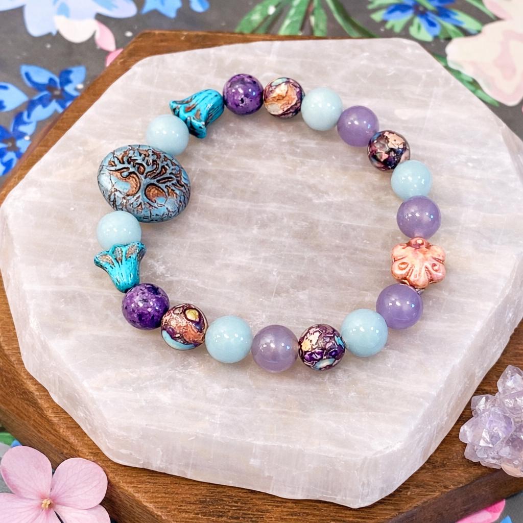 Bella Soul Bloom is a softly powerful bracelet created to honor inner peace, emotional balance, and soulful connection! With calming blues, dreamy purples, and grounding earth tones, this piece blends celestial calm with rooted strength — a wearable reminder to stay gentle with yourself while growing strong.